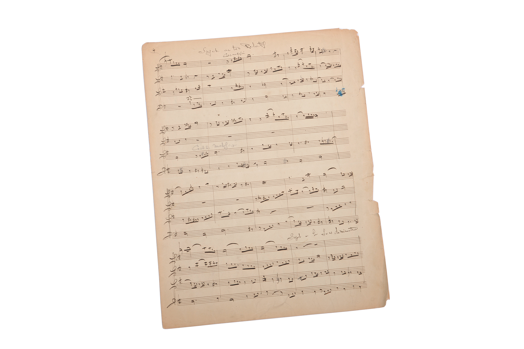 Claude DEBUSSY (1862-1918). Manuscrit musical autographe partiel d'une fugue « Sujet au ton relatif ». 1882, 2 pp. in-folio marquées « 4 » et « 5 », papier Lard Esnault à quatre systèmes de quatre portées, encre noire.