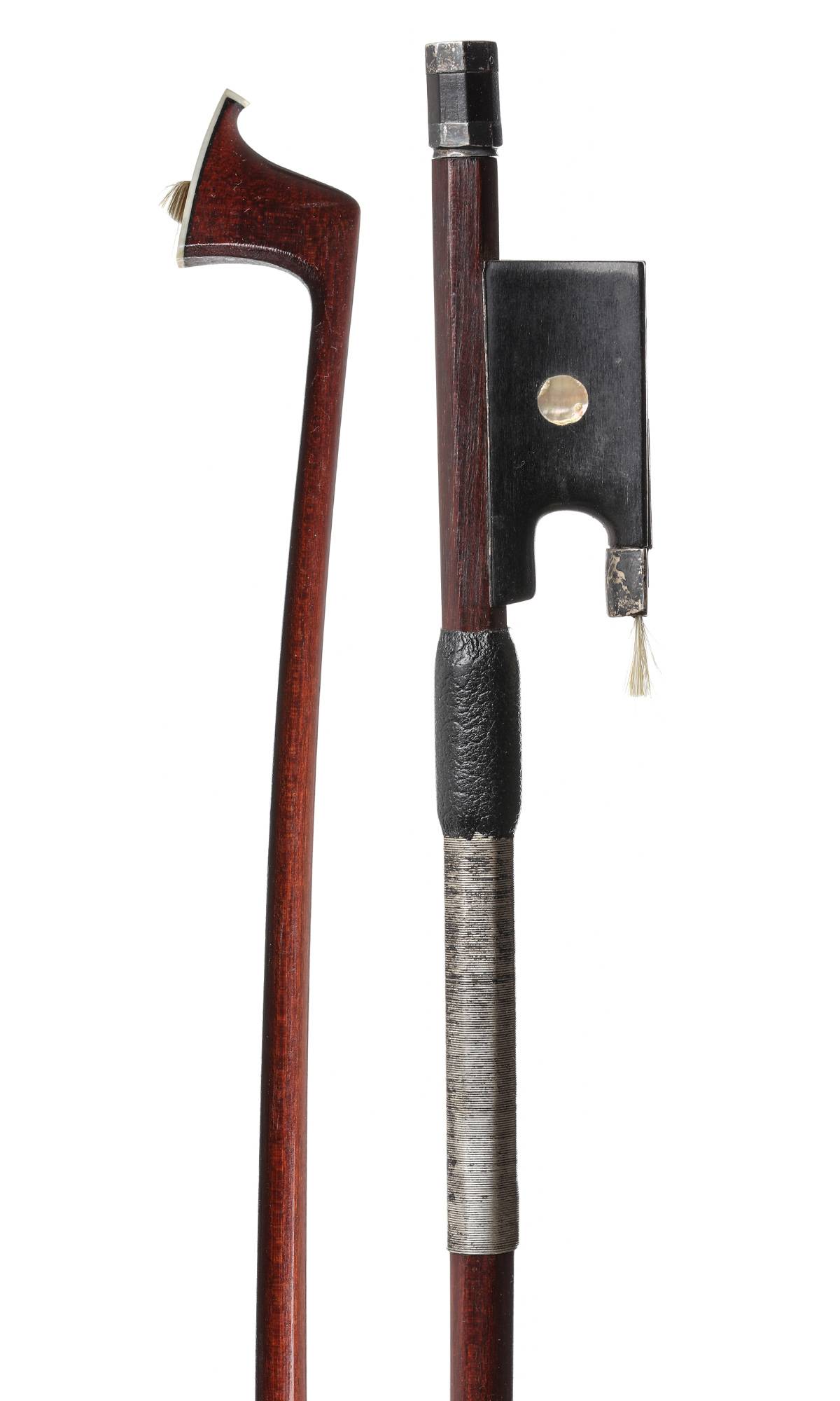 Exceptionnel archet fait en collaboration de LENOBLE et PECCATTE, portant la marque au fer "GAND FRERES". Baguette ronde en beau bois de pernambouc. Hausse ébène avec grains. Recouvrement faisant talon. Monté argent, bouton ébène avec deux virolles argent. Petite cassure à la hausse. 734 mm. 54 g sans mèche, ni garniture.