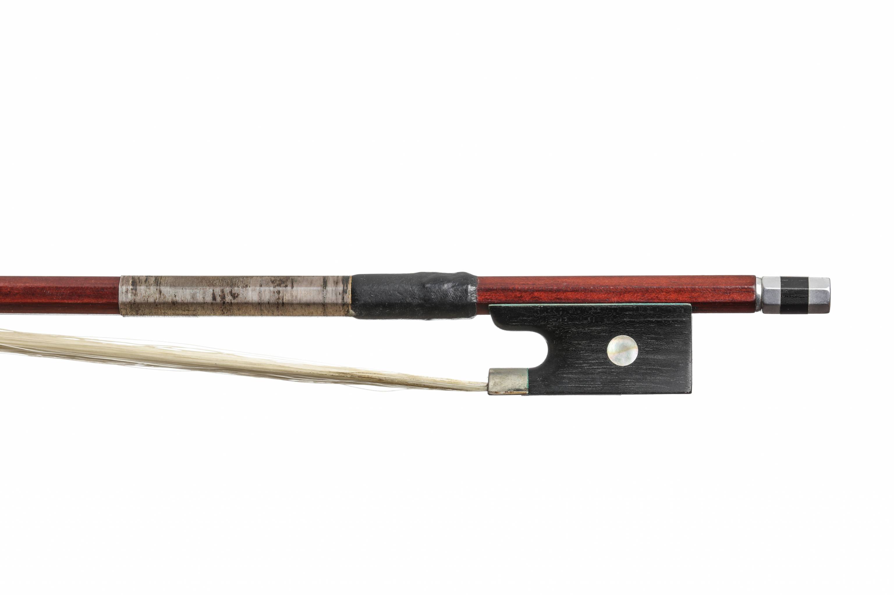 Baguette octogonale en bois de pernambouc. Hausse ébène avec bouton postérieur, monté maillechort. 723 mm. 63 g.