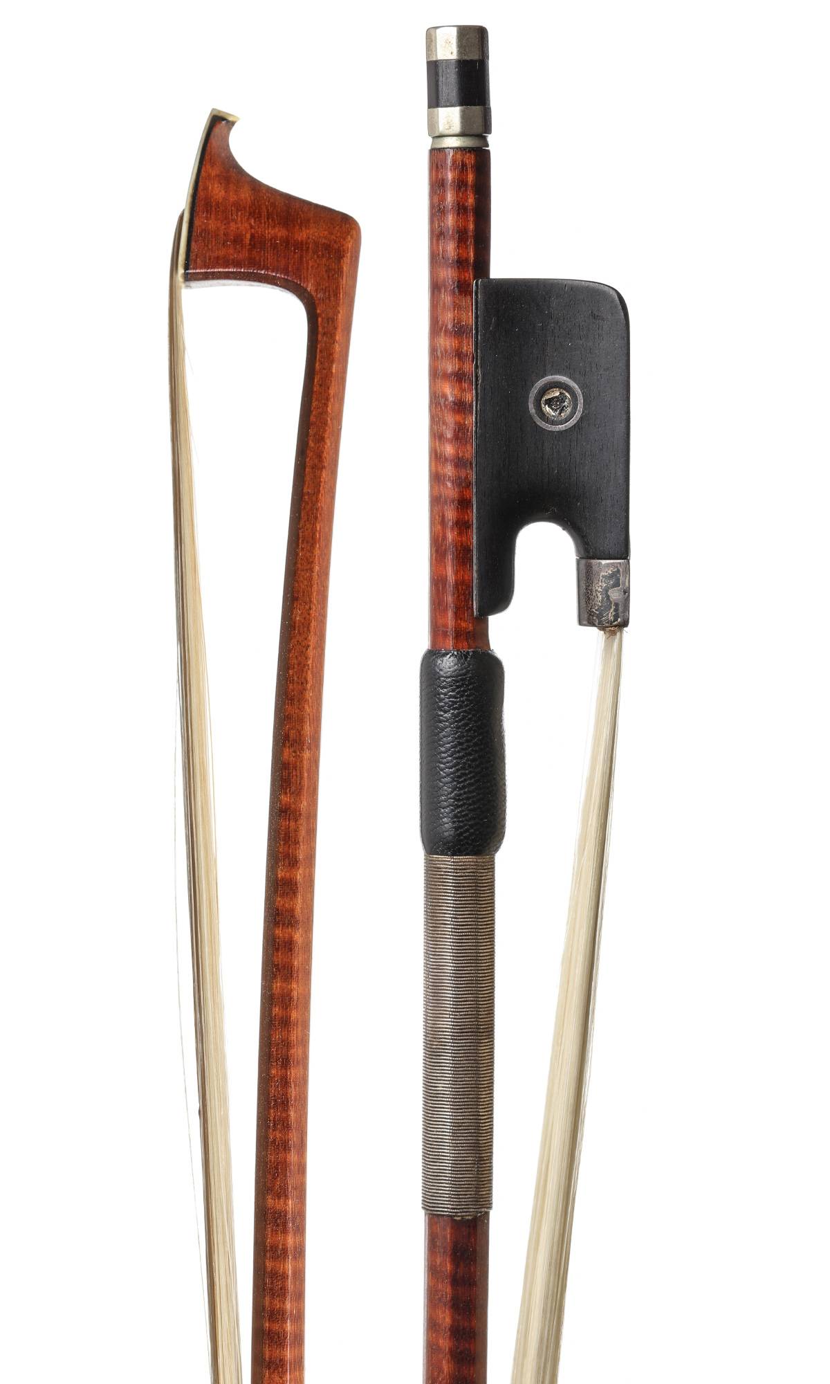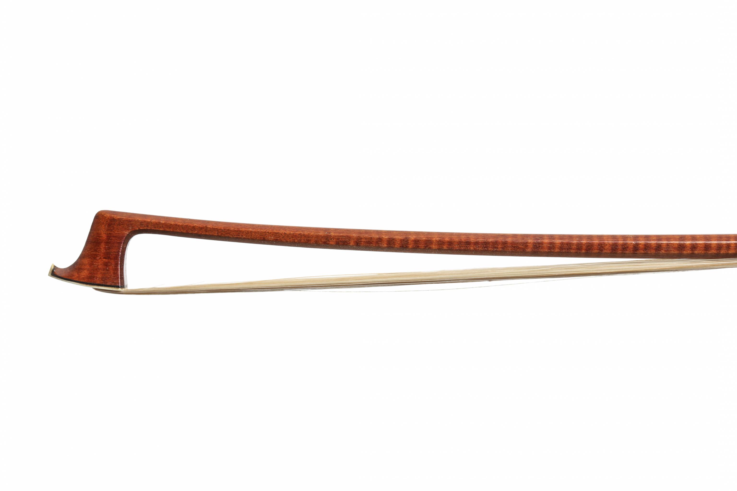 Baguette octogonale en bois de pernambouc très ondé. Hausse ébène, monté argent. Bouton d'un autre auteur. 733 mm. 60 g.