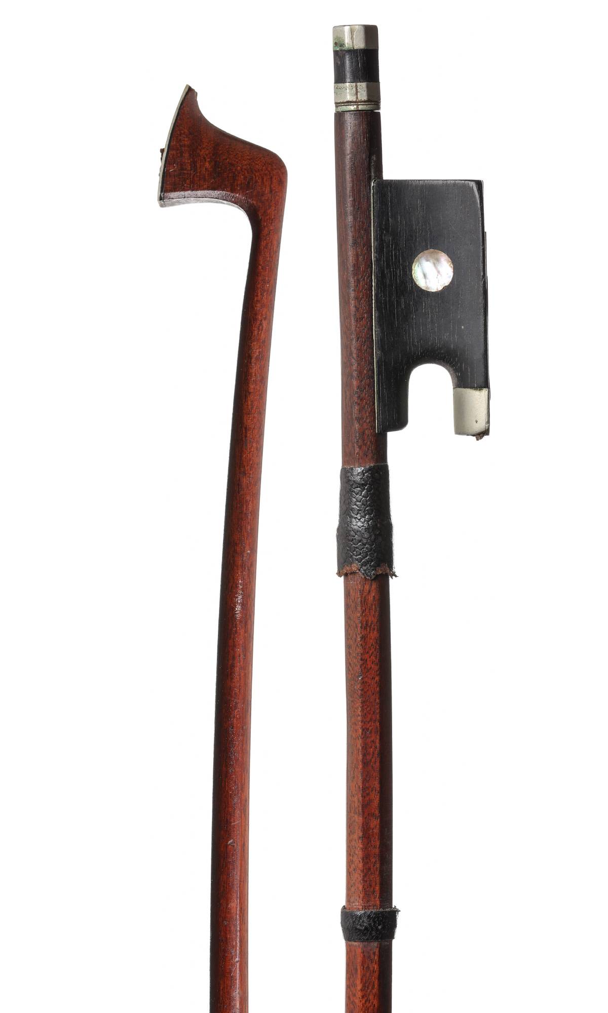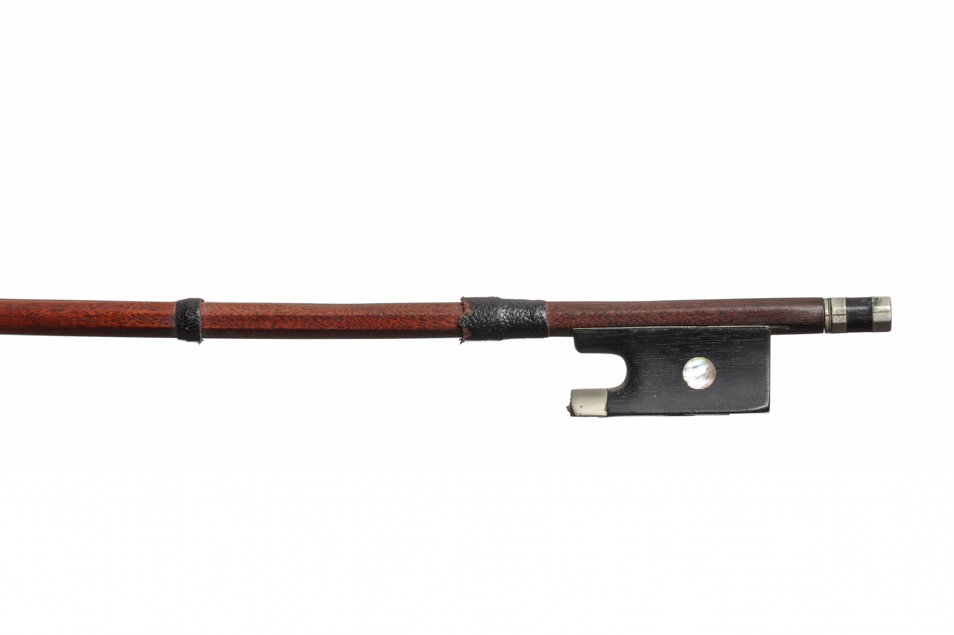 Baguette ronde en bois de pernambouc. Hausse ébène, monté maillechort. 732 mm. 47 g, sans mèche ni garniture.