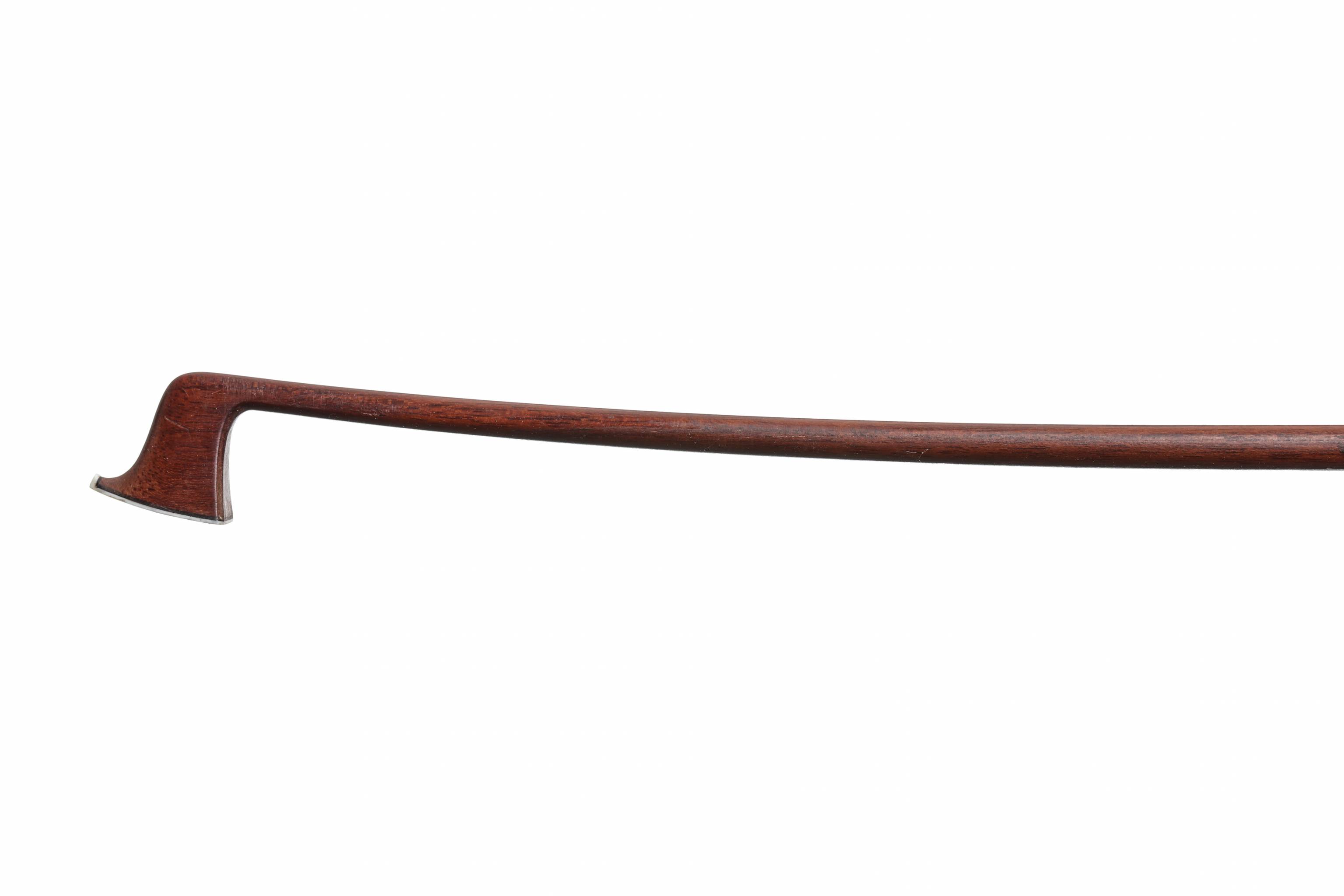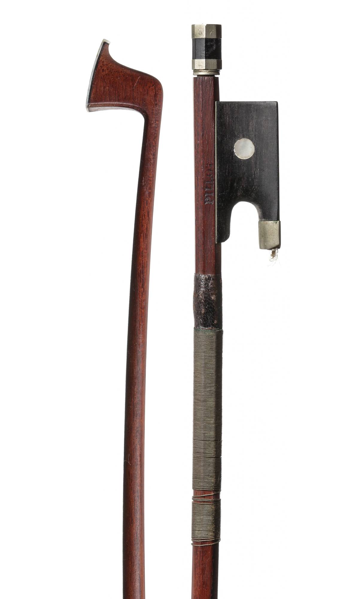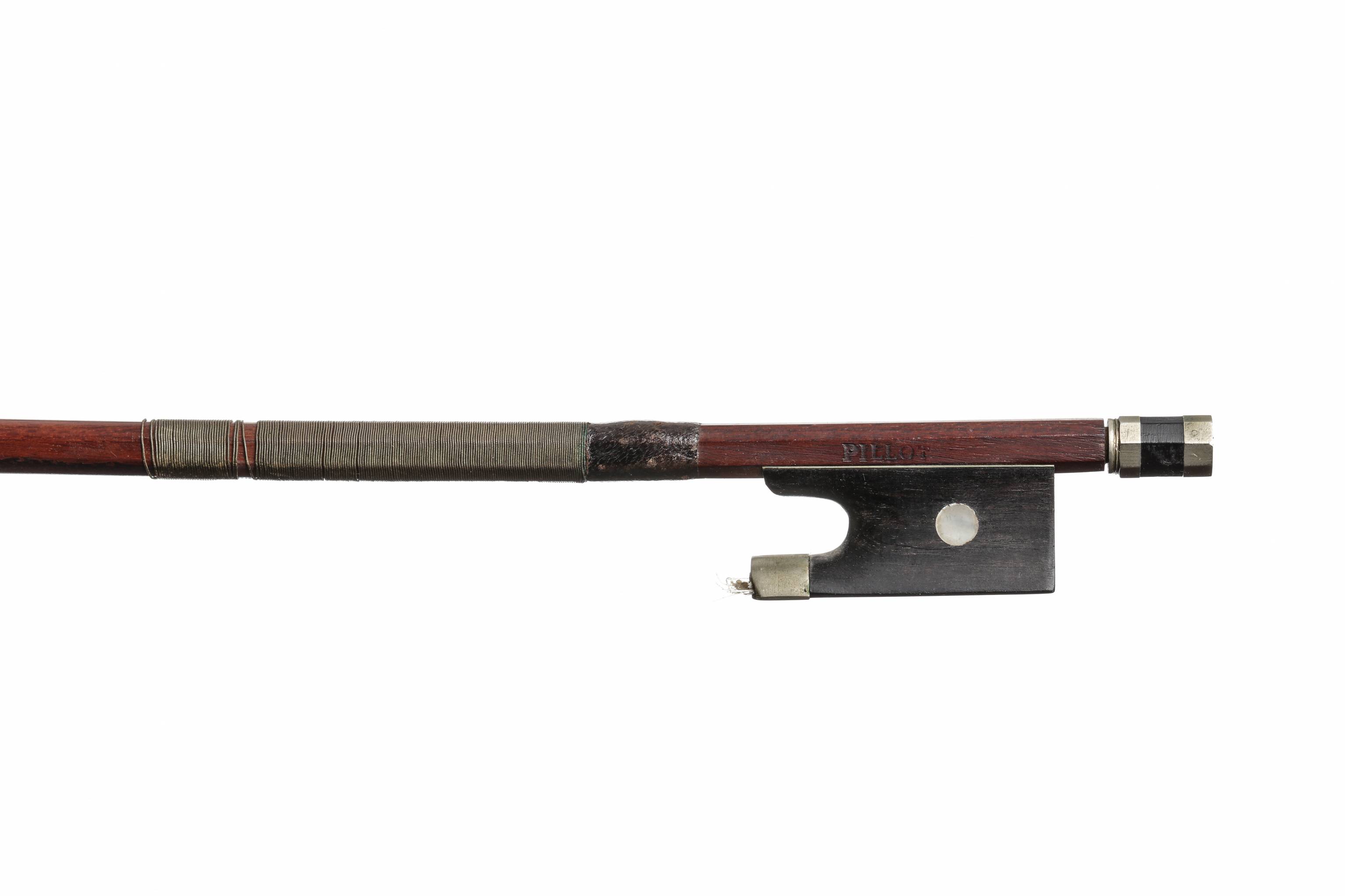 portant la marque au fer "PILLOT". Baguette ronde en bois de pernambouc. Hausse ébène, monté maillechort. 726 mm. 53 g sans mèche et garniture soie.