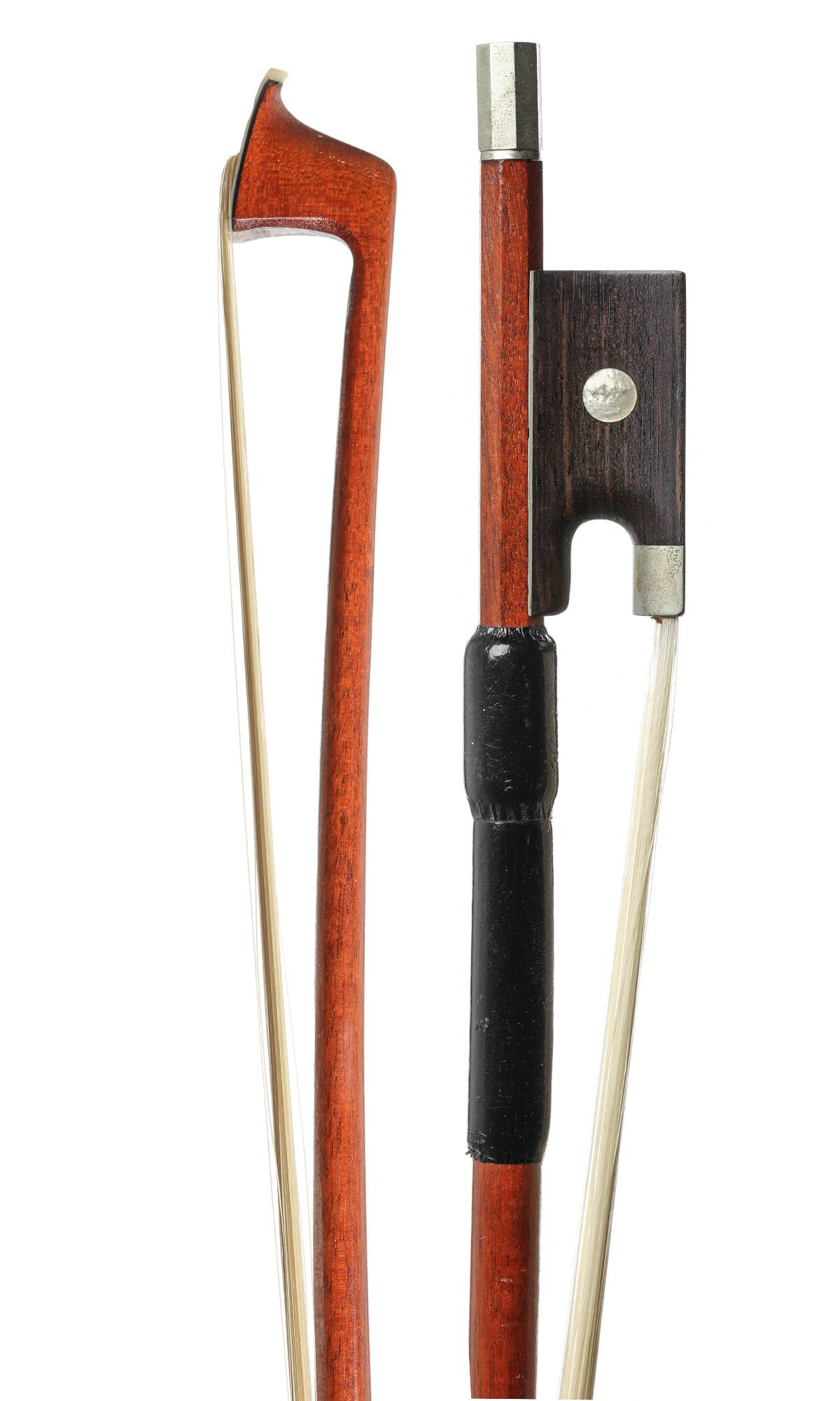 Baguette ronde en bois de pernambouc. Hausse ébène, monté maillechort. 729 mm. 60 g.