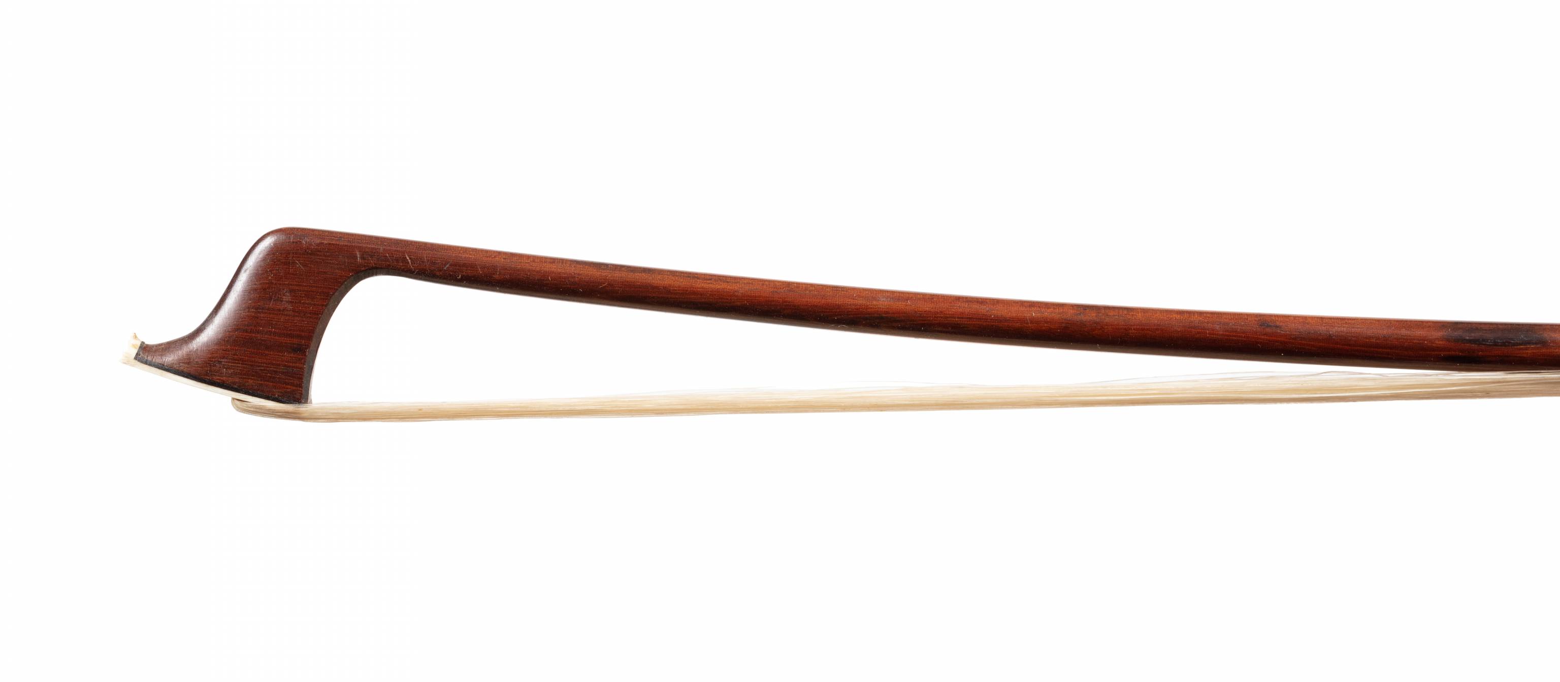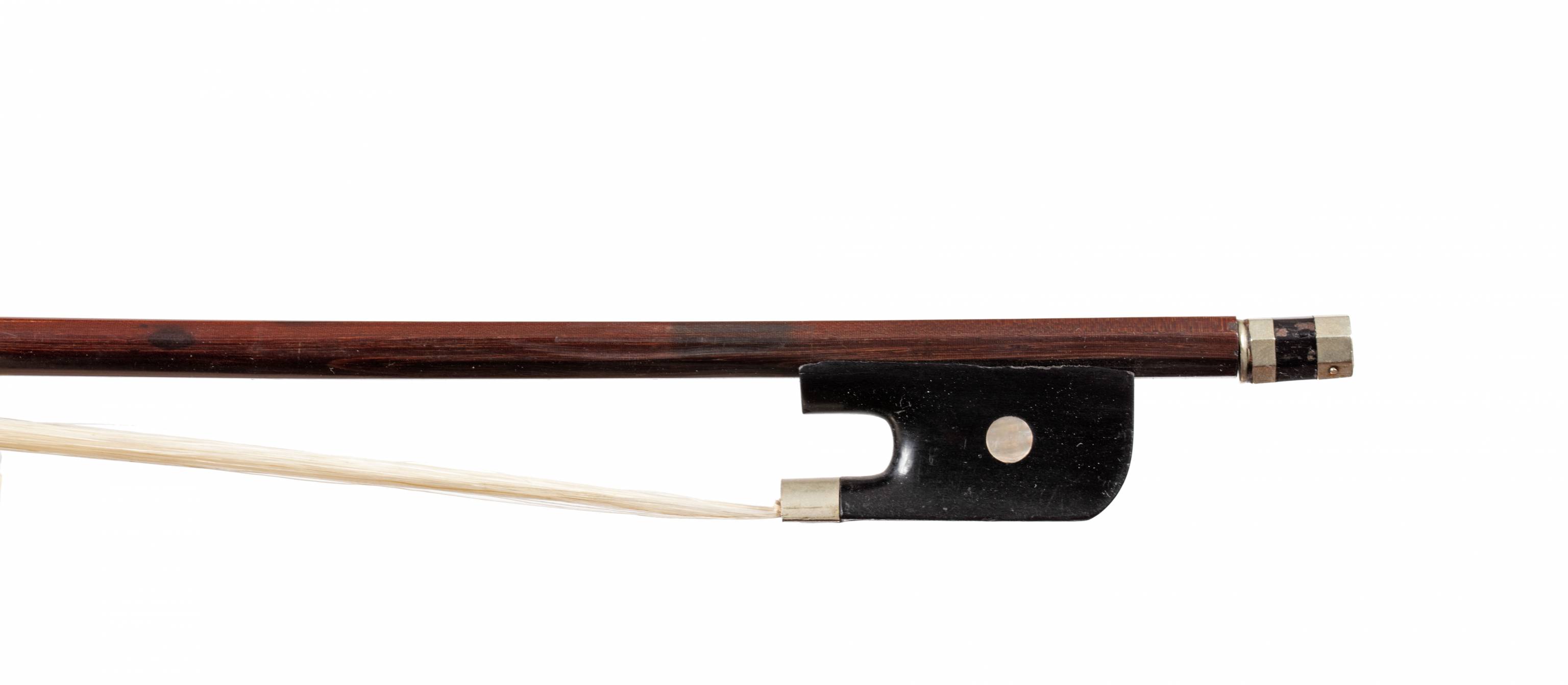 Intéressant archet fait au XIXe. Baguette en bois d'amourette. Hausse ébène, monté maillechort.