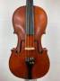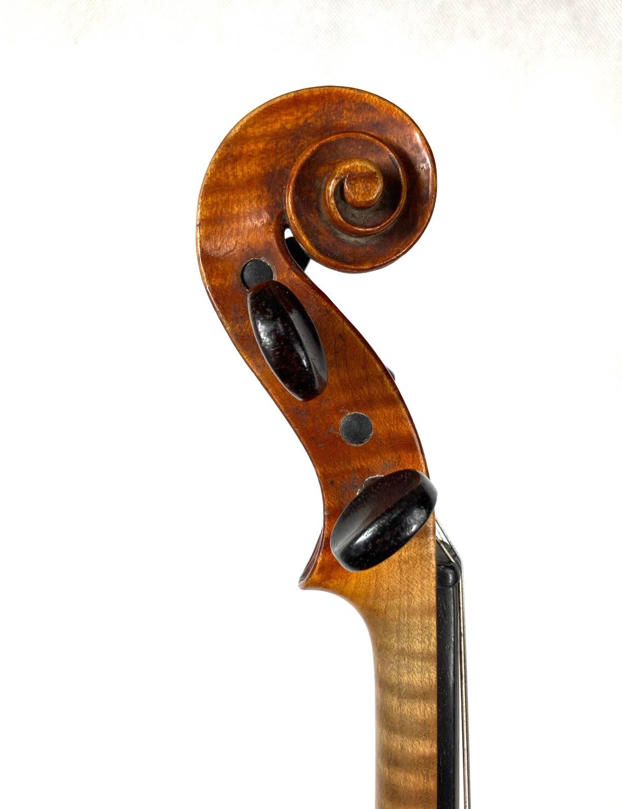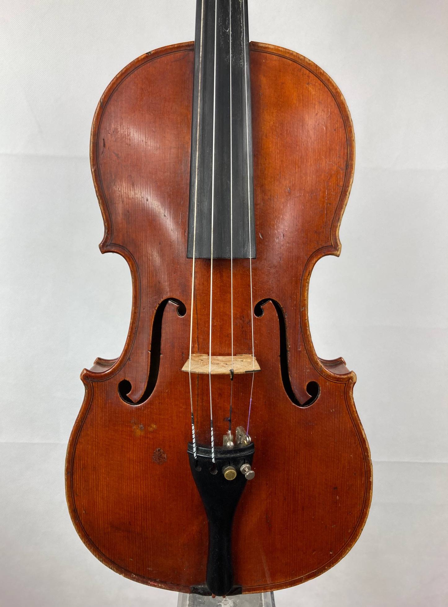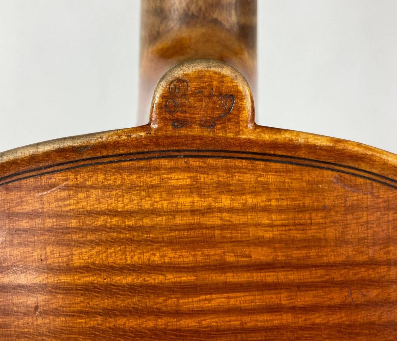 portant les marques au fer "BRETON, BREVETE DE SARM...". Fond d"une pièce en érable. Vernis brun rouge. Cassure d'âme au fond et cassure de barre à la table. En l'état. Avec archet portant marque "TOURTE". 362 mm.
