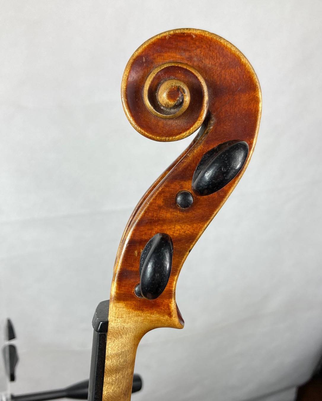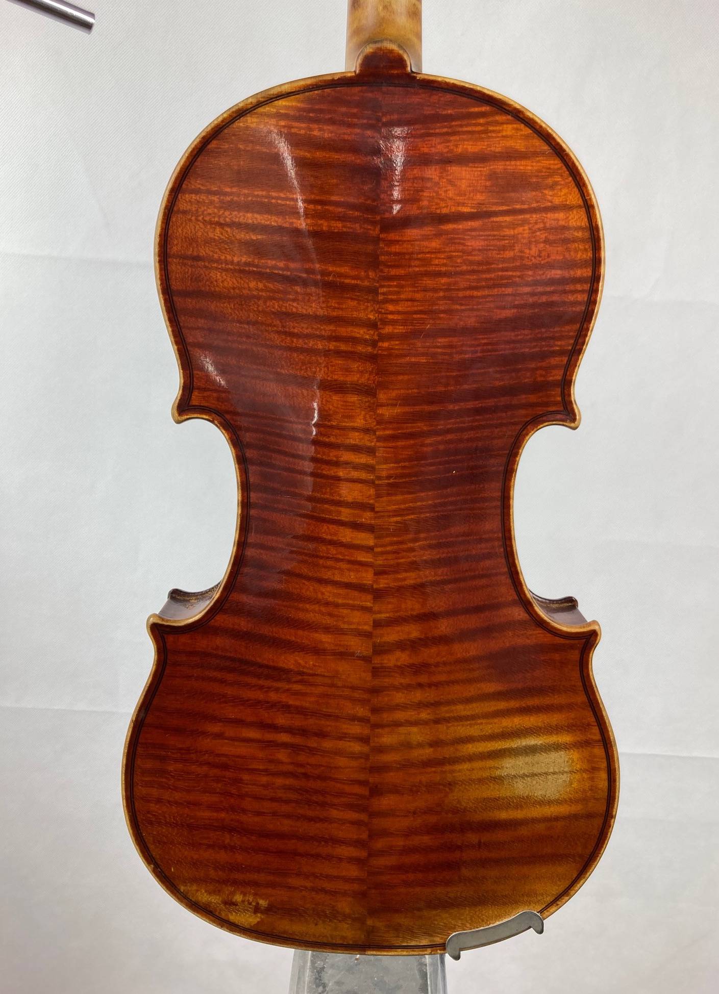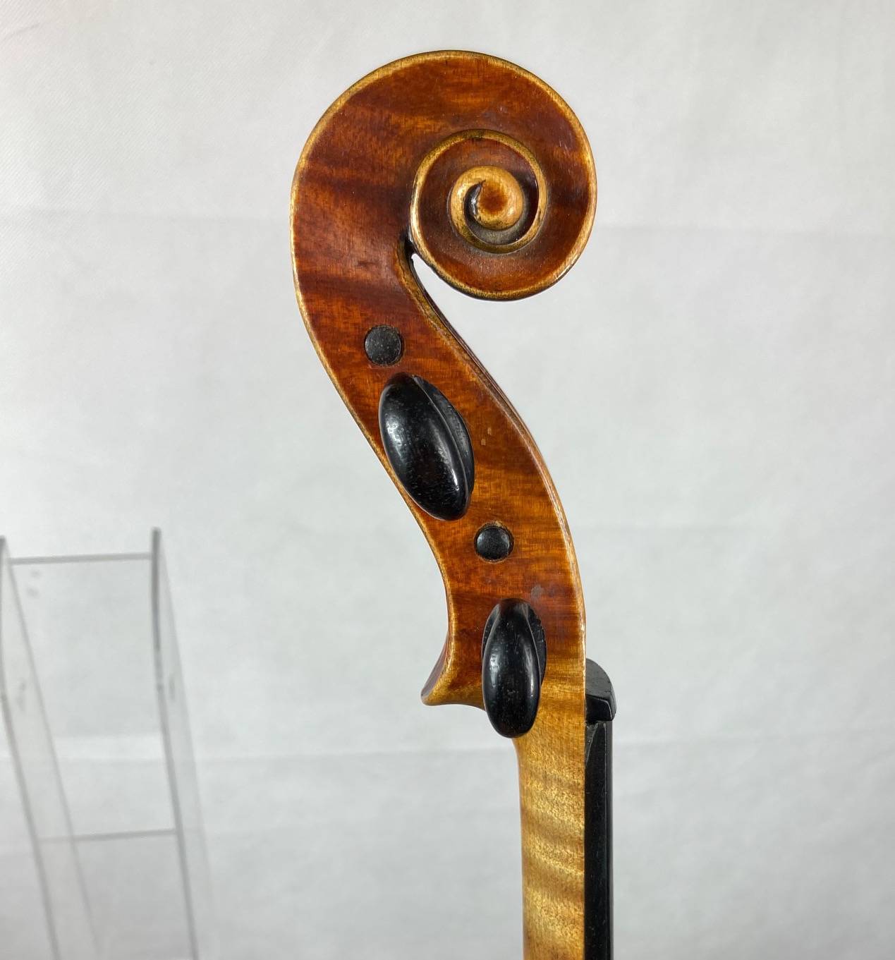 Fait à Turin en copie de J.G PRESSENDA dont il porte l'étiquette " Franciscus PRESSENDA...". Fond de deux pièces en érable aux ondes régulières montantes. Table en épicéa aux pores moyennement larges au milieu, s'élargissant sur les bords. Vernis brun rouge. Cassures de table. 357 mm.