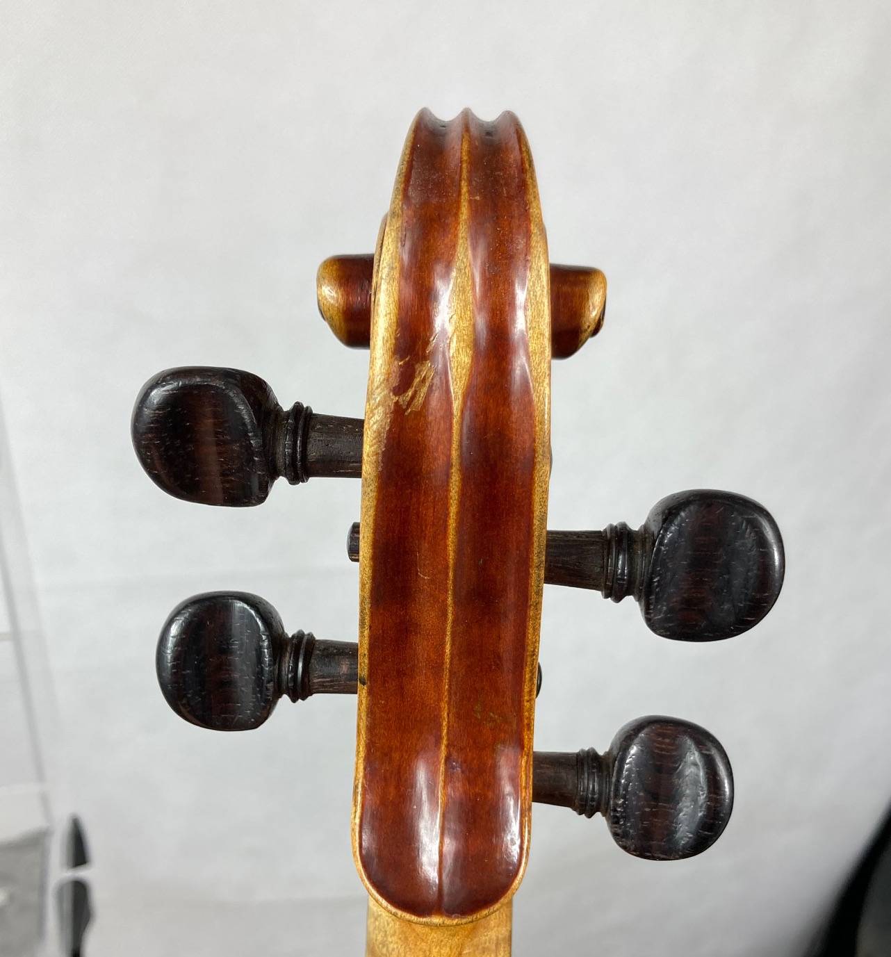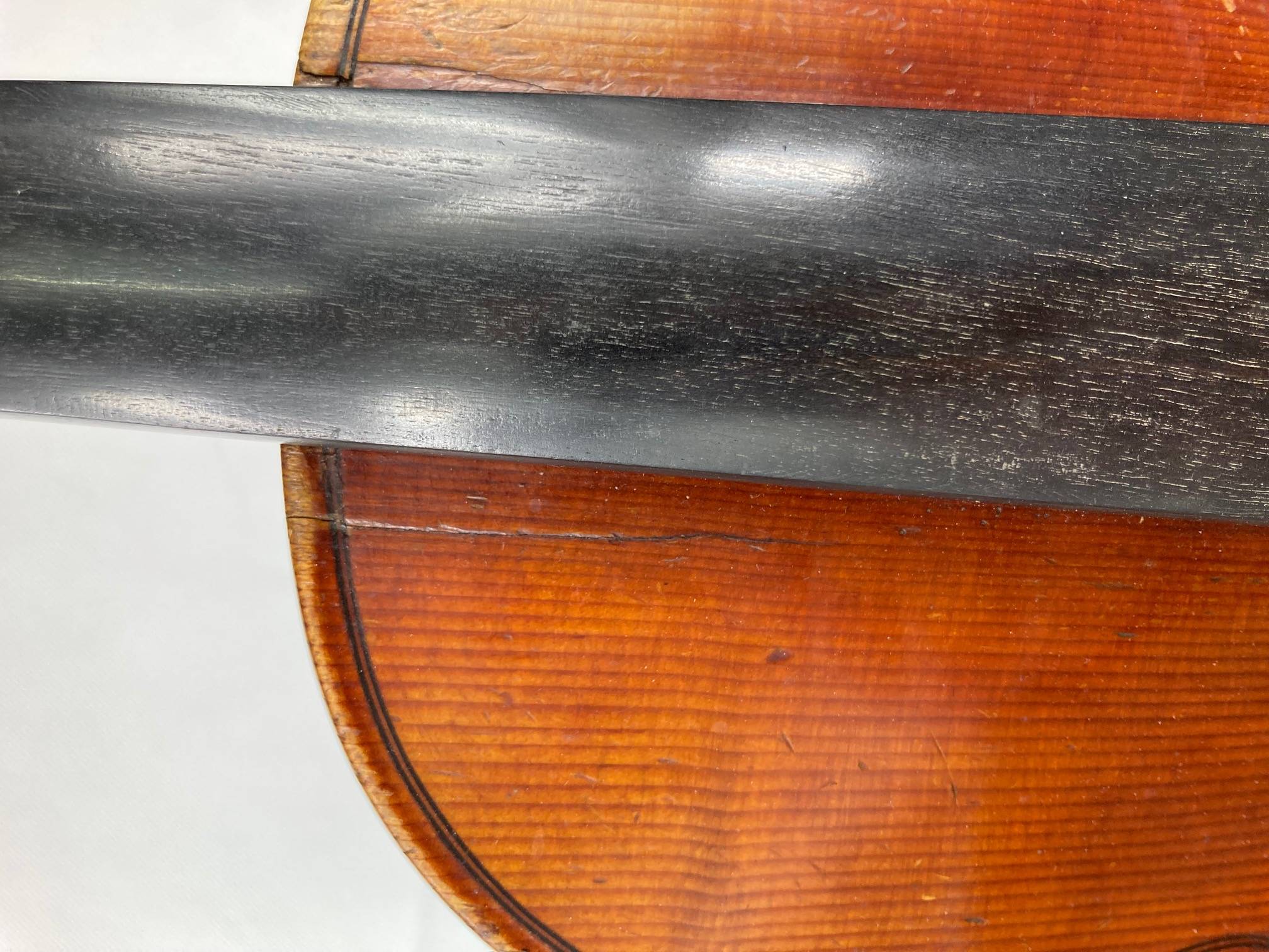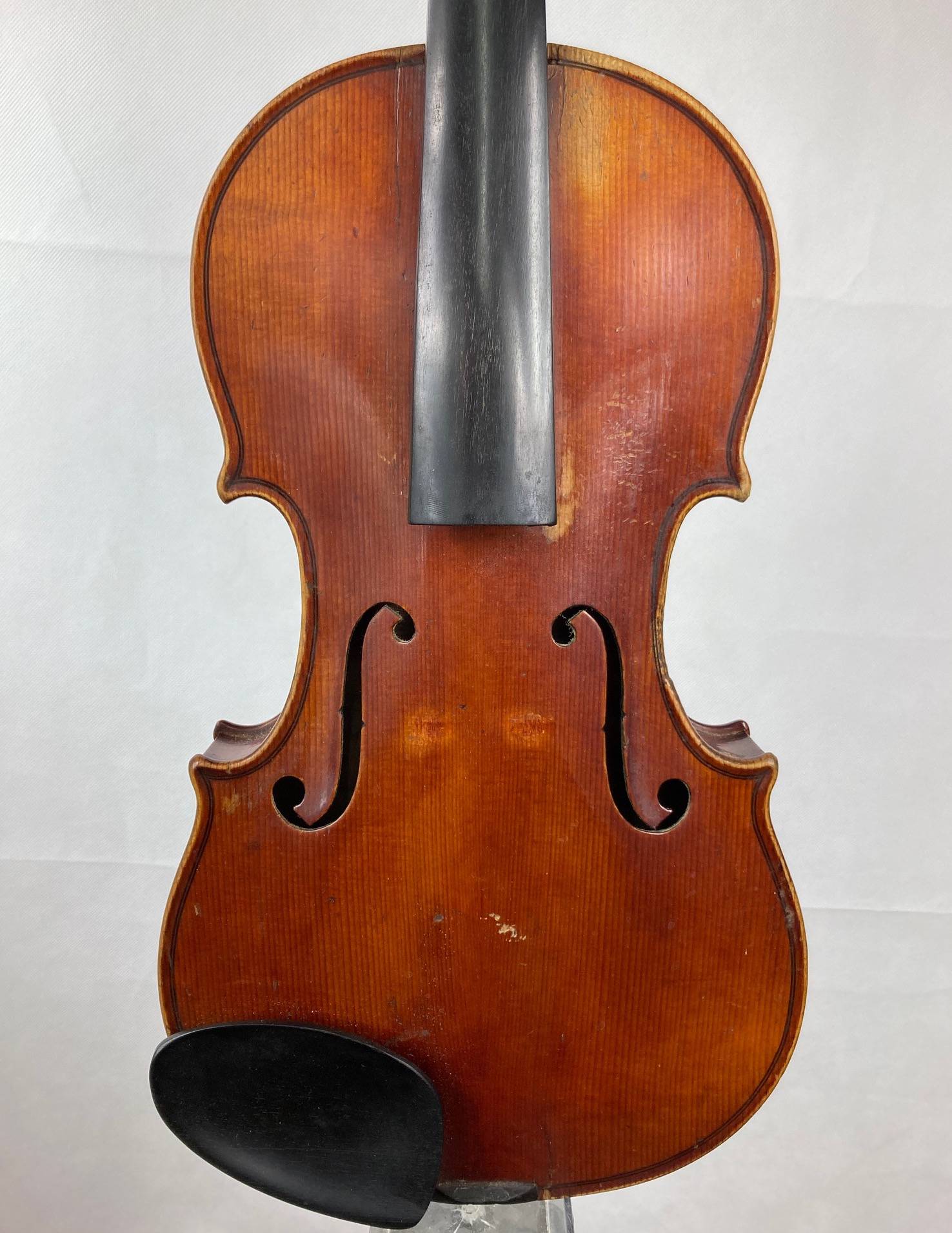 Fait à Turin en copie de J.G PRESSENDA dont il porte l'étiquette " Franciscus PRESSENDA...". Fond de deux pièces en érable aux ondes régulières montantes. Table en épicéa aux pores moyennement larges au milieu, s'élargissant sur les bords. Vernis brun rouge. Cassures de table. 357 mm.