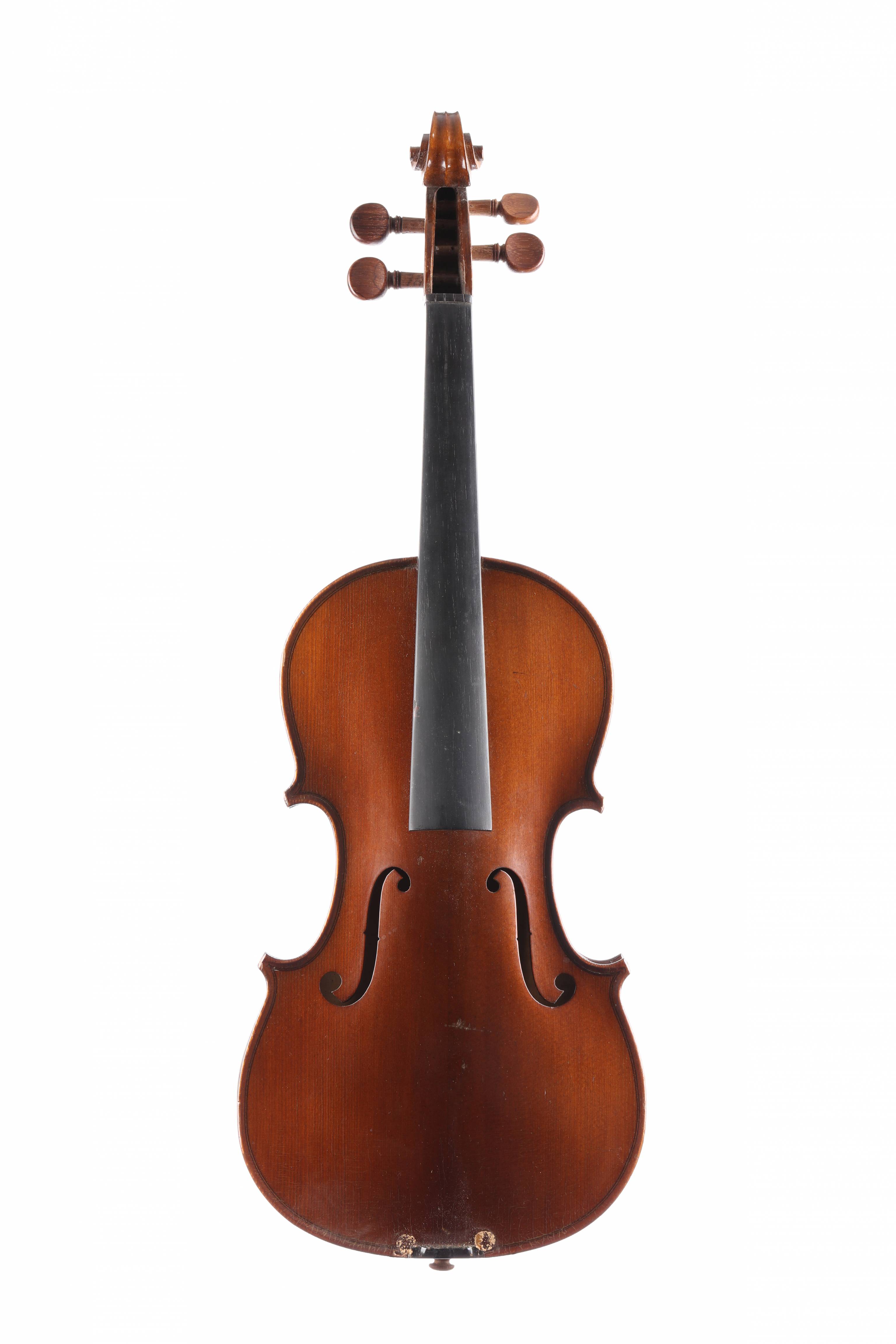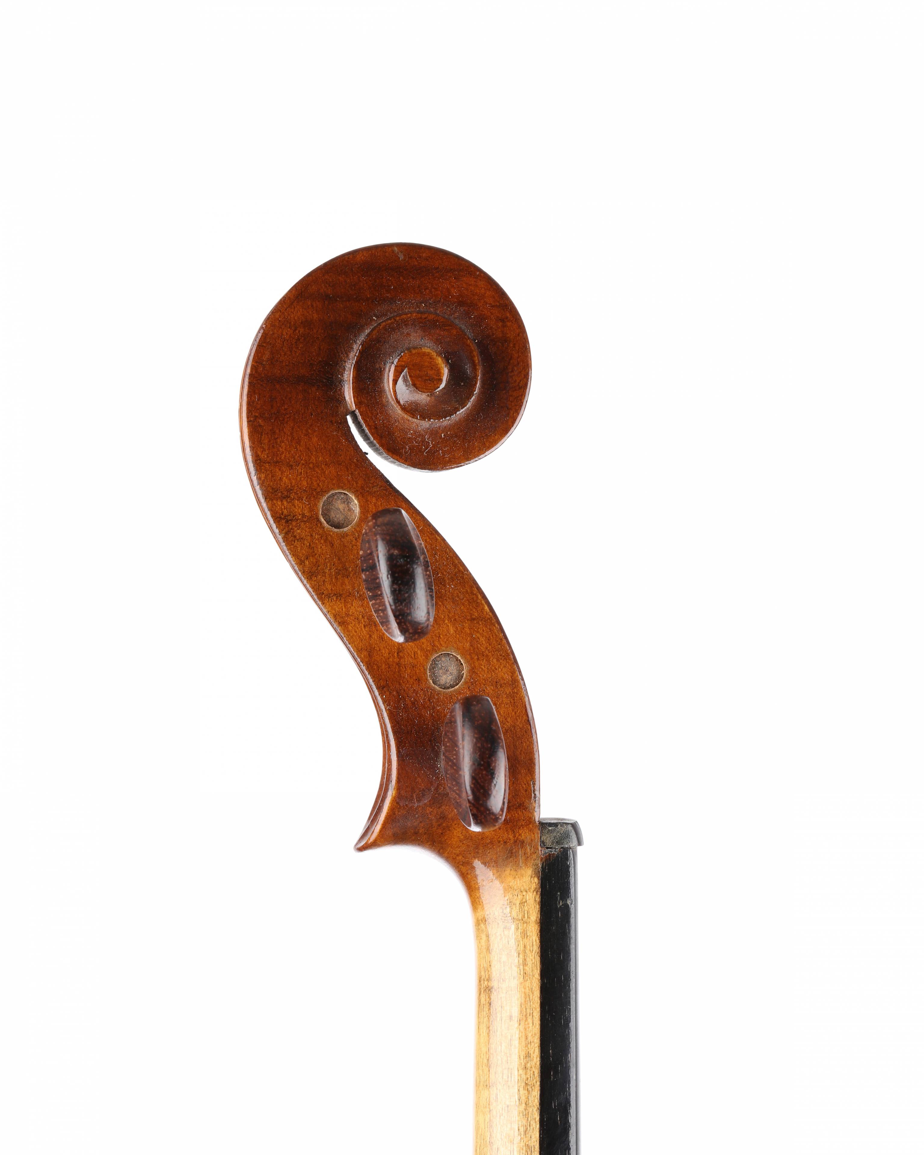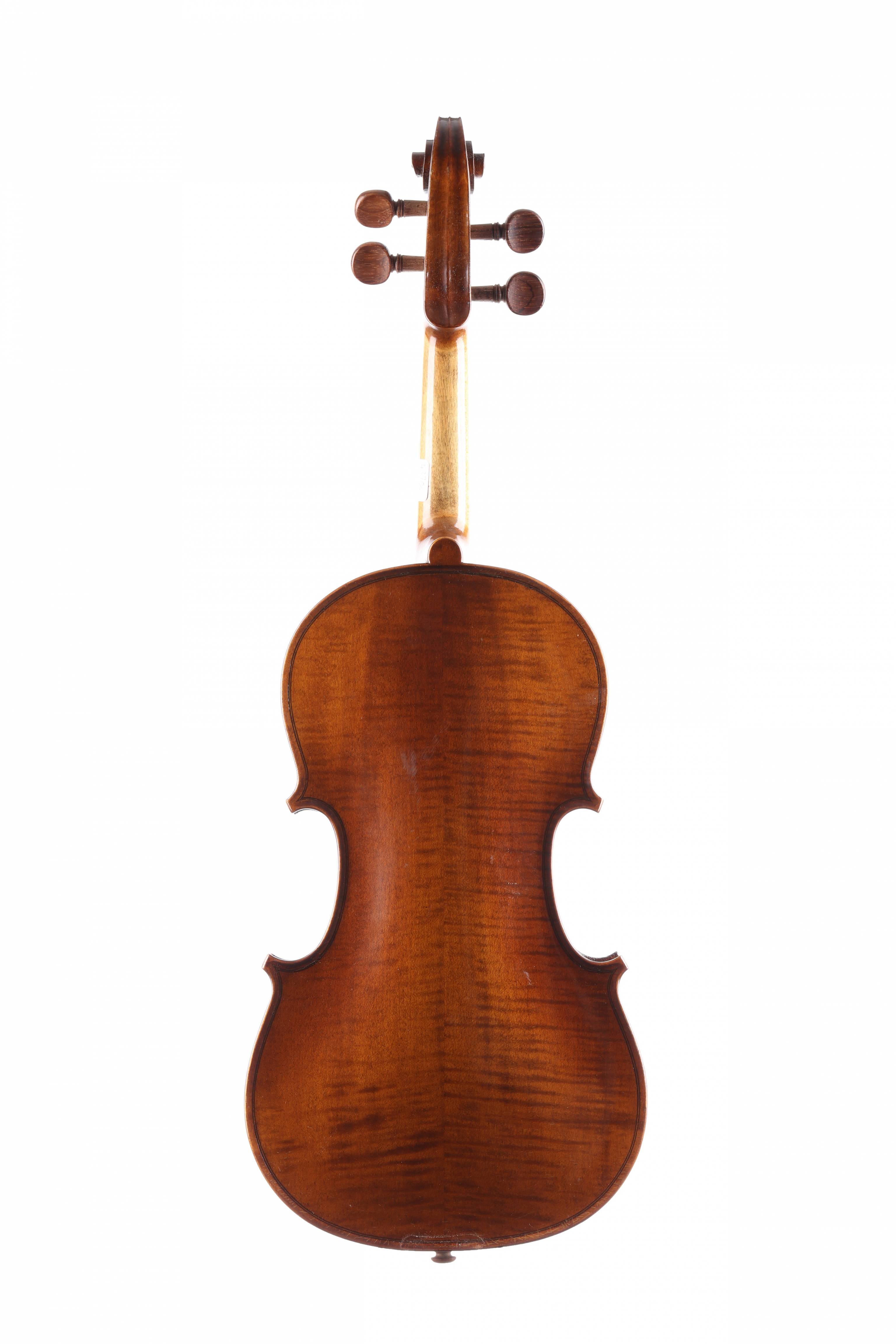 Sans étiquette, Atelier LABERTE. Fond de deux pièces en érable. Vernis brun sur fond doré. 358 mm. Avec boite et deux archets.