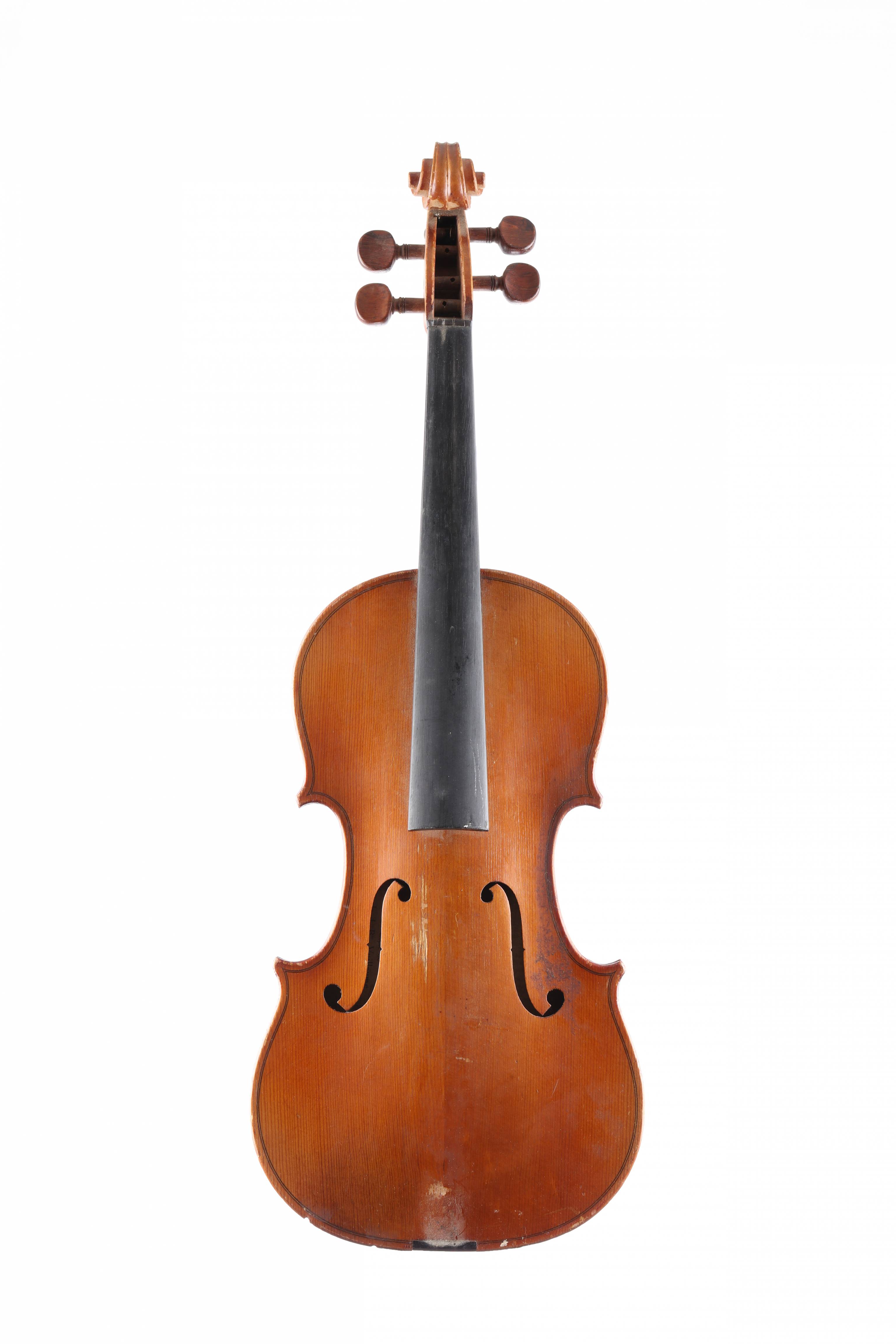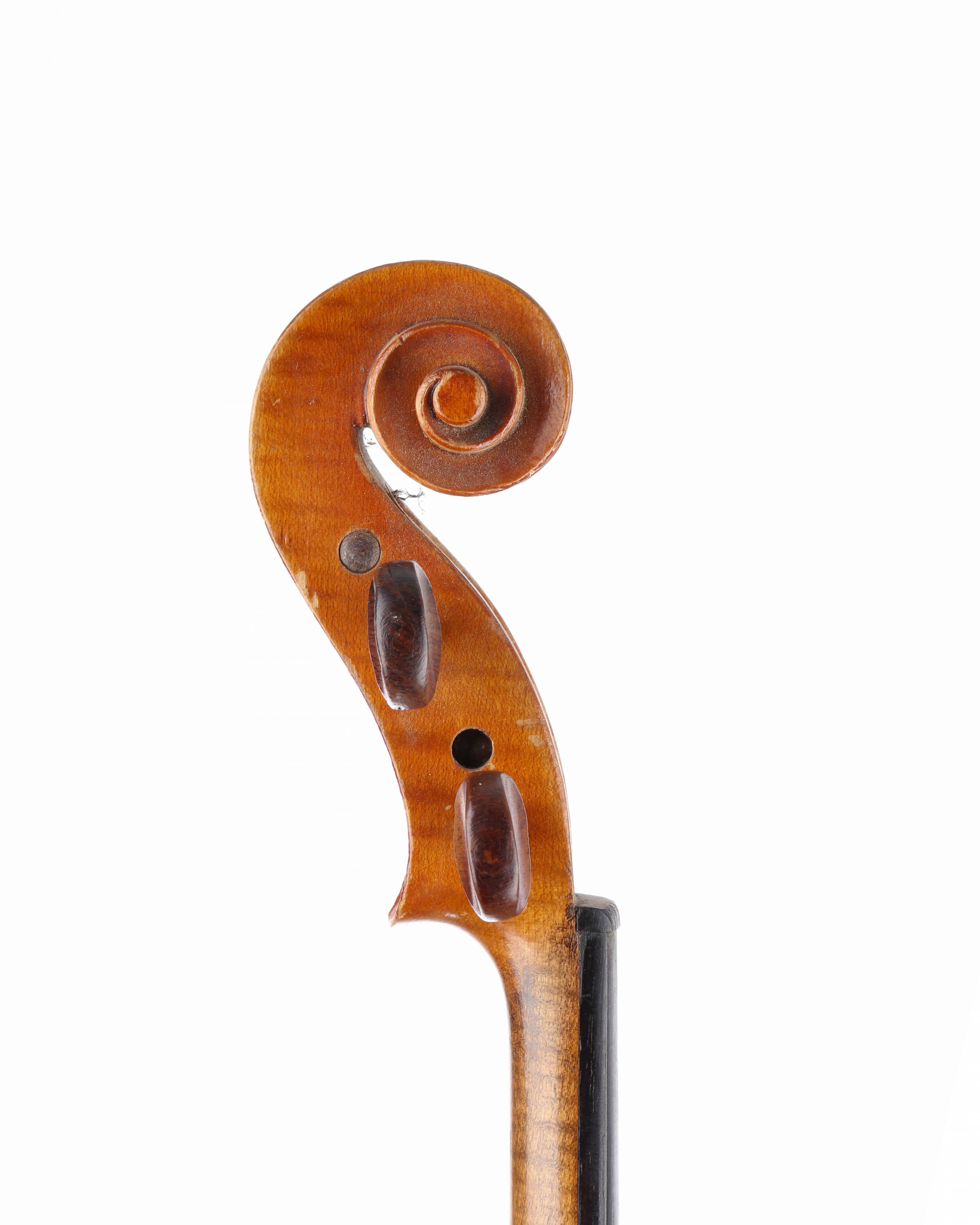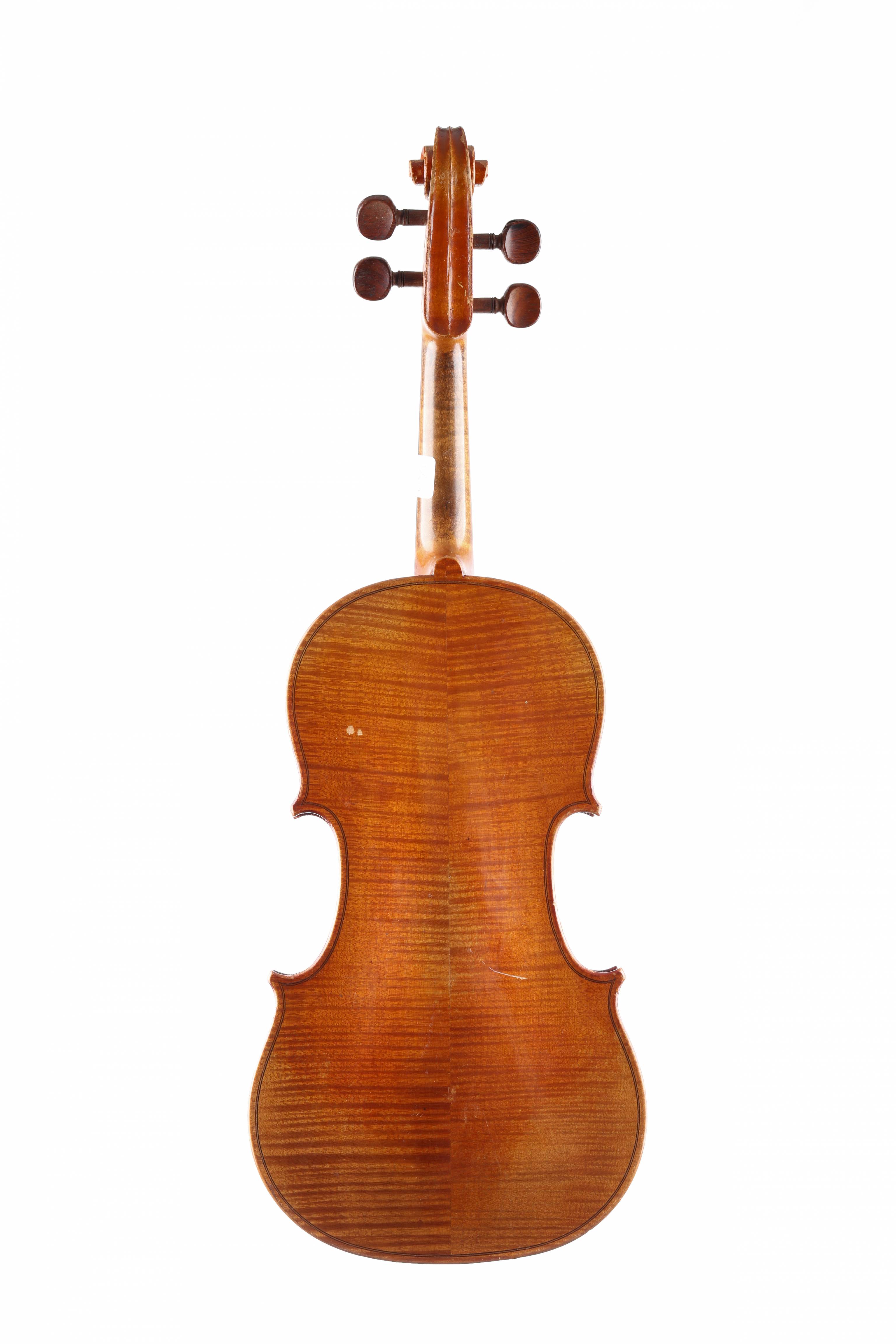portant deux étiquettes "Choisi par Léon Bernardel Luthier" et copie de "JB.Vuillaume à Paris". Fond de deux pièces. Vernis brun sur fond doré. 357 mm.