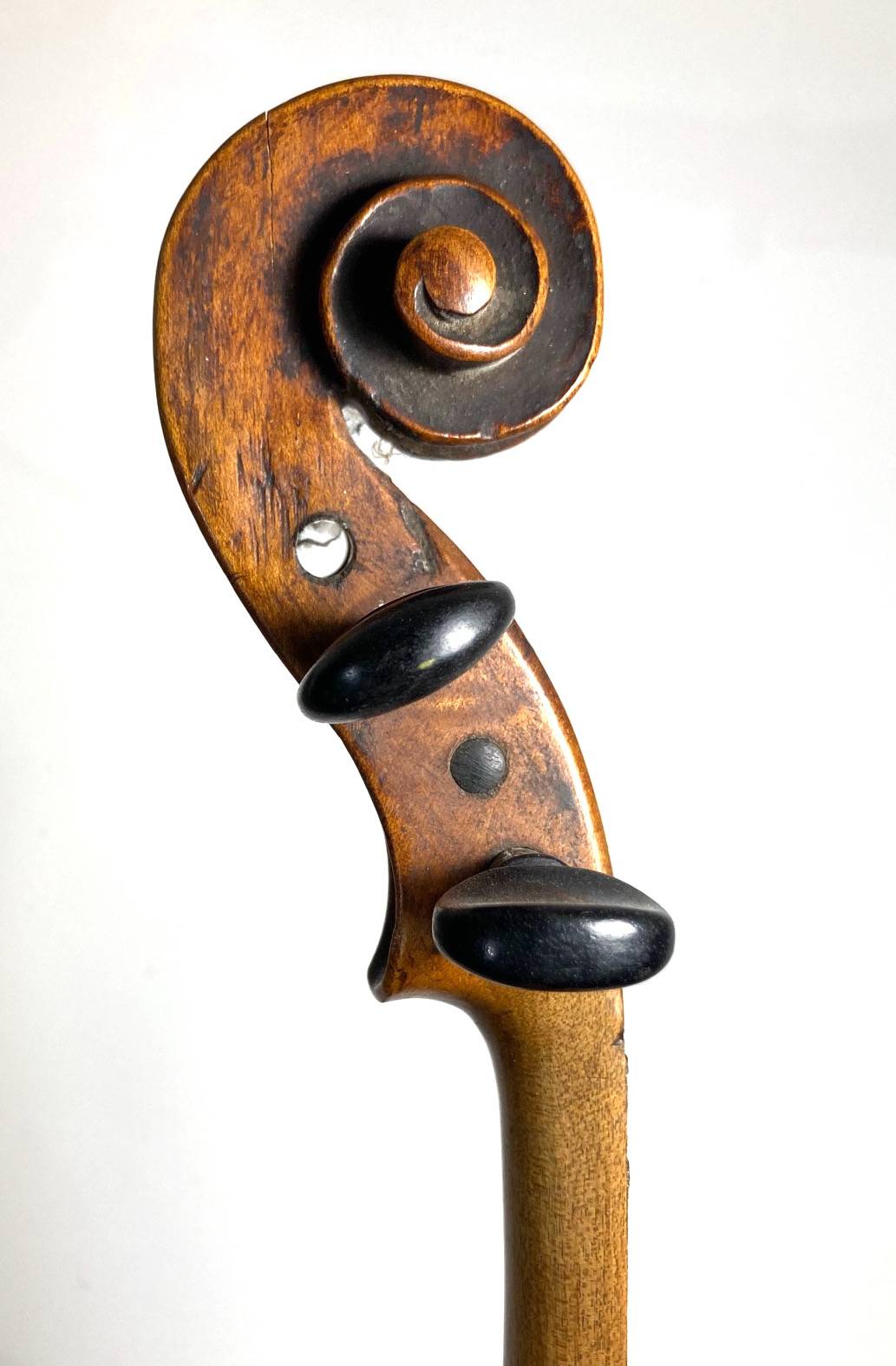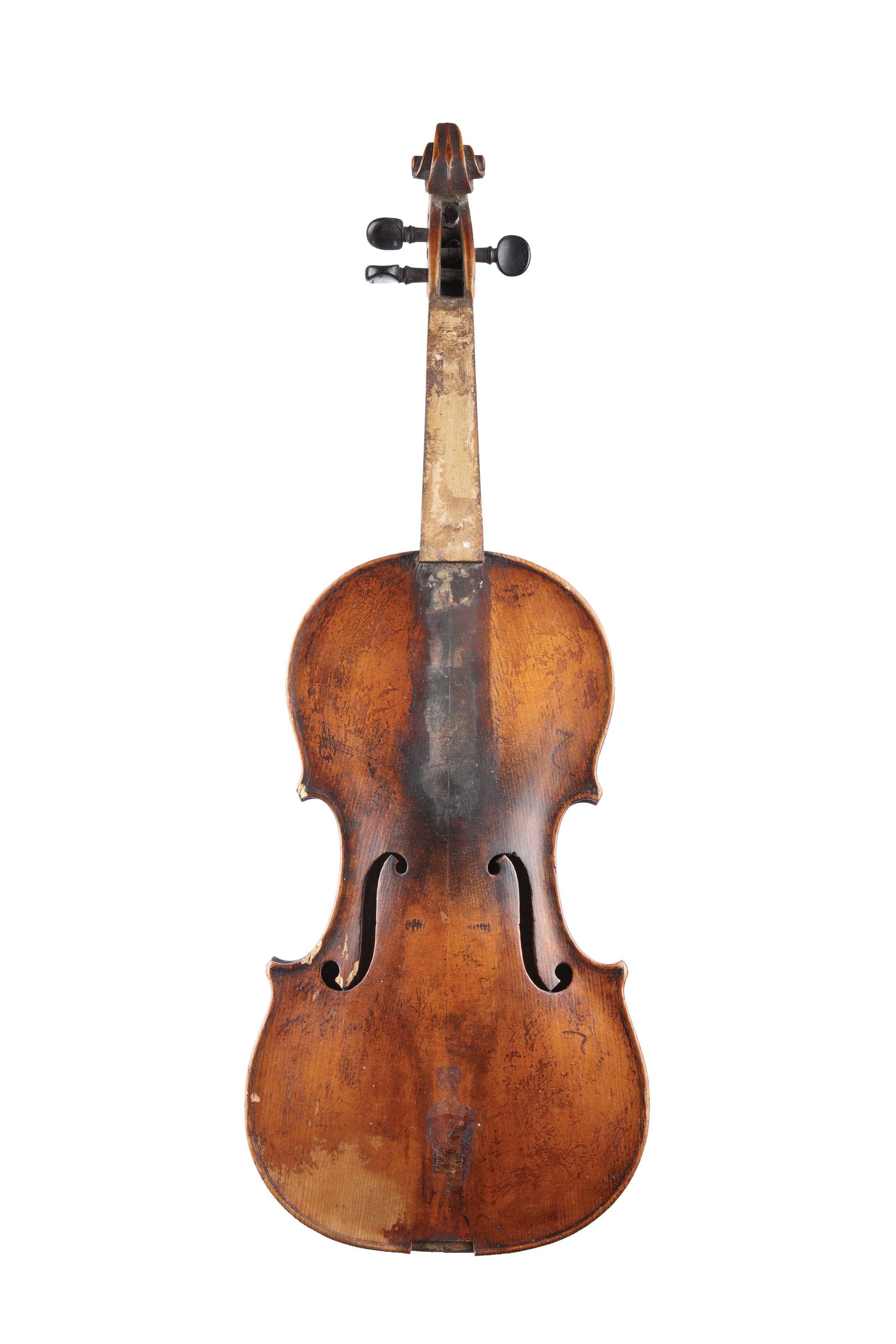 Fait au XIXe. Fond de deux pièces en érable. Vernis brun sur fond doré. 363 mm. Manque la touche. Divers manques et usures.