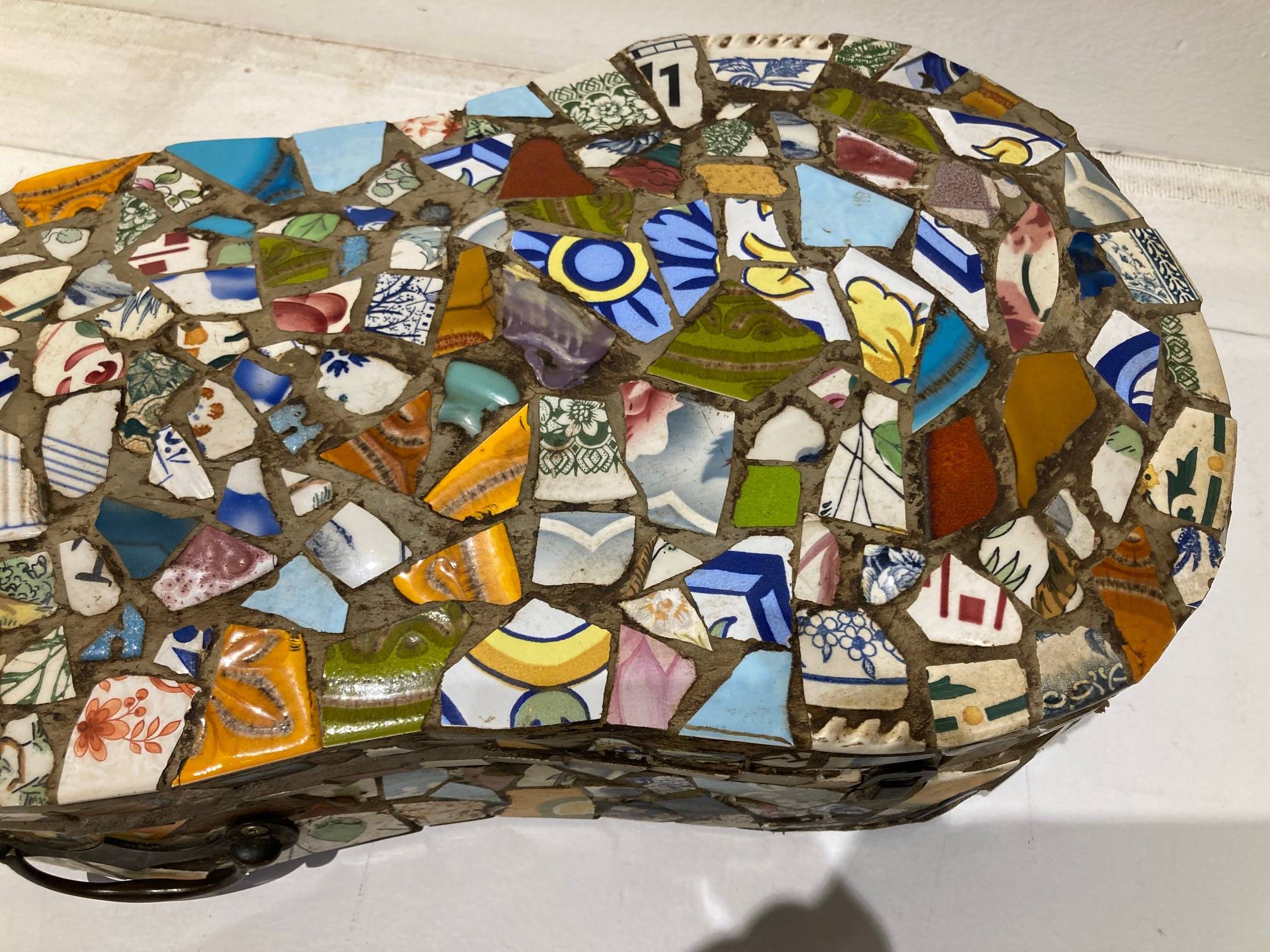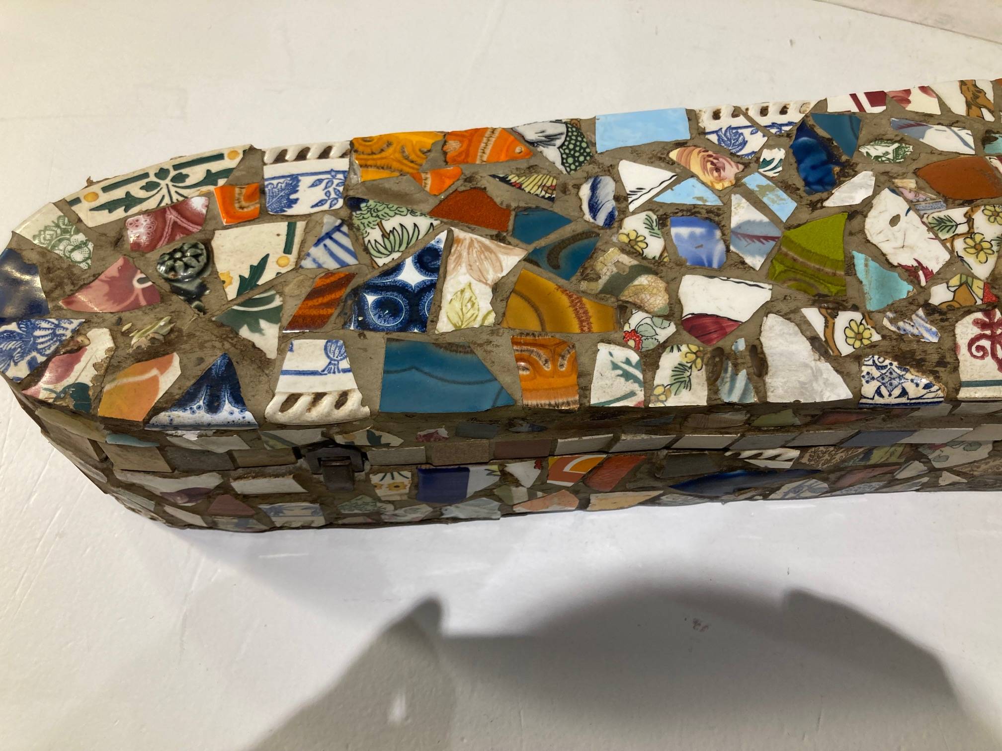 Travail d'amateur. Boite recouverte de morceaux de céramiques. Usures.