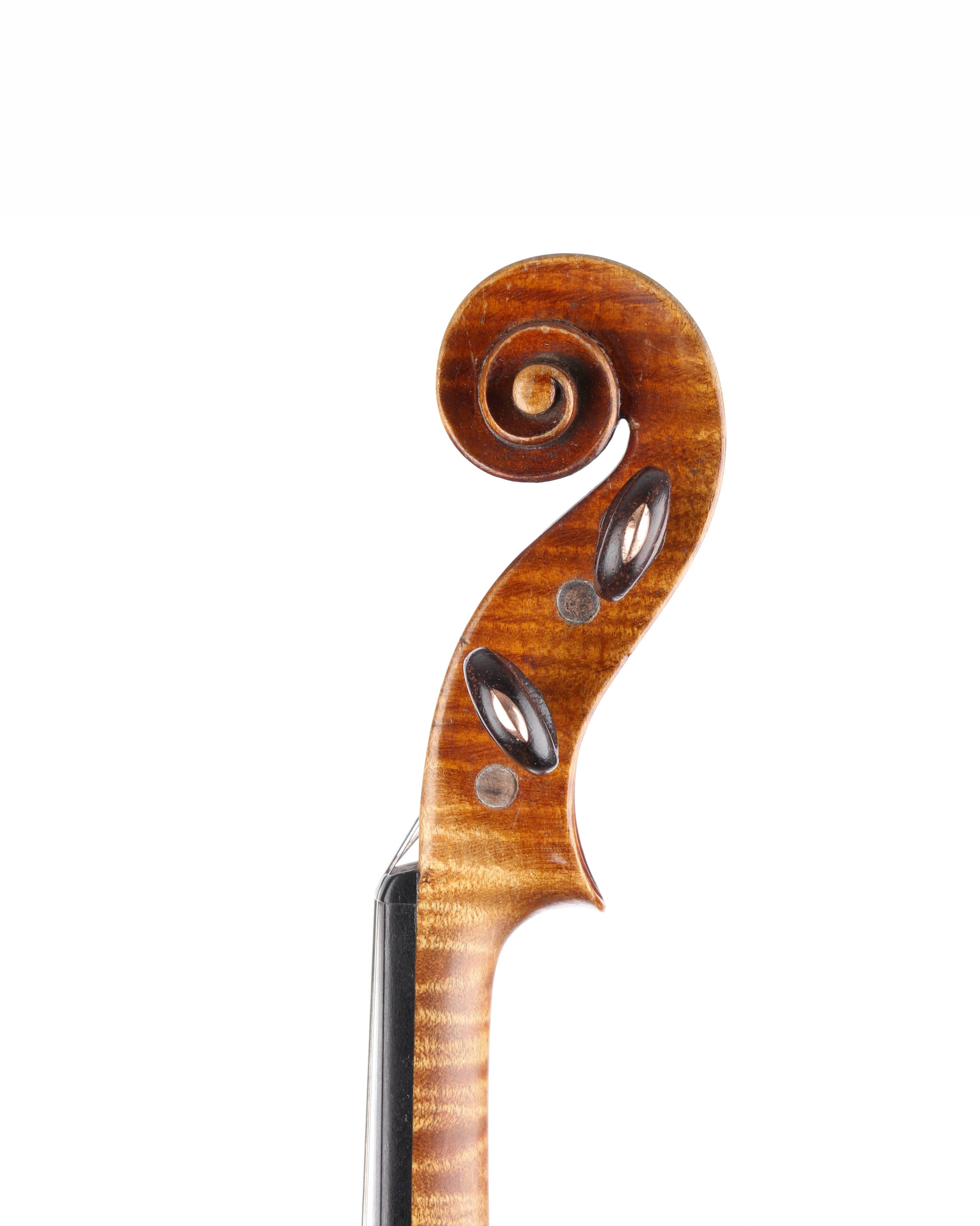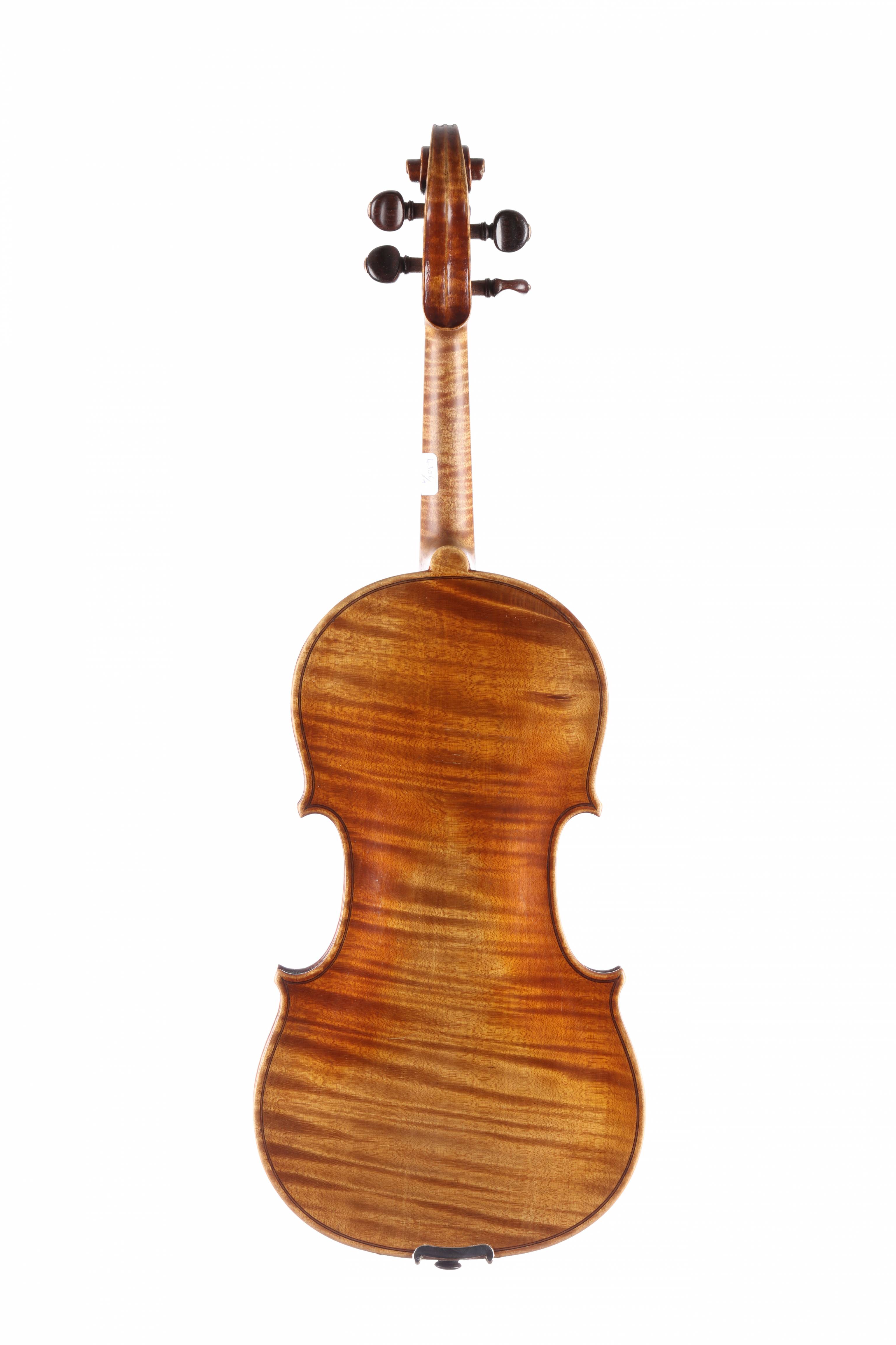 Fond d'une pièce en bel érable aux ondes larges. Table en épicéa aux pores plutôt larges. Vernis brun doré. 357 mm.
