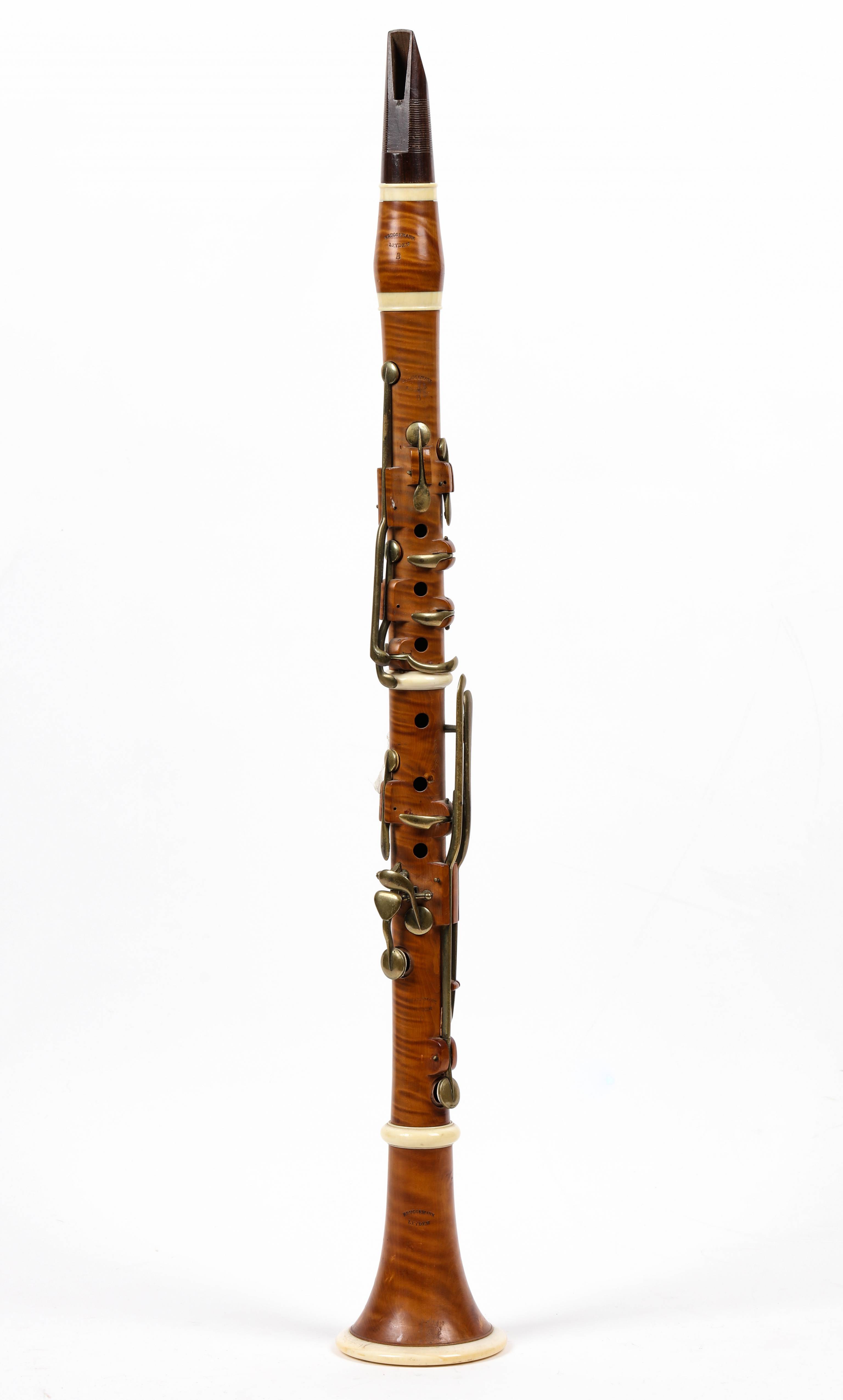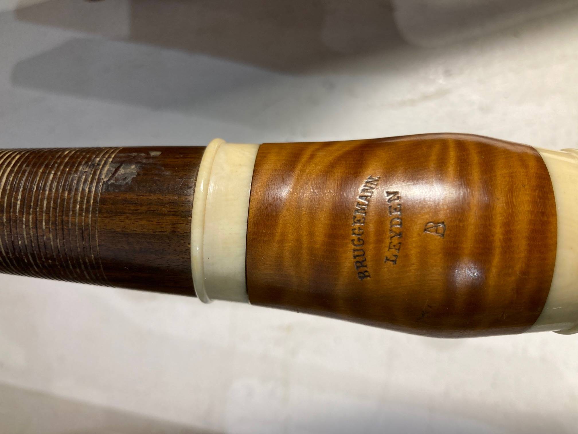 portant la marque "BRUGGEMANN LEYDEN B", en buis flammé, 14 clefs. Bagues en ivoire. L'ensemble à restaurer.
