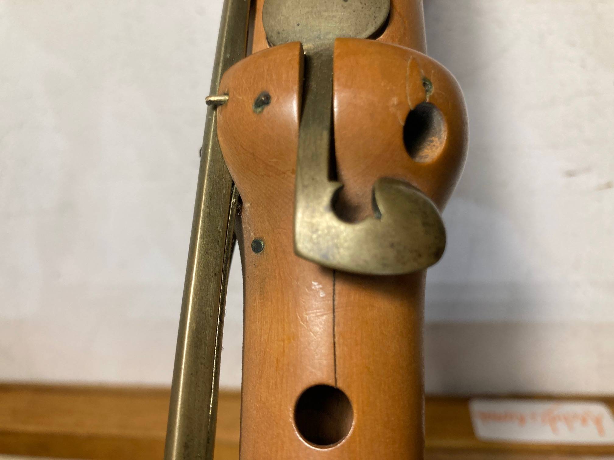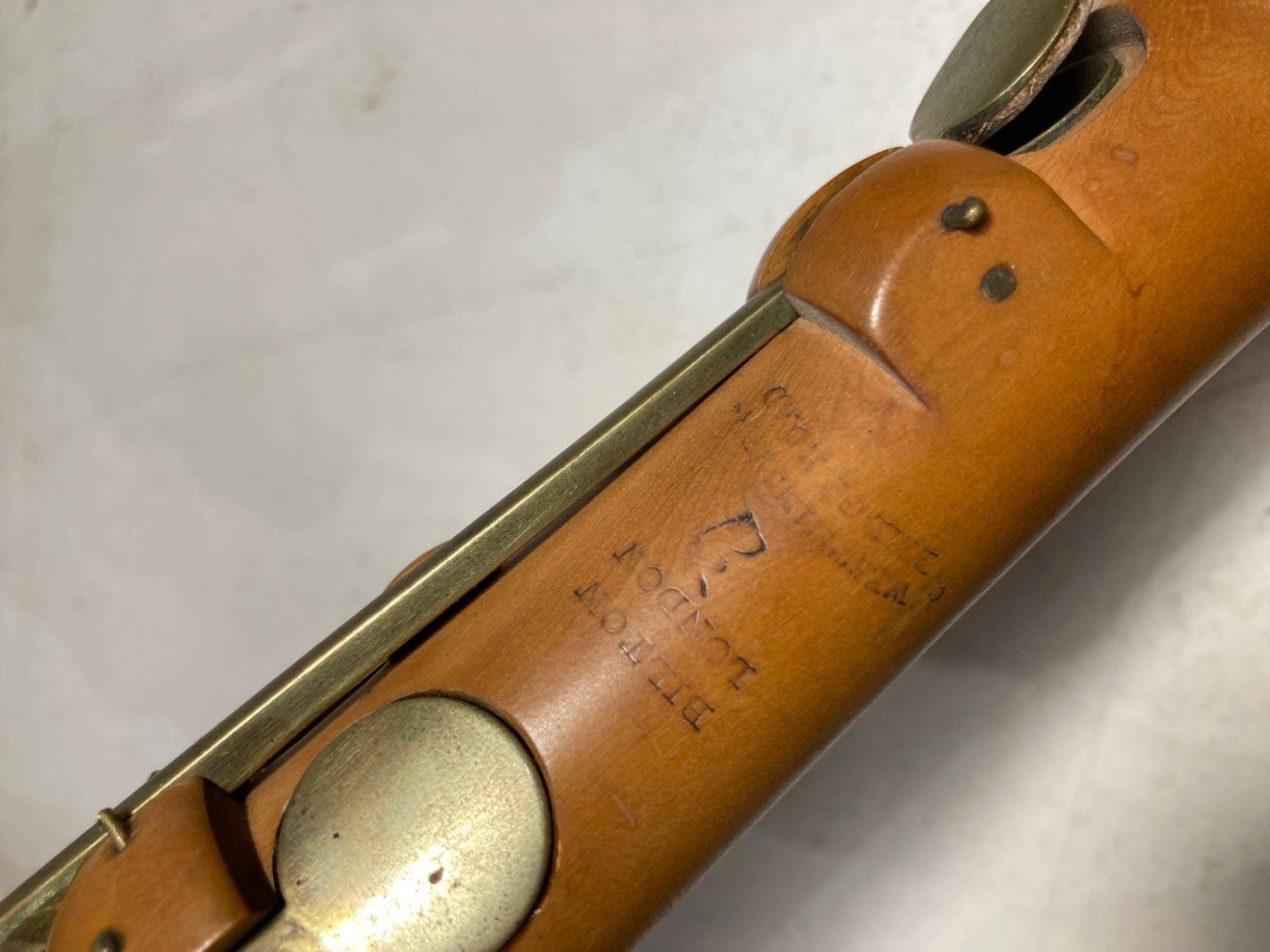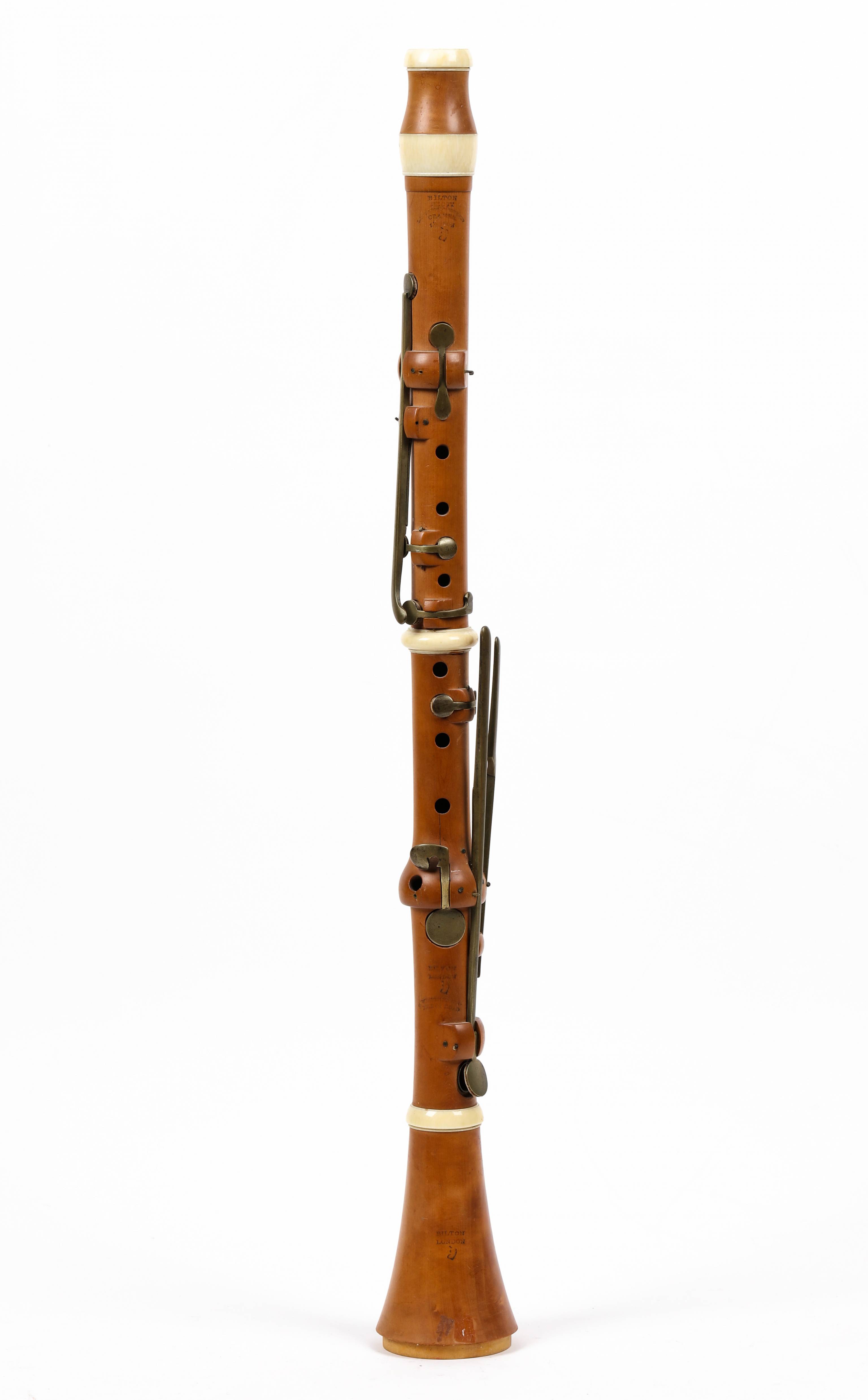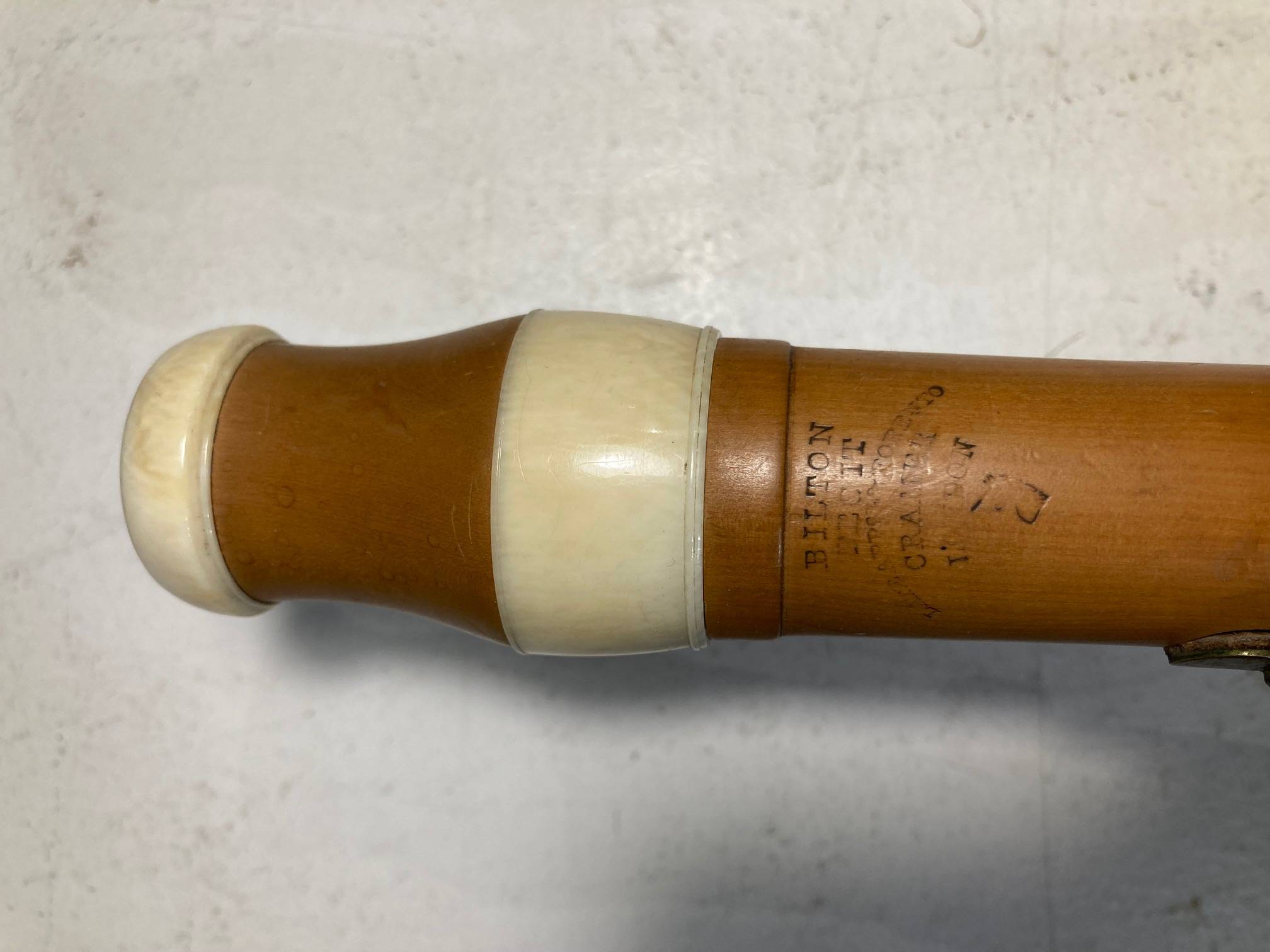 portant la marque "BILTON LONDON", en buis. 9 clefs en laiton. Bagues en ivoire. L'ensemble à restaurer. Manque bague du pavillon. Fait au XIXème siècle. (Ivoire de la même époque)