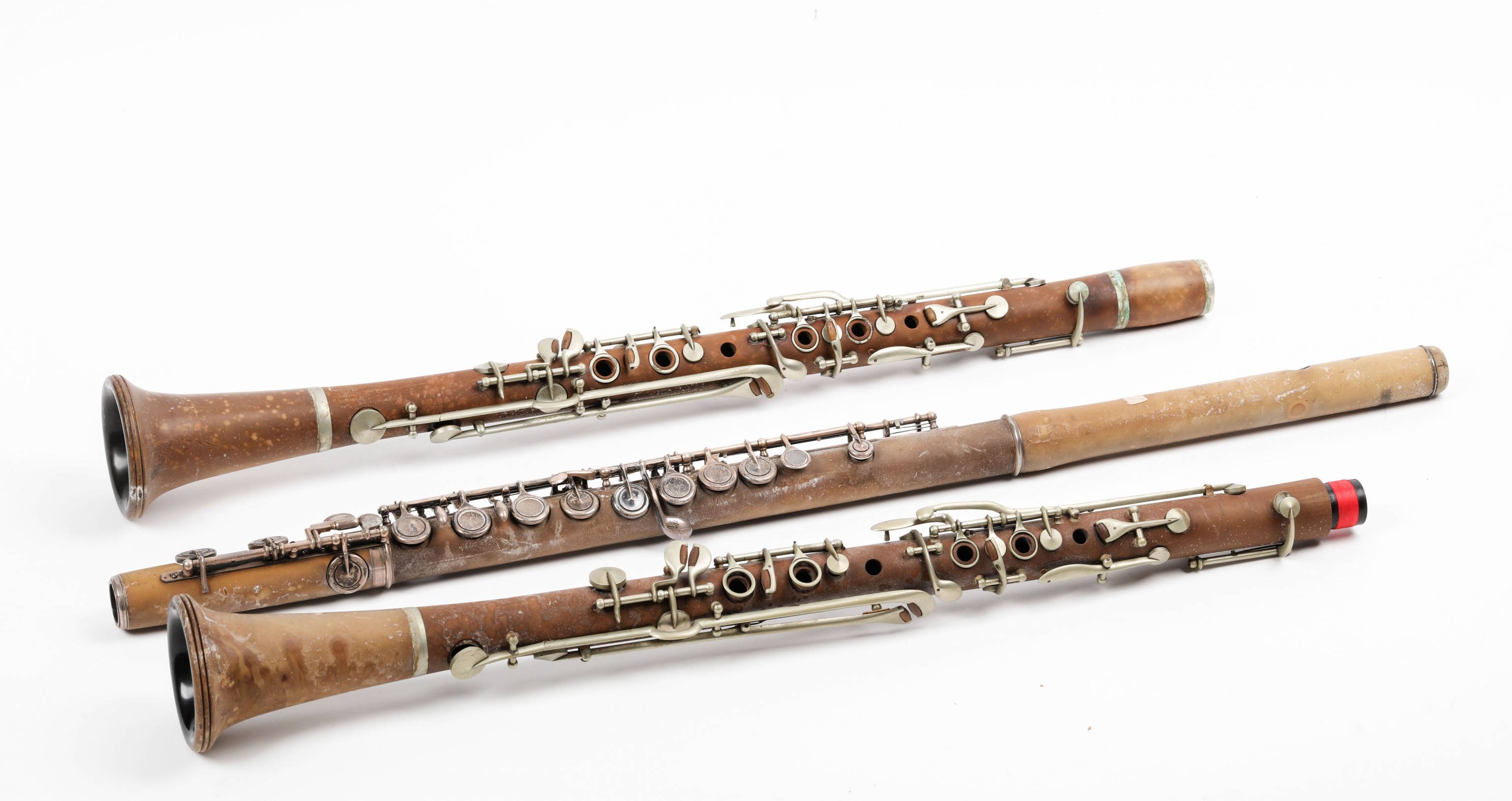 Lot de deux clarinettes et une flûte en bakélite.