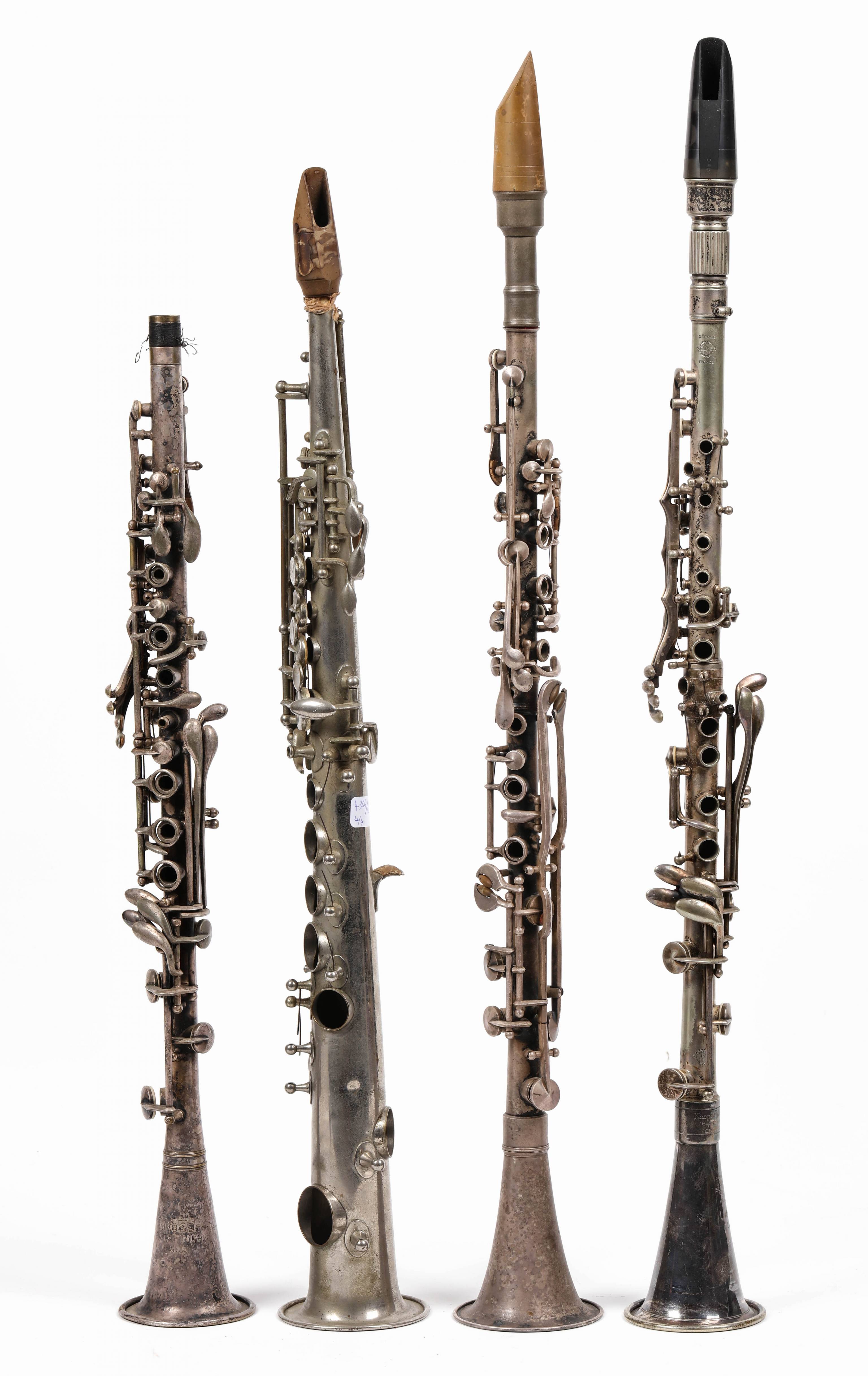 Lot de trois clarinettes en métal et un saxophone soprano.