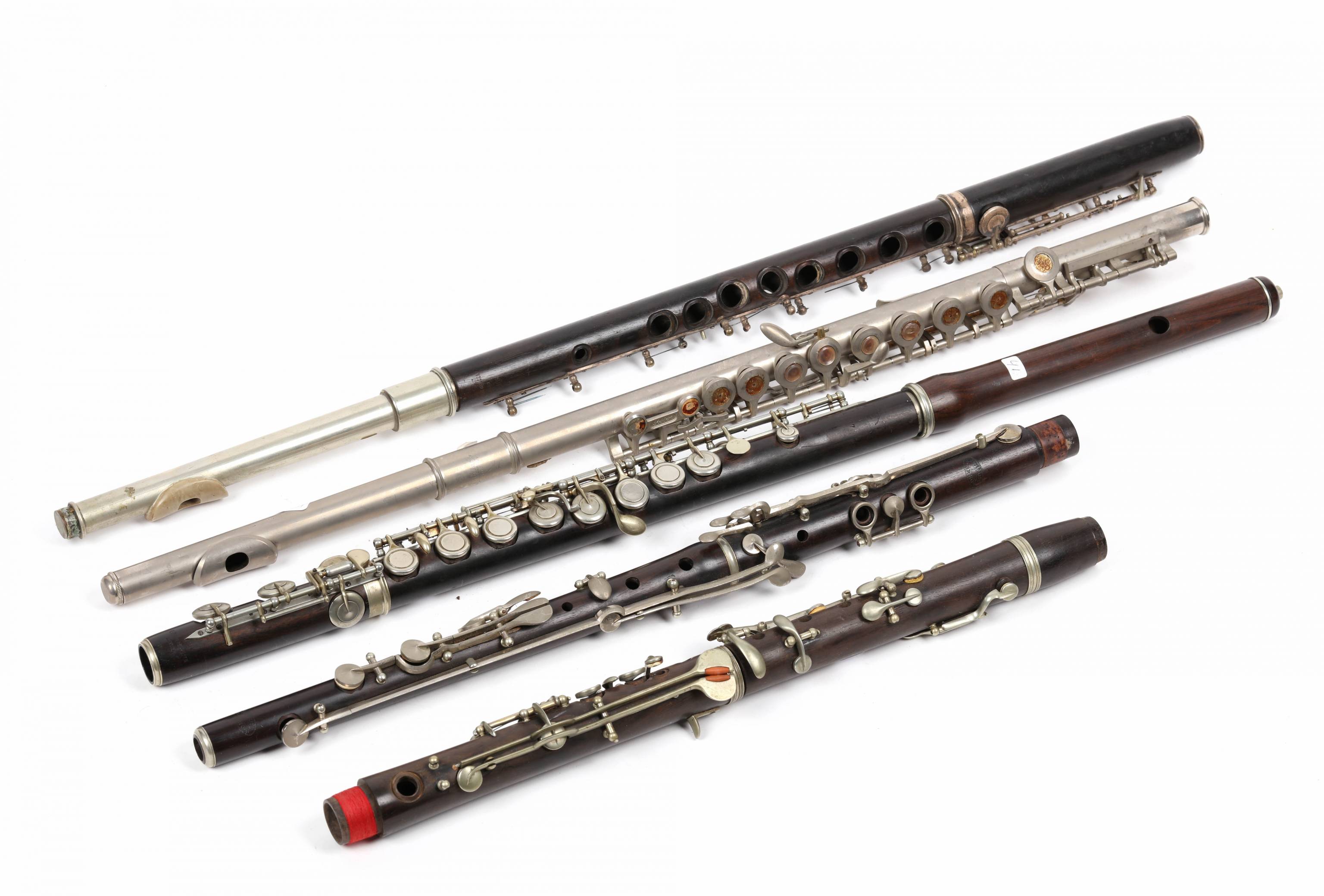 Lot de parties de flûtes traversières et clarinette. Ebène et maillechort. L'ensemble à restaurer. Manques.