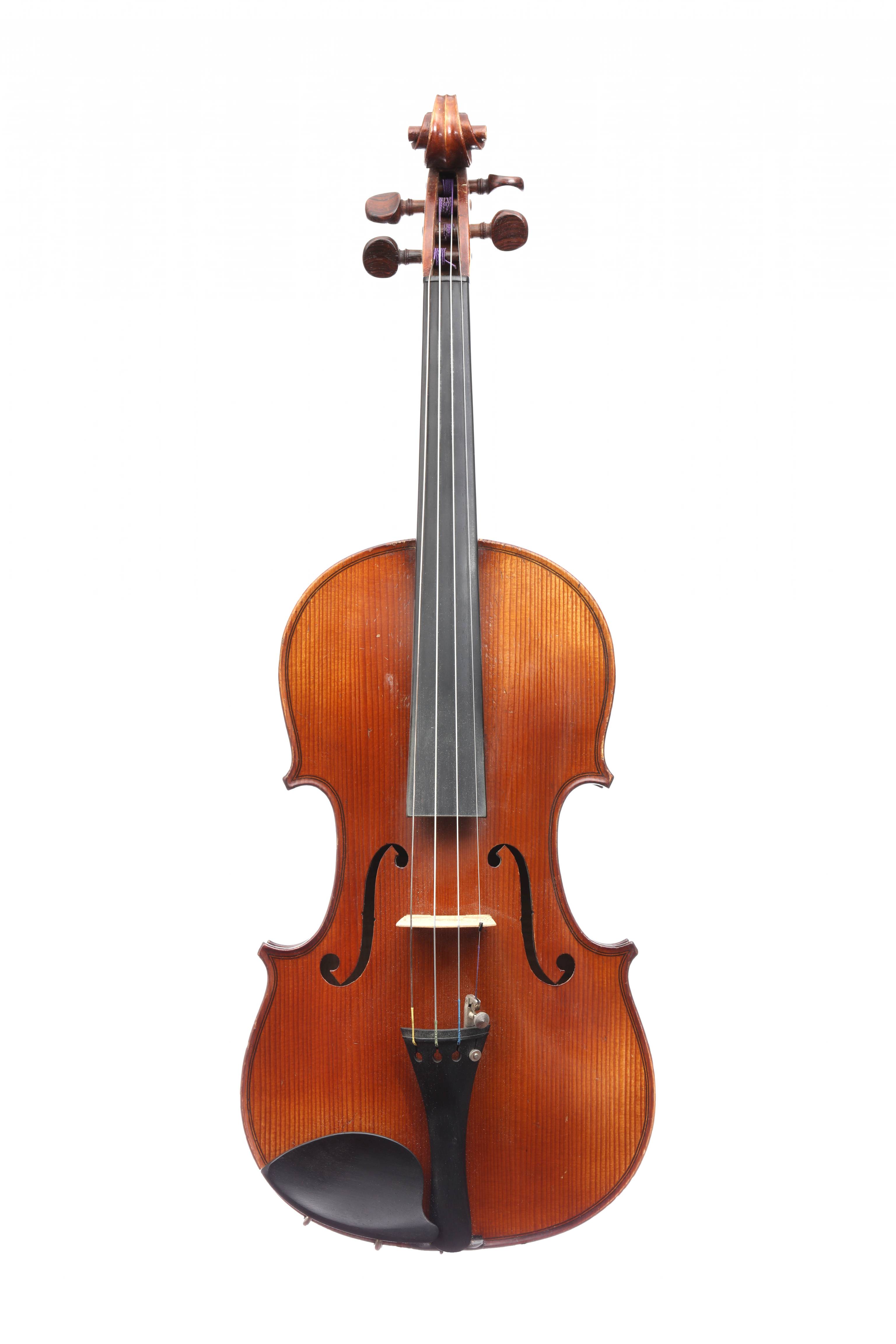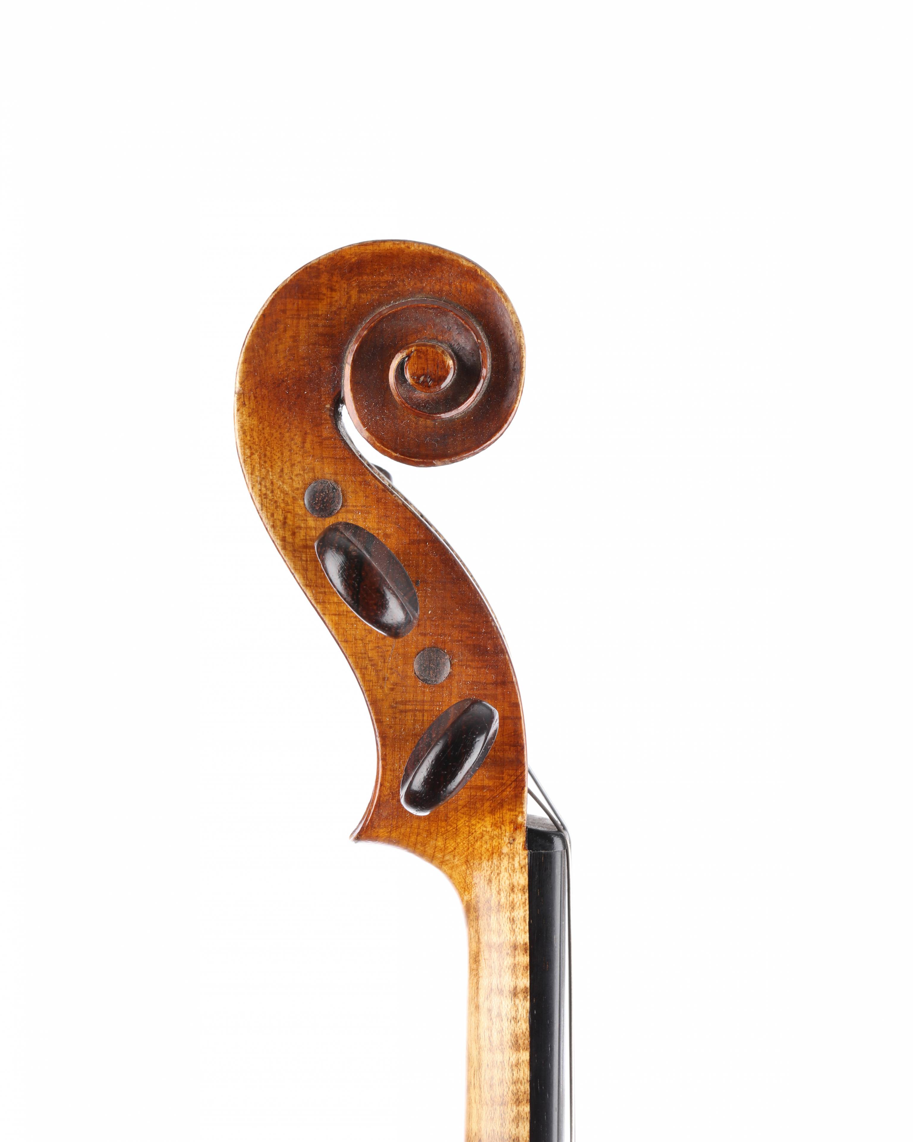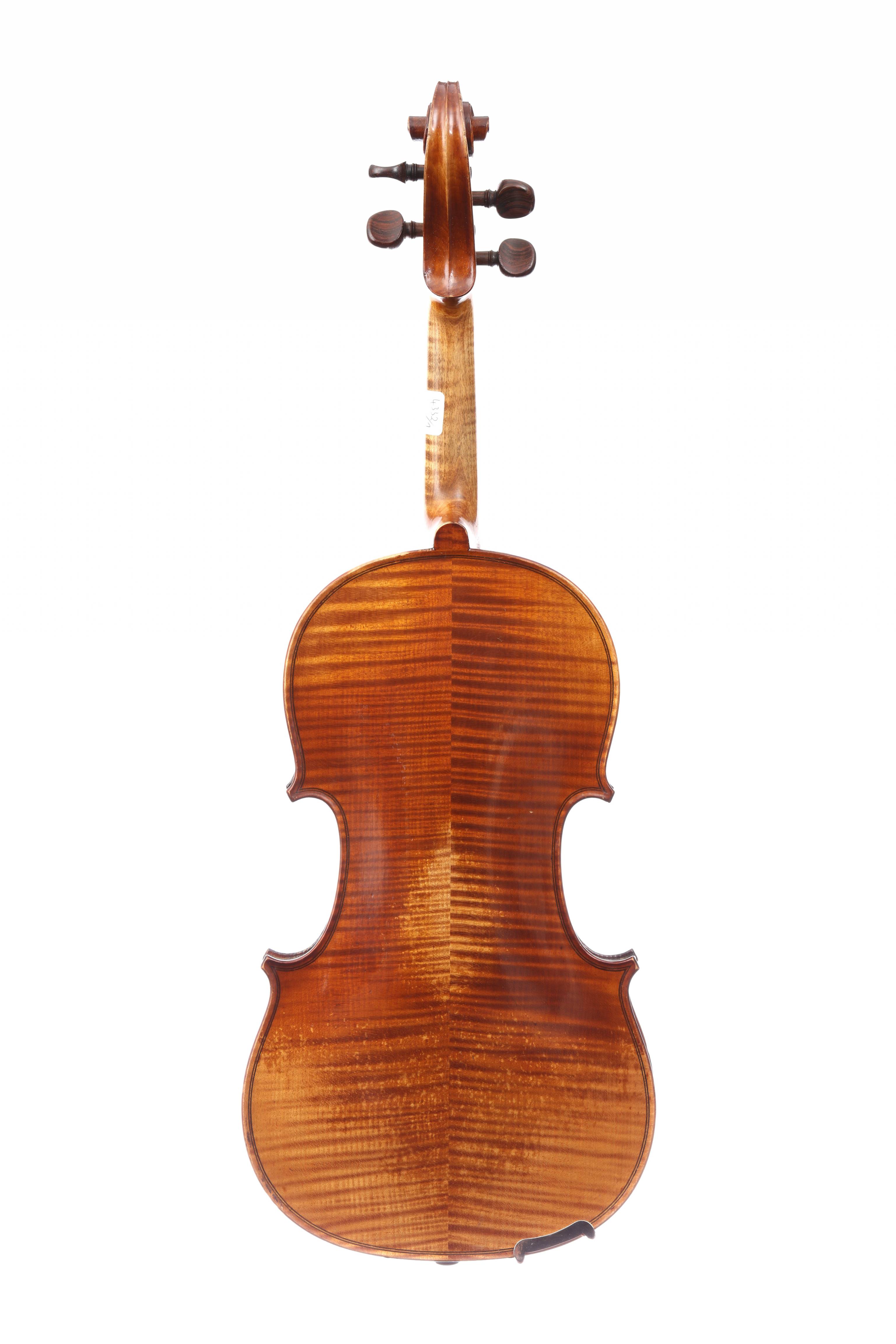 portant l'étiquette "Jacques Camurat. Luthier. 1985.", fait à Mirecourt. Fond de deux pièces en bel érable. Vernis brun clair sur fond doré. 356 mm.