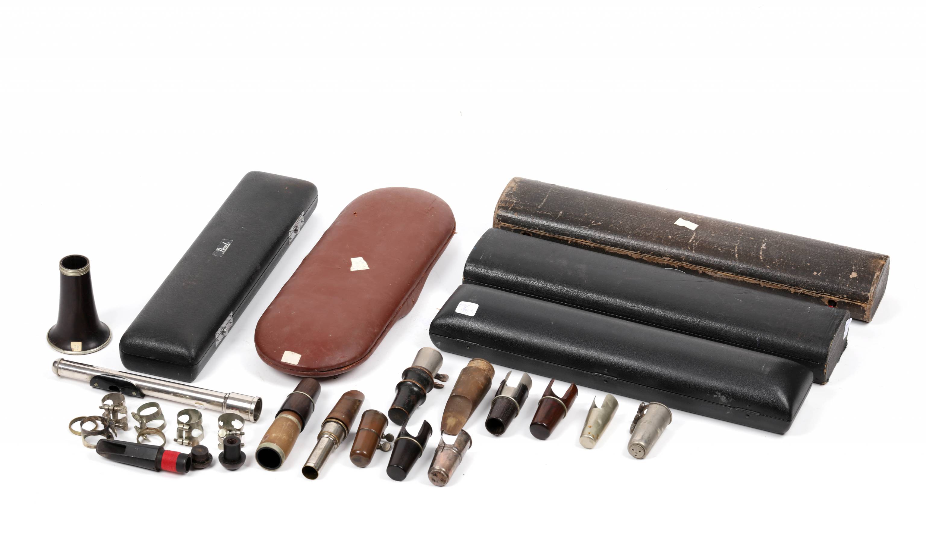 Lot de divers accessoires pour instruments à vent. Etuis, becs, ligatures...