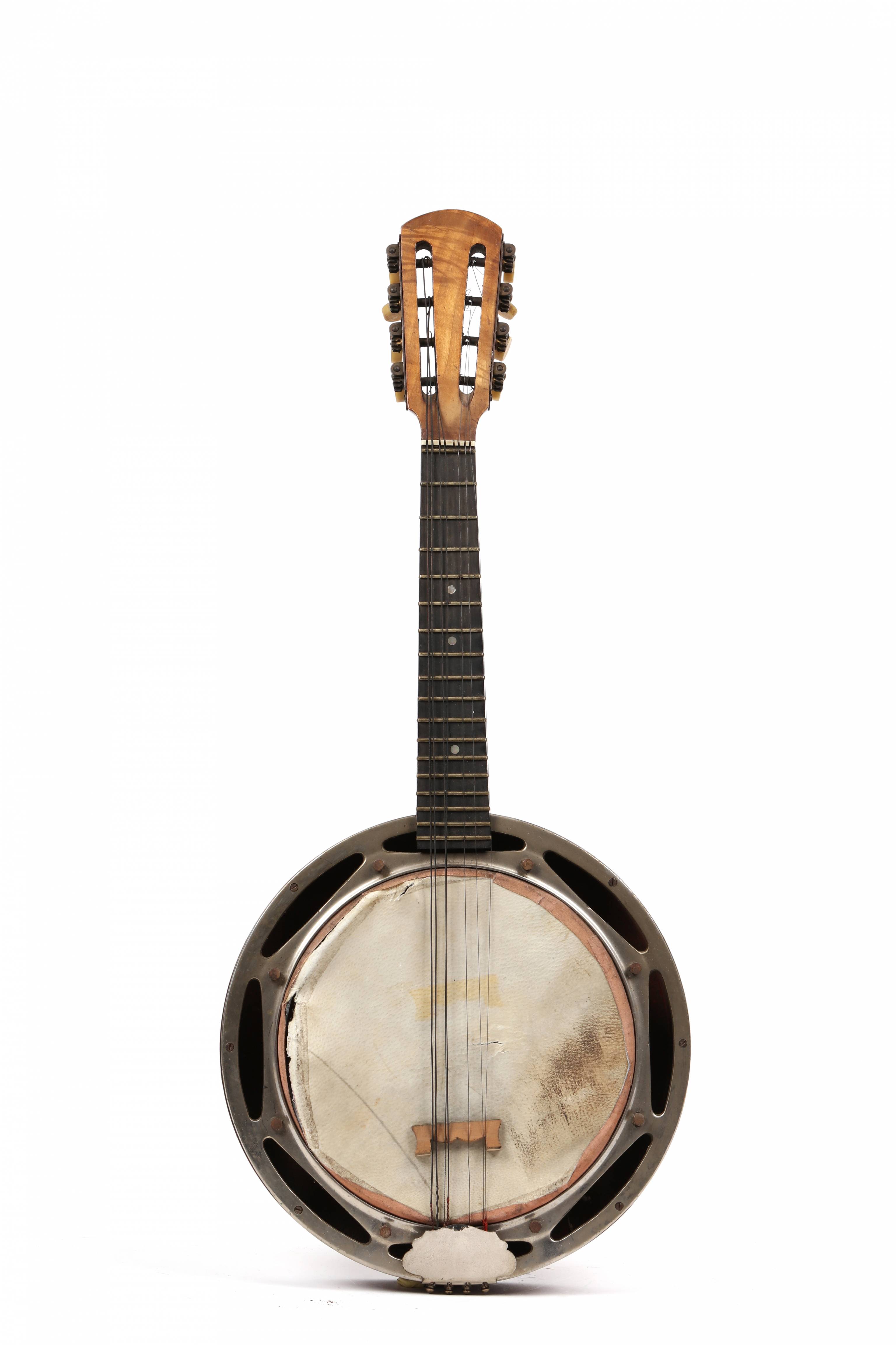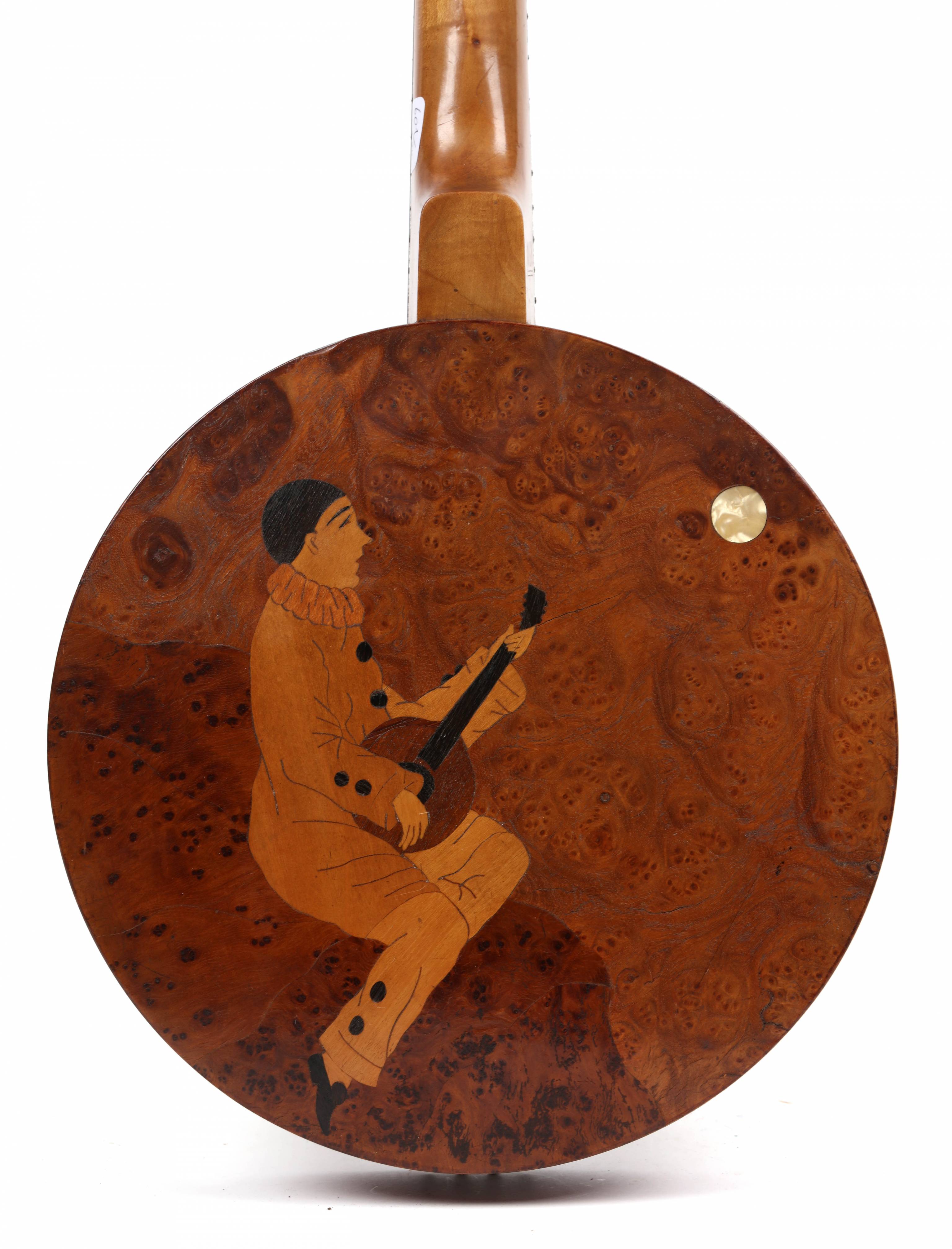 Fond en bois de placage moucheté, marqueté d'un pierrot jouant de la mandoline, regardant la lune. A restaurer.