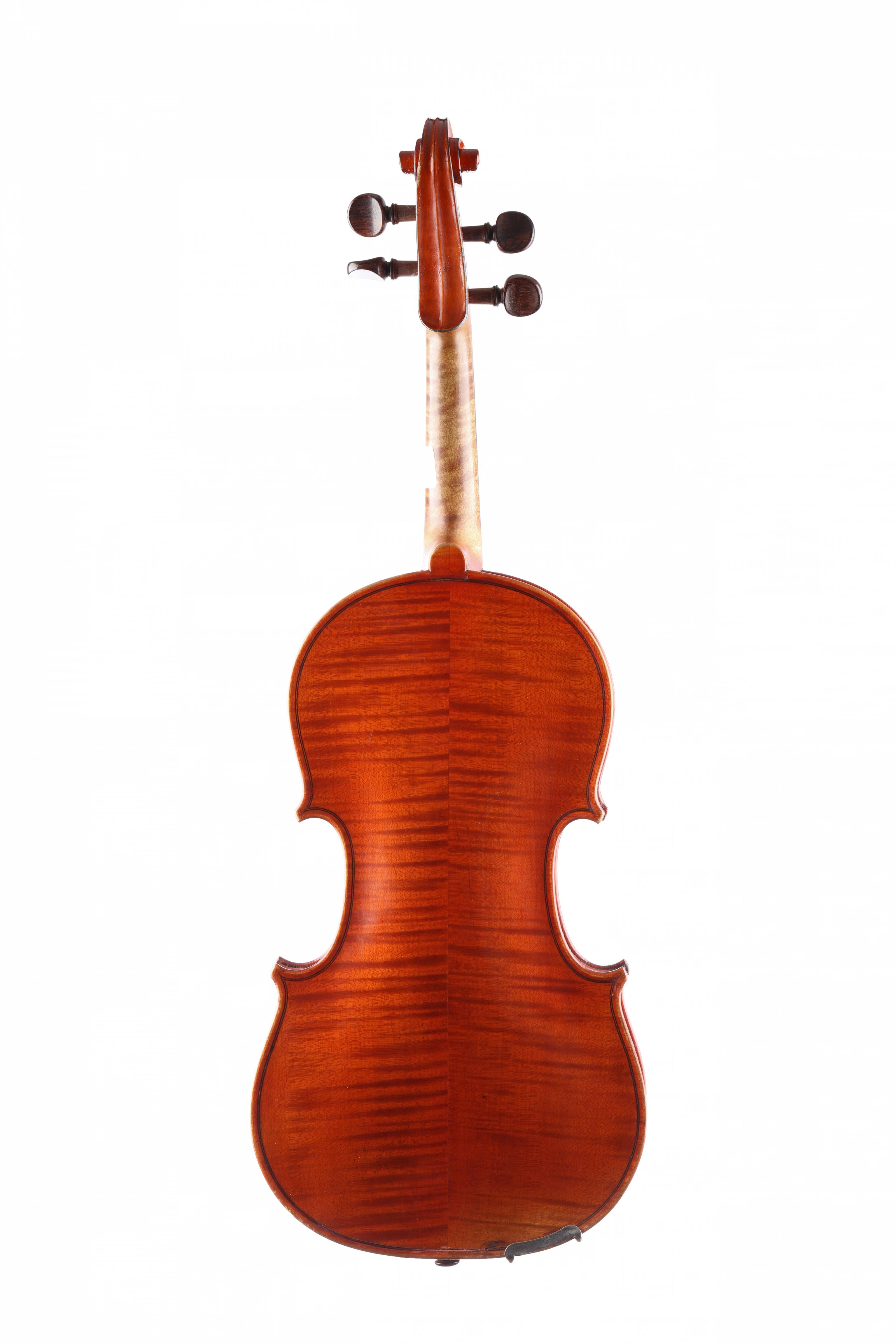 dont il porte l'étiquette originale "René Jacquemin 10 rue chanzy, Mirecourt/ 1930". Fond de deux pièces en bel érable ondé. Vernis orangé sur fond doré. 360 mm.