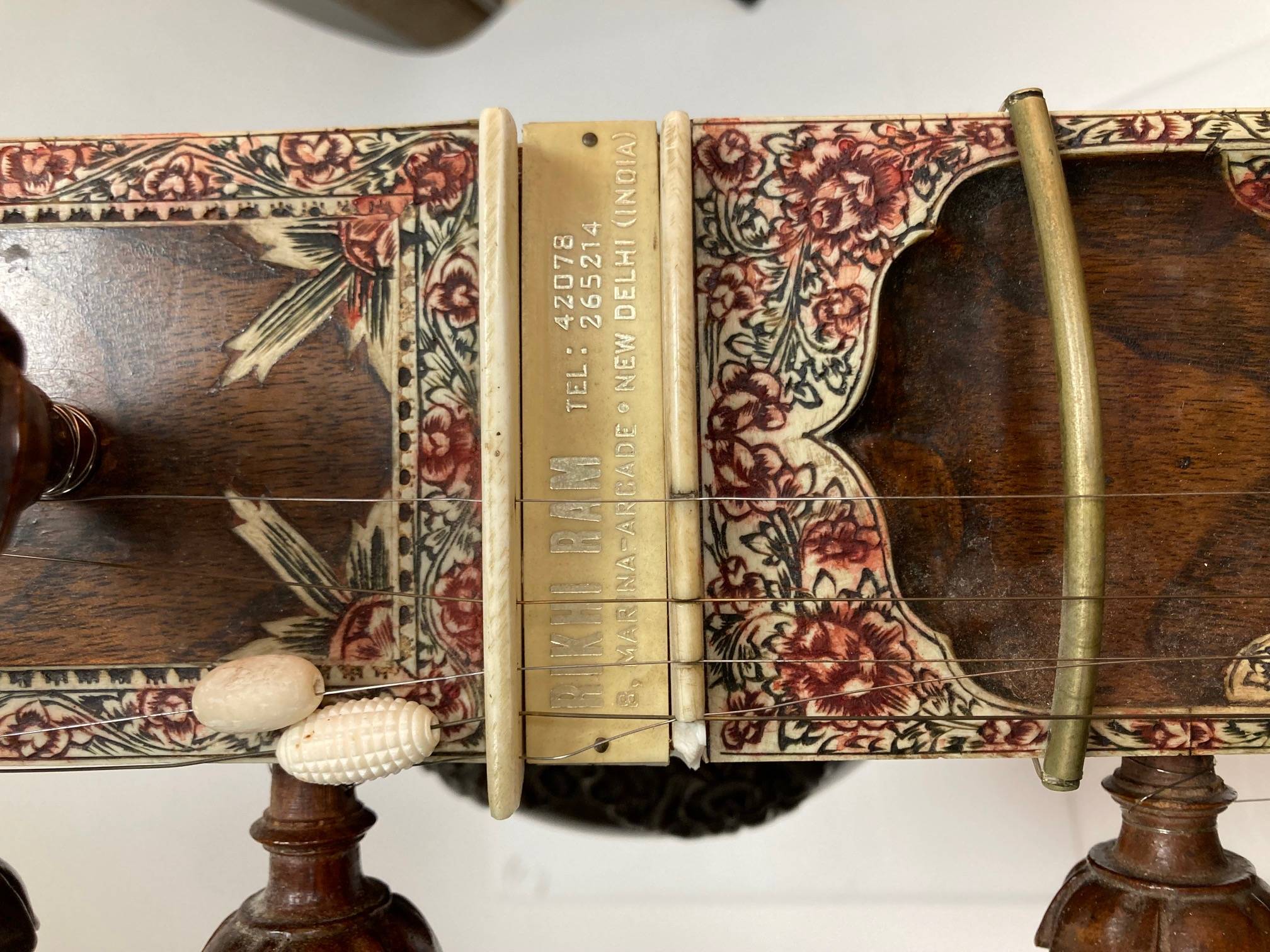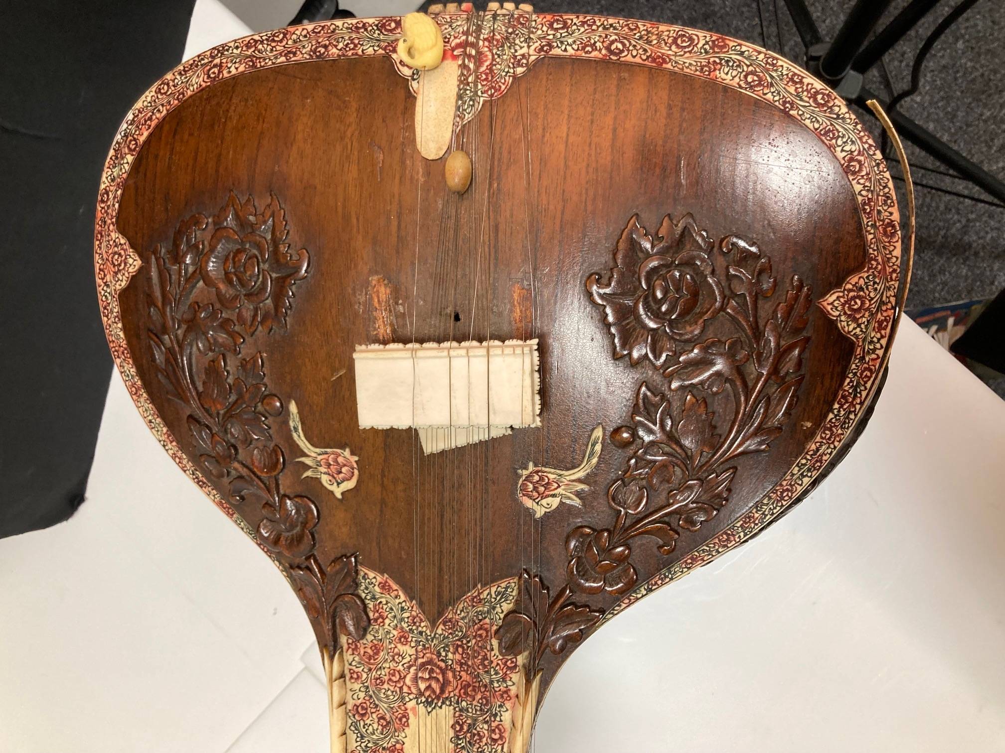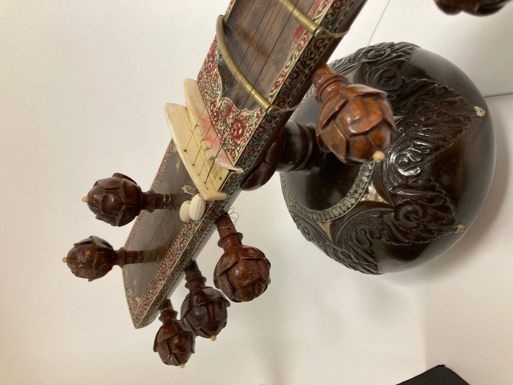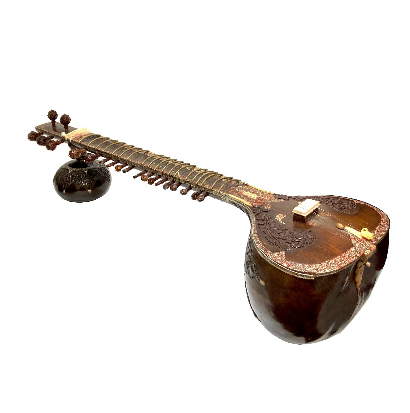 Intéressant luth moderne Indien "Vînâ Saraswati" finement sculpté et incrusté. Portant le nom de la déesse hindoue Saraswati. Caisse sculptée, en calebasse.