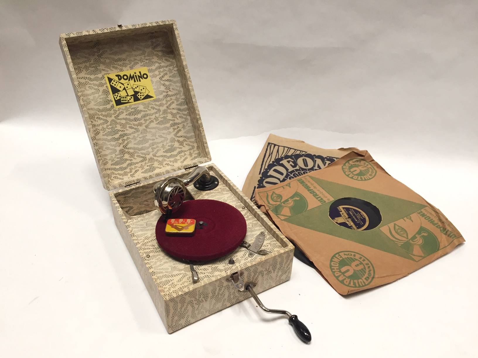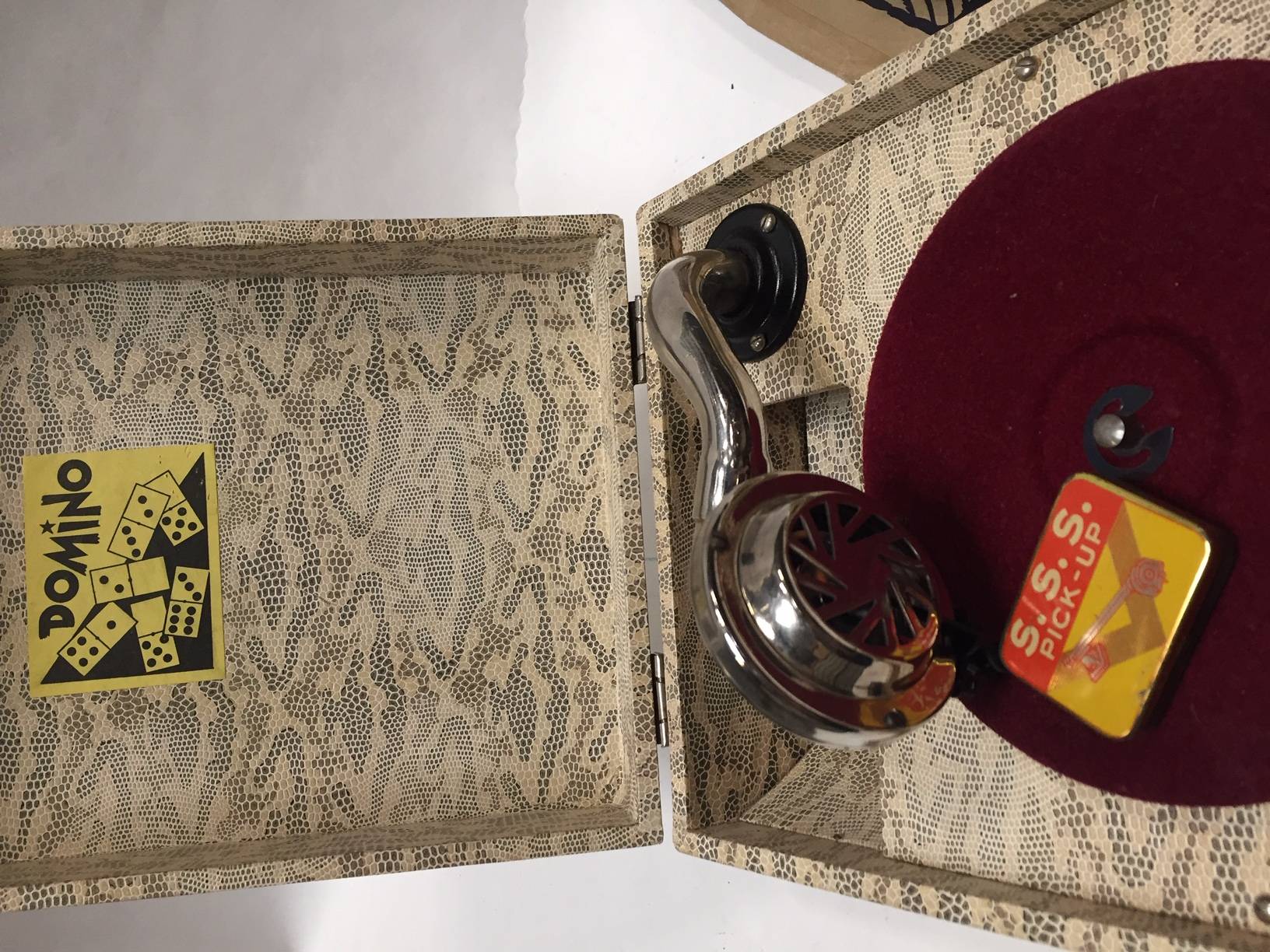 Phonographe valise. Pavillon incorporé. Avec aiguilles et manivelles.