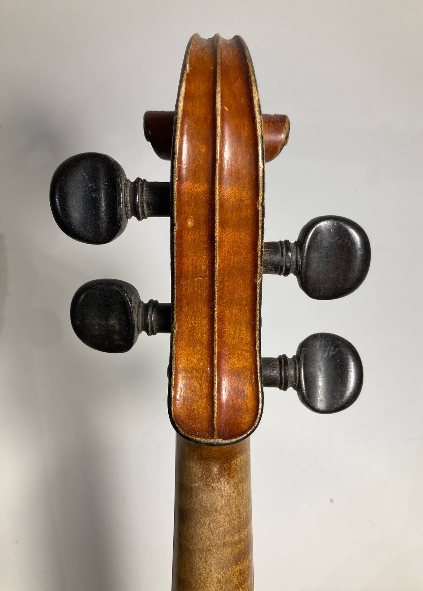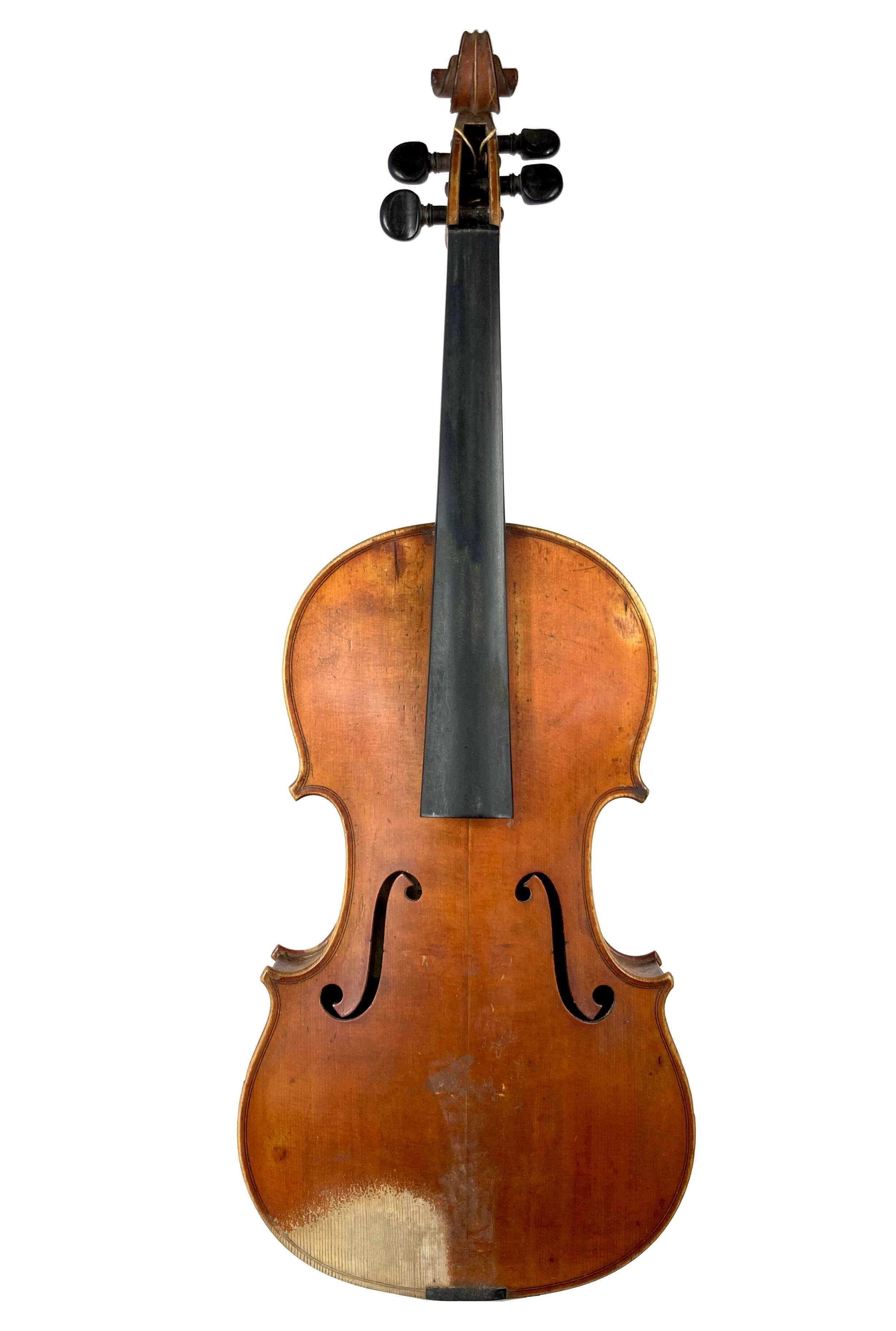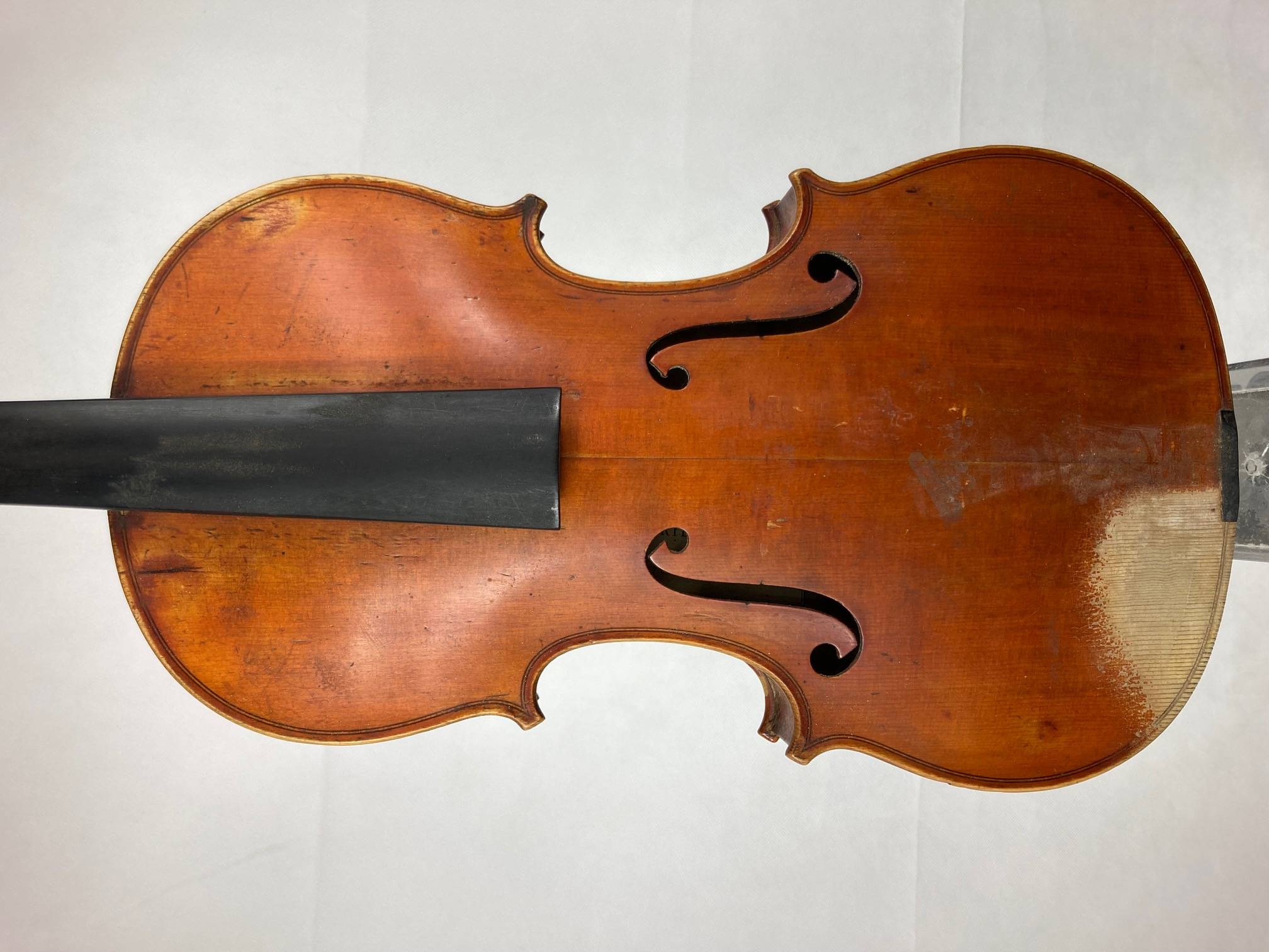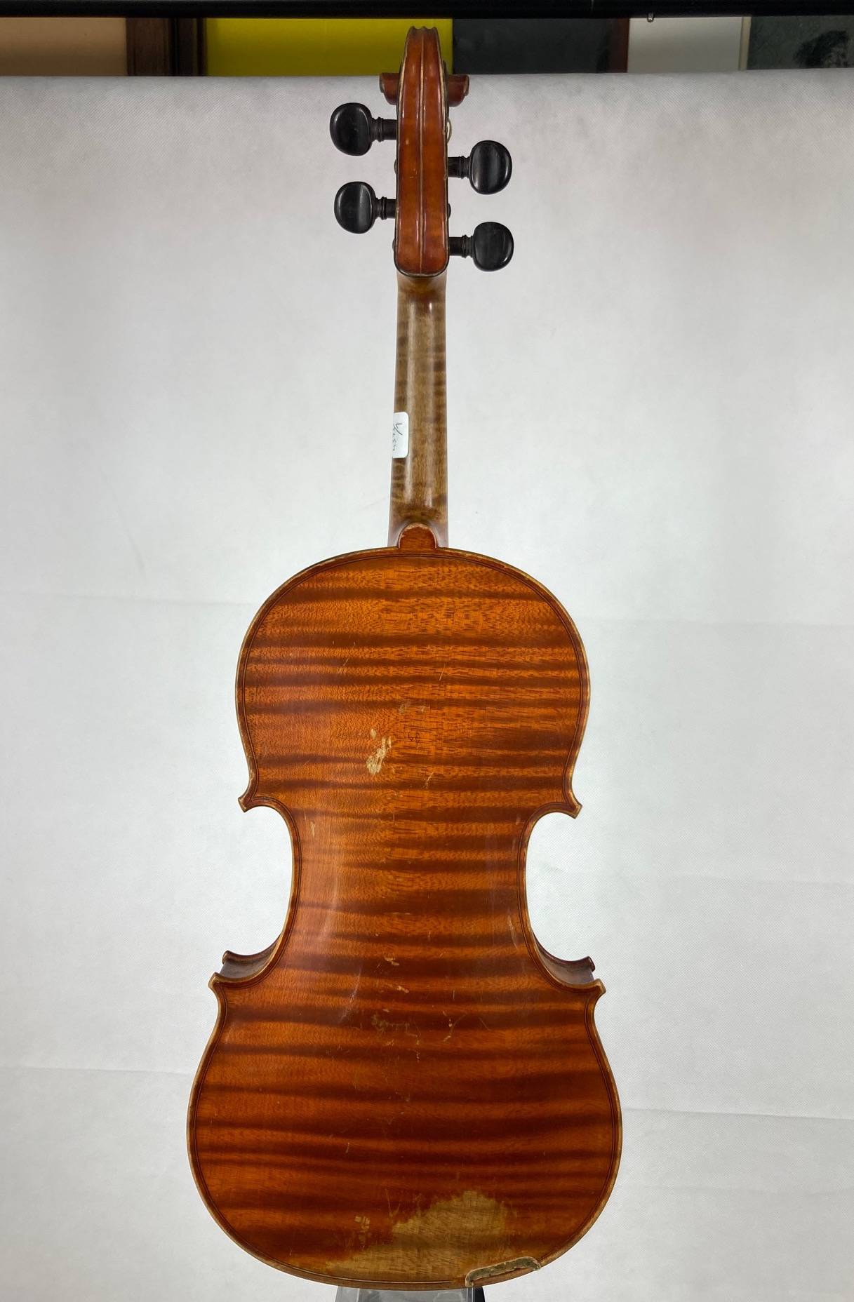 portant l'étiquette : "LABERTE-HUMBERT PARIS. N°548. Année 1882." Fond d'une pièce en bel érable ondé. Vernis brun orangé sur fond doré. Usures et traces de vers sur l'éclisse. 357 mm. Avec étui de table et archet d'étude.