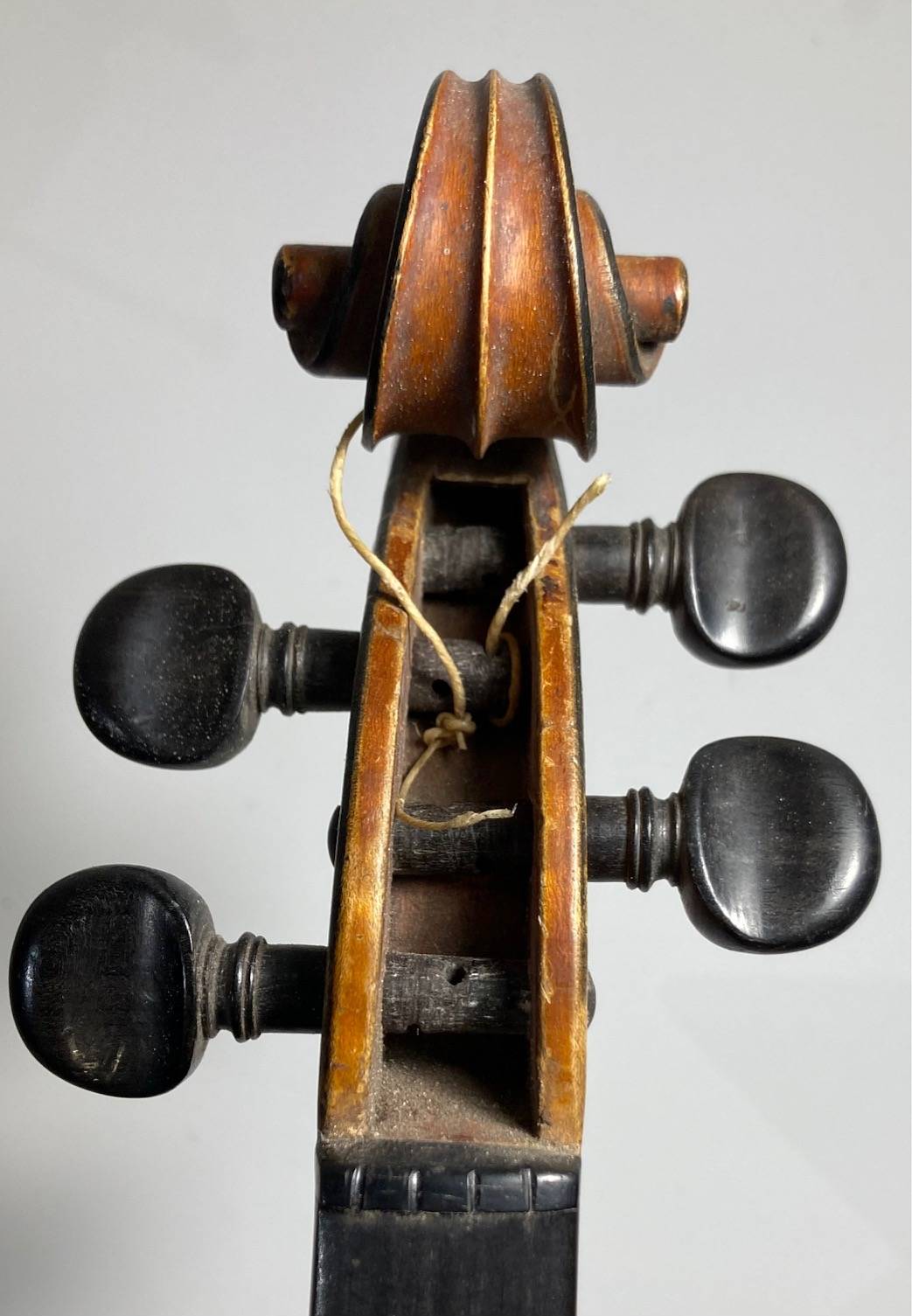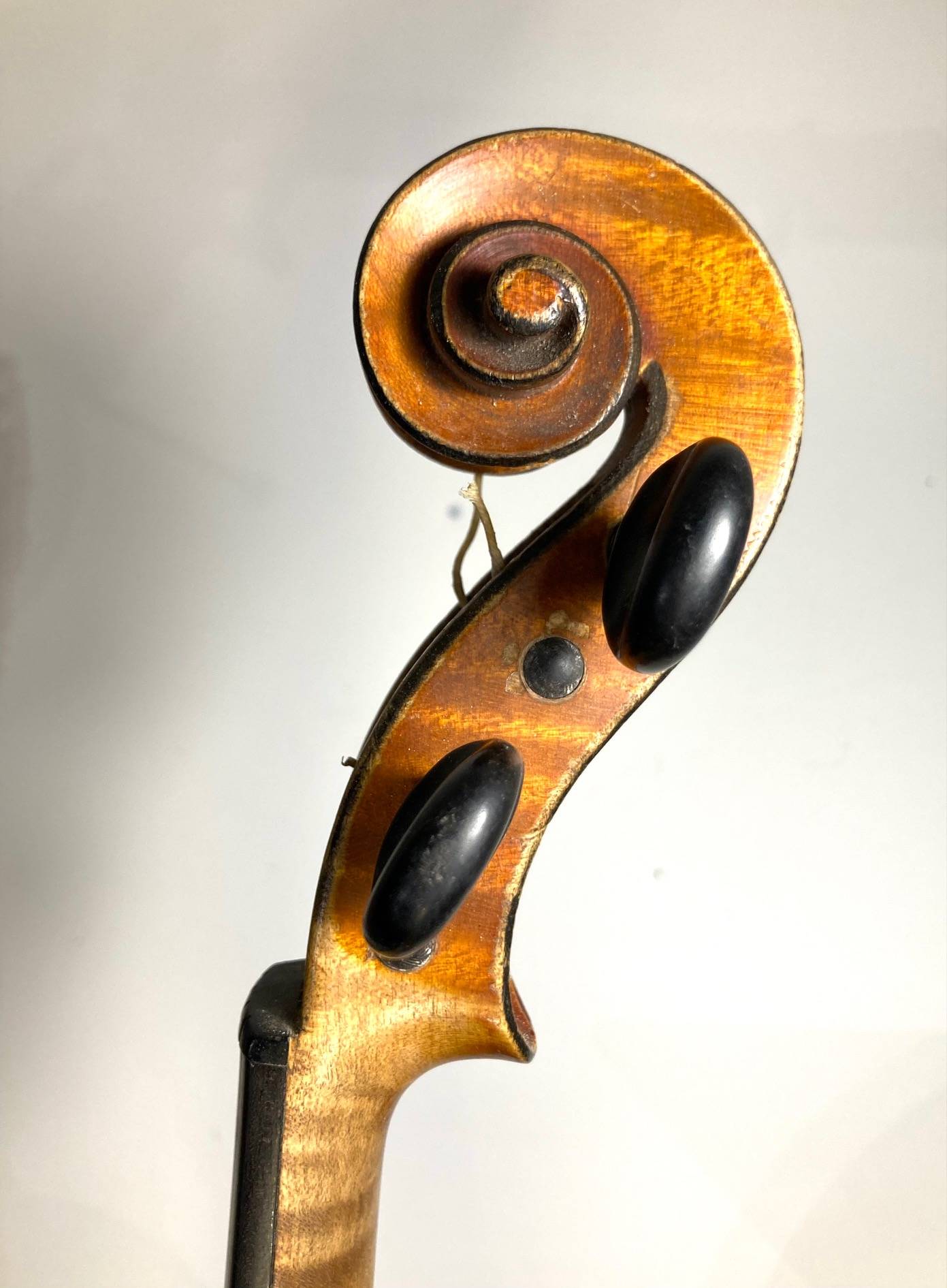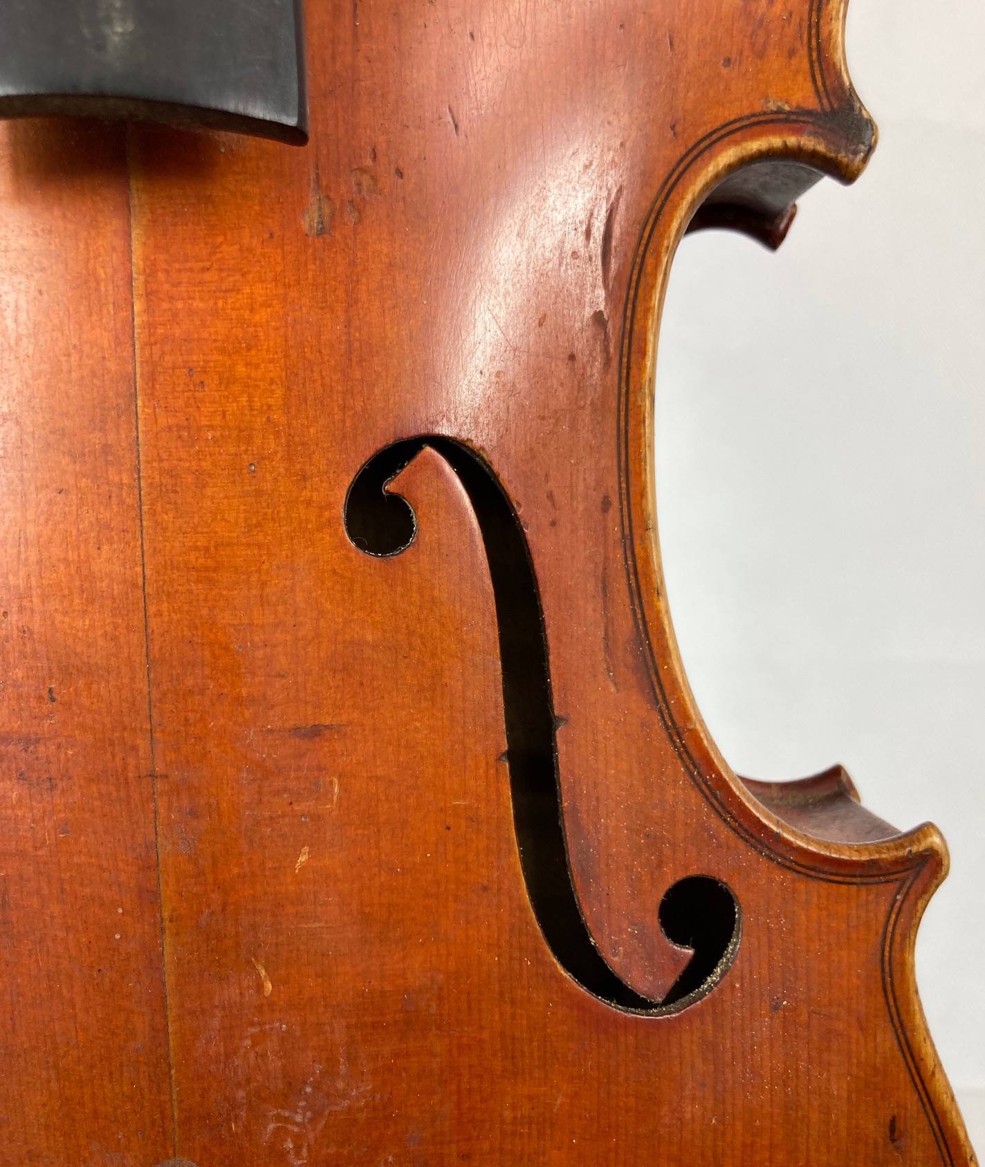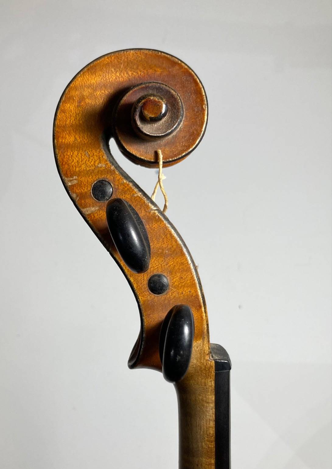 portant l'étiquette : "LABERTE-HUMBERT PARIS. N°548. Année 1882." Fond d'une pièce en bel érable ondé. Vernis brun orangé sur fond doré. Usures et traces de vers sur l'éclisse. 357 mm. Avec étui de table et archet d'étude.