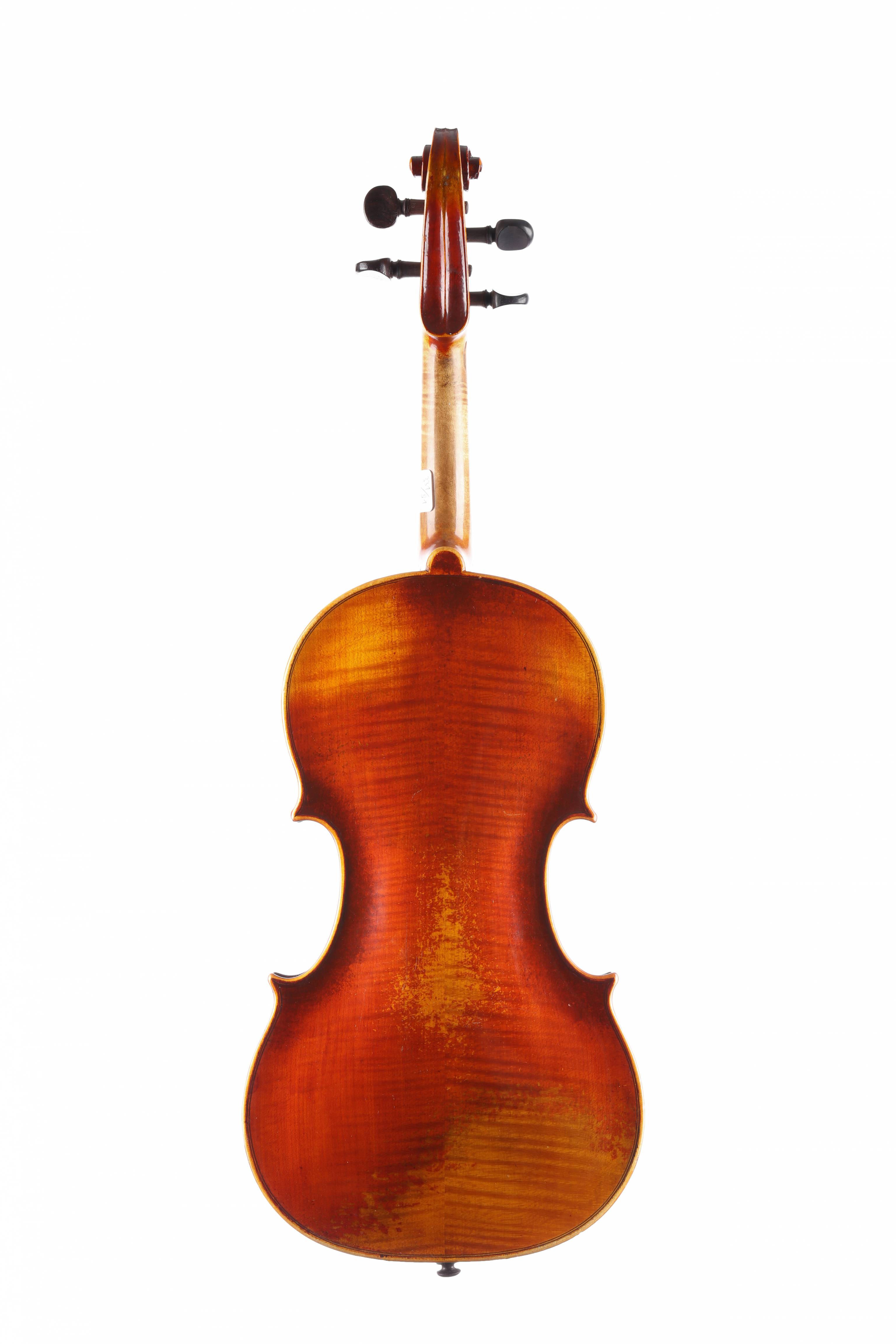 Fond de deux pièces en érable. Vernis brun rouge sur fond doré. Avec boite et deux archets. Fond de deux pièces. 359 mm.