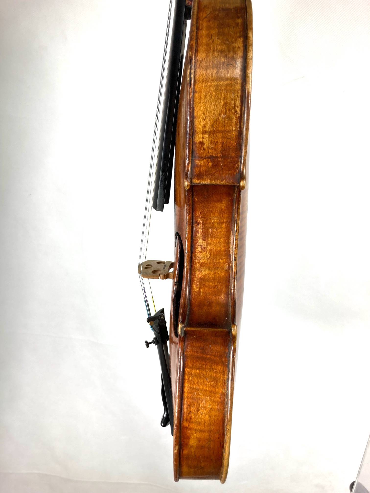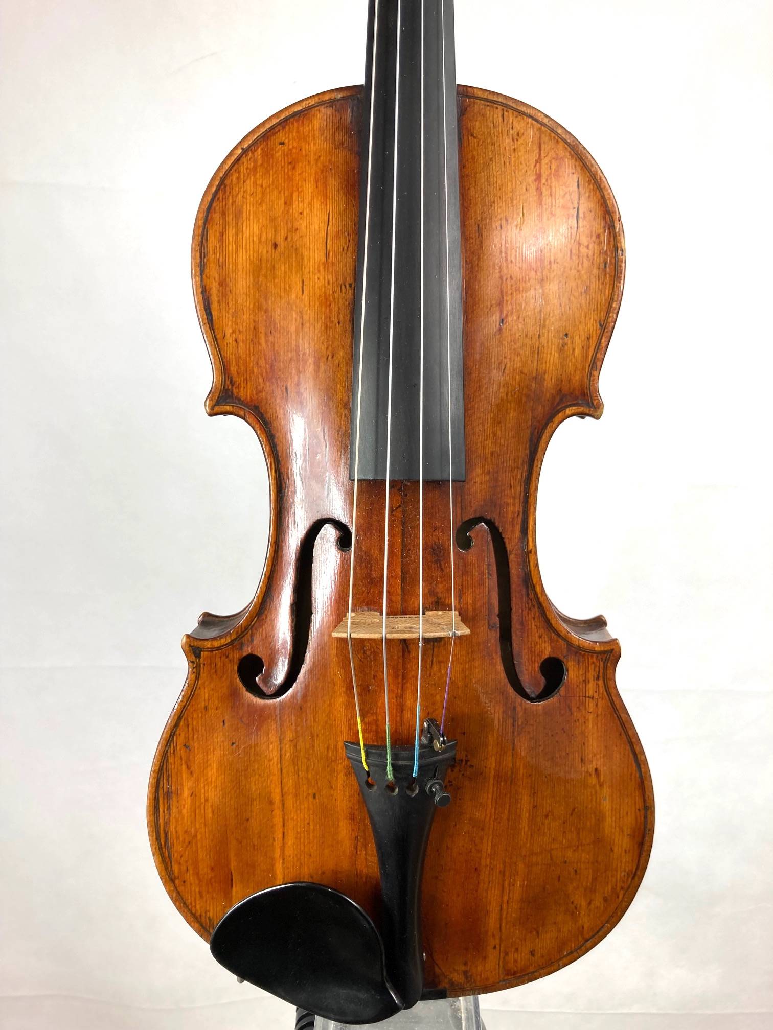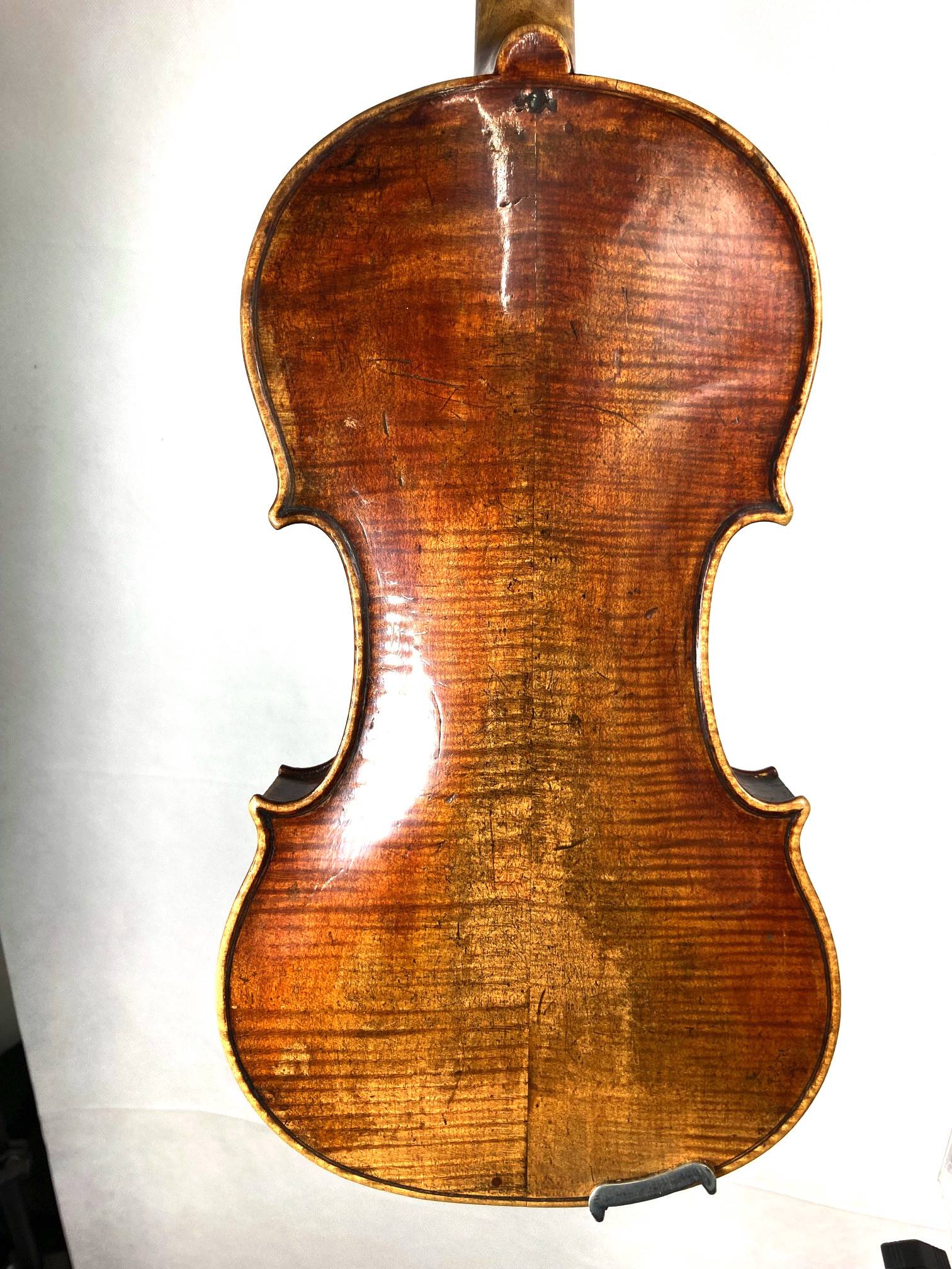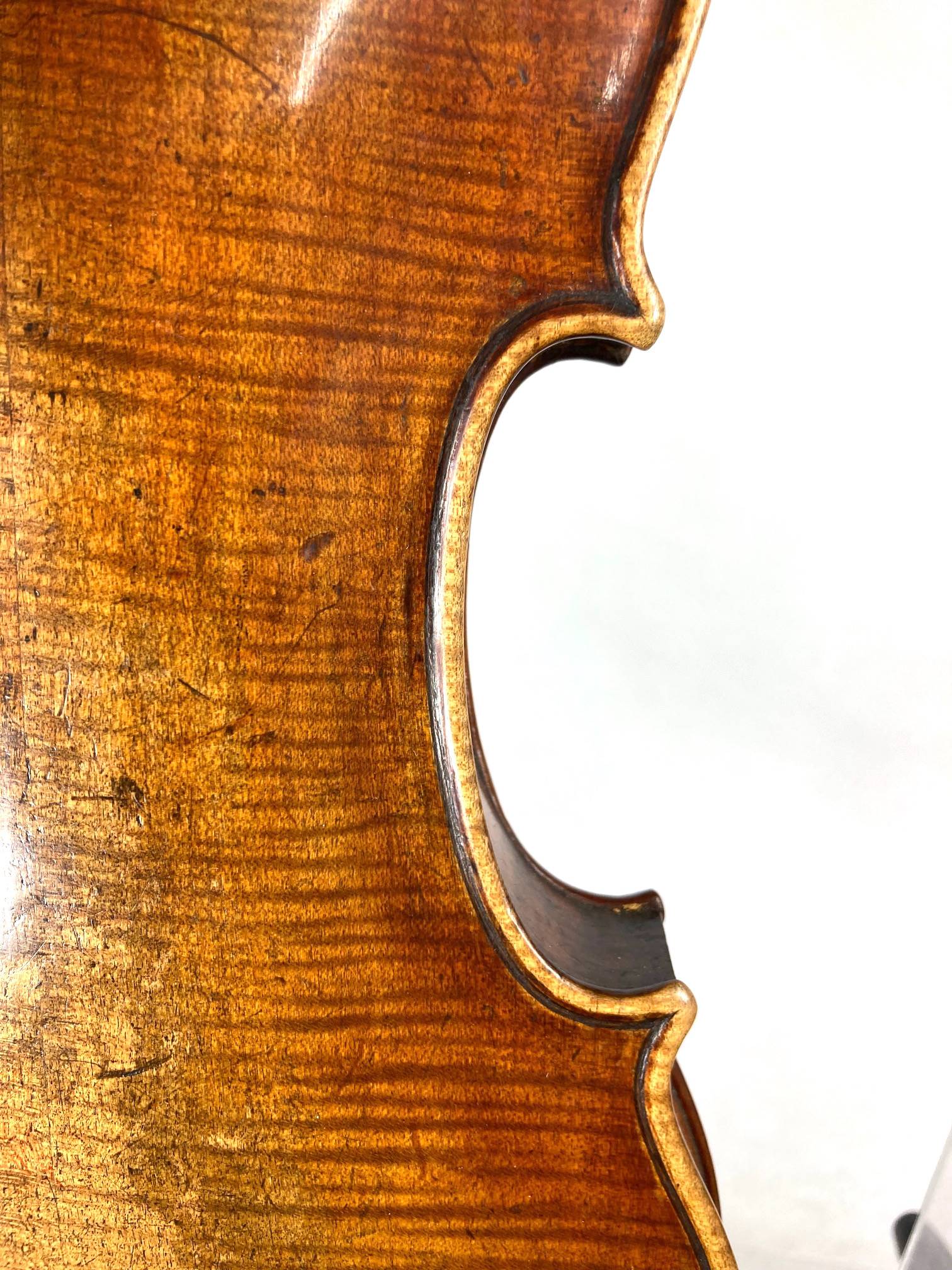 Typique violon de l'école Anglaise du début XIXe. Fond de deux pièces en bel érable. Table en épicéa avec diverses cassures restaurées. Vernis brun sur fond doré. 354 mm.