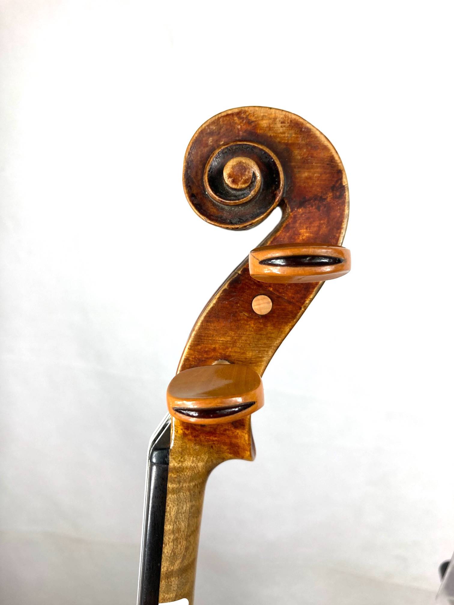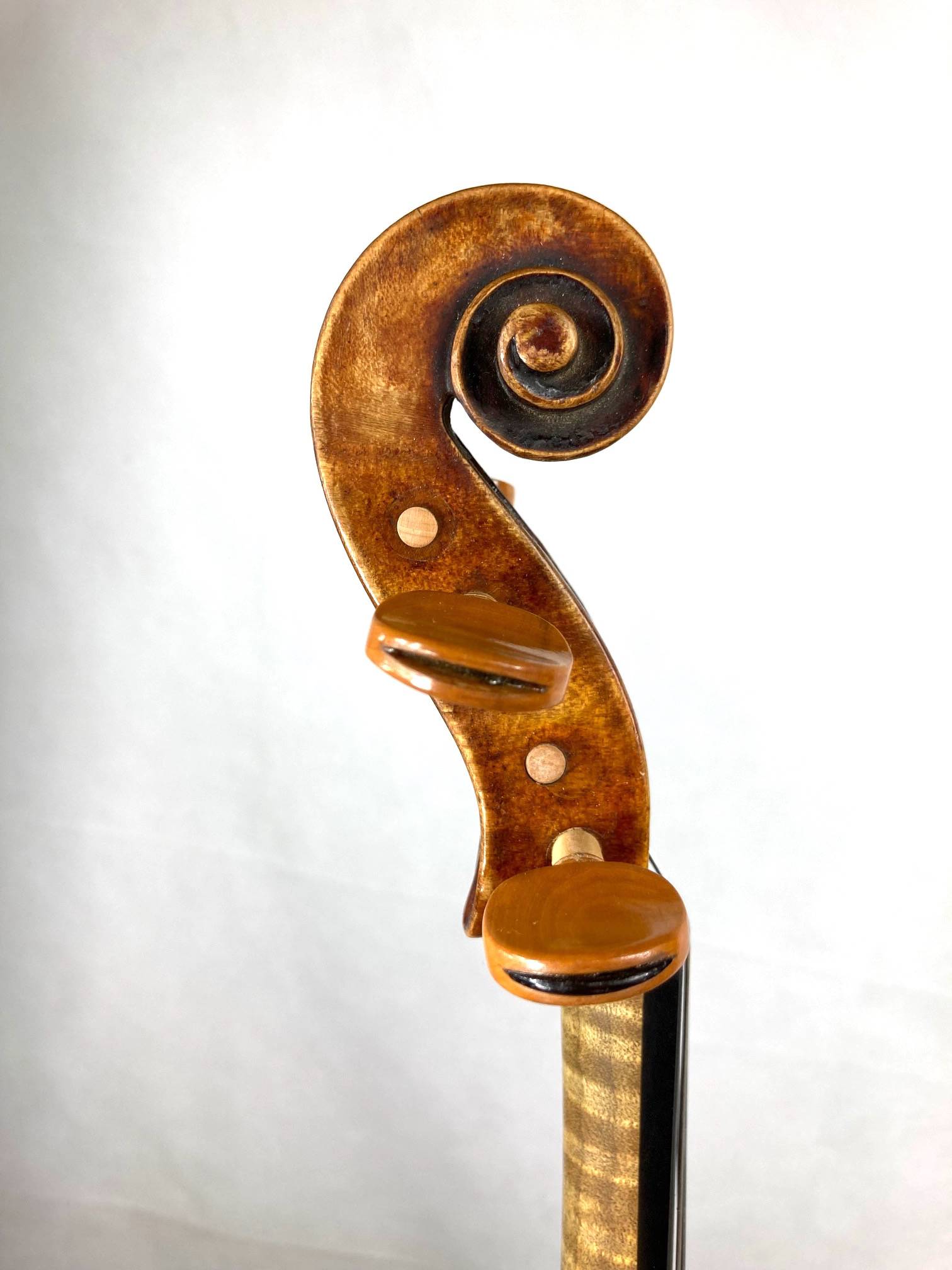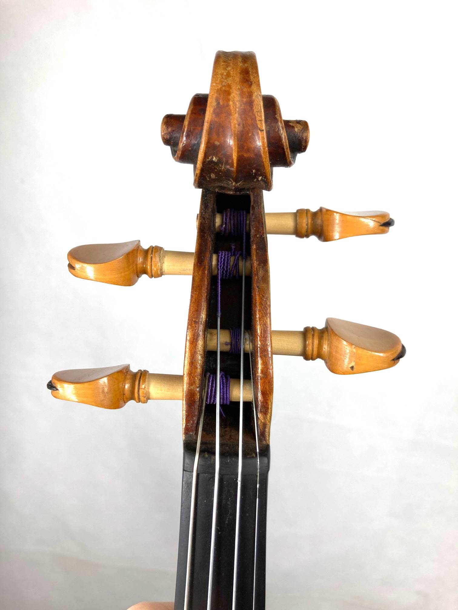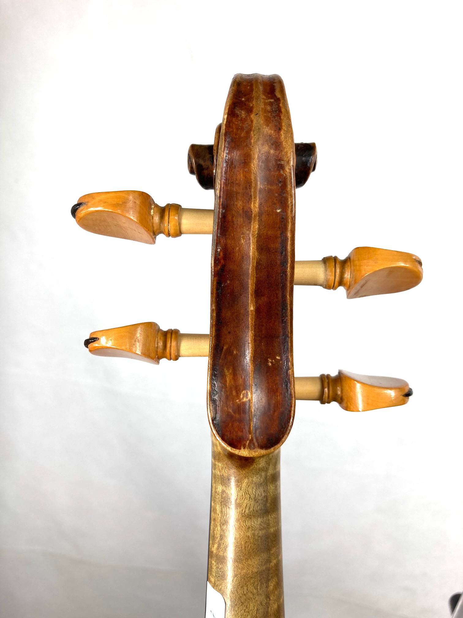 Typique violon de l'école Anglaise du début XIXe. Fond de deux pièces en bel érable. Table en épicéa avec diverses cassures restaurées. Vernis brun sur fond doré. 354 mm.