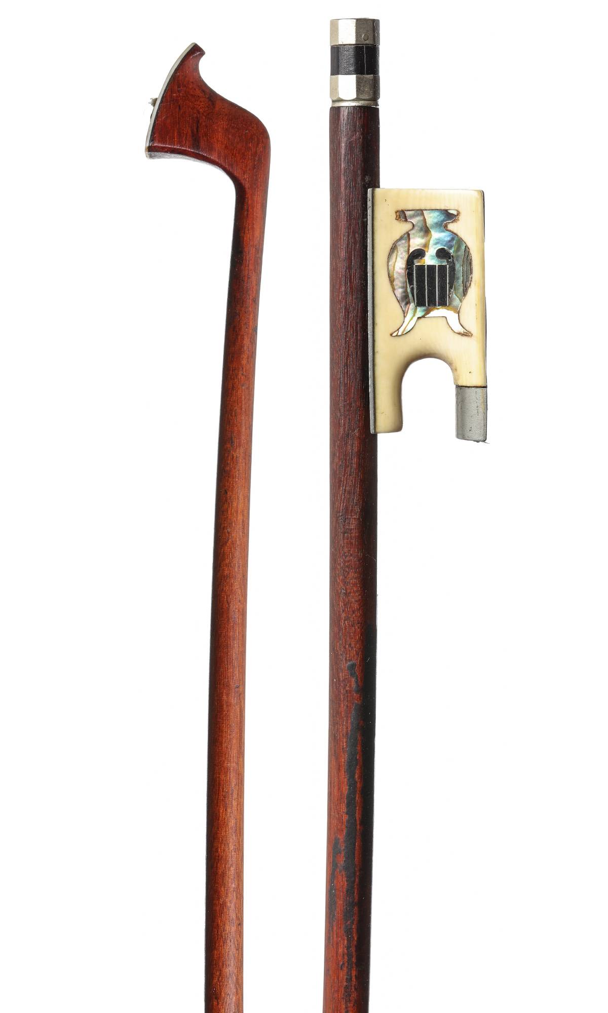 Intéressant archet fin XIXe. Hausse en ivoire, et bouton d'un autre auteur, monté maillechort.Baguette ronde en bois de pernambouc. 716 mm. 51 g sans mèche, ni garniture.