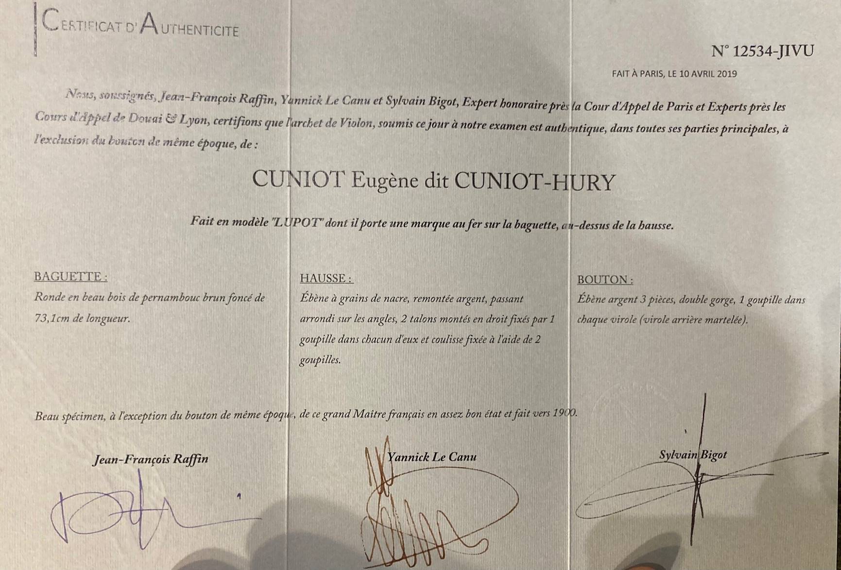 French violin bow by CUNIOT HURY bearing the stamp "LUPOT". François RAFFIN certificate.