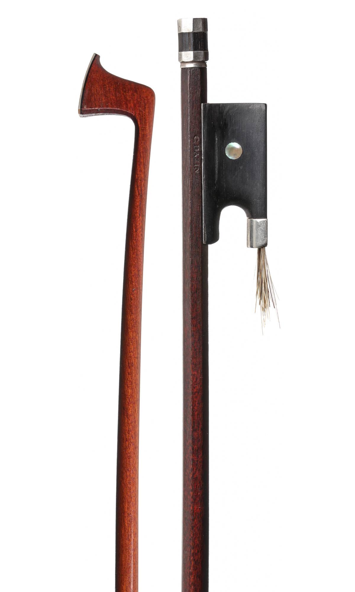portant la marque au fer "C.BAZIN". Baguette ronde en bois de pernambouc. Hausse ébène, monté argent. Cassure à la hausse. 730 mm. 50 g.
