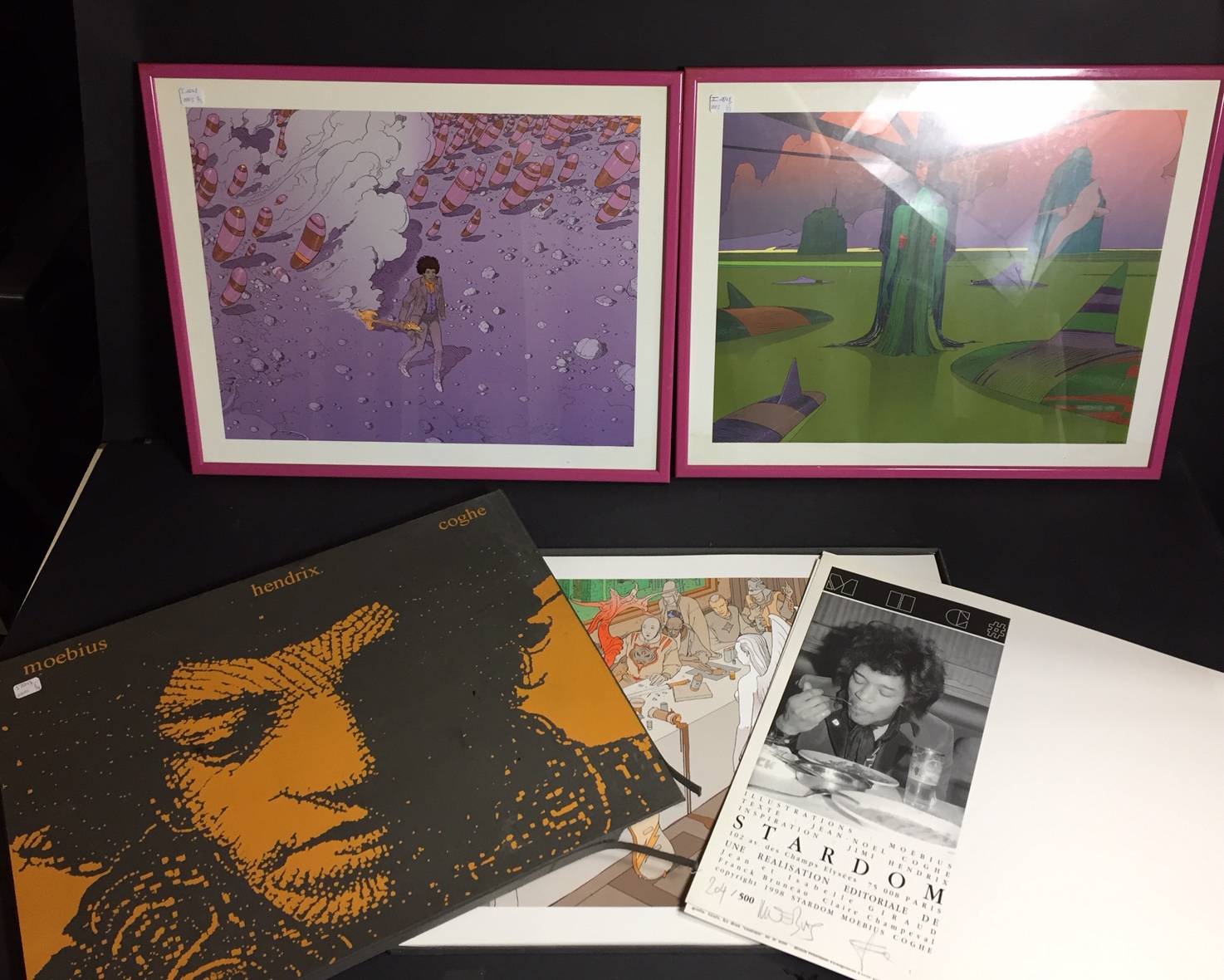 Un coffret illustré par Moebius sur Jimi HENDRIX. Numéroté 204/500 et signé. 10 sérigraphies dont deux encadrées. Coffret abimé.