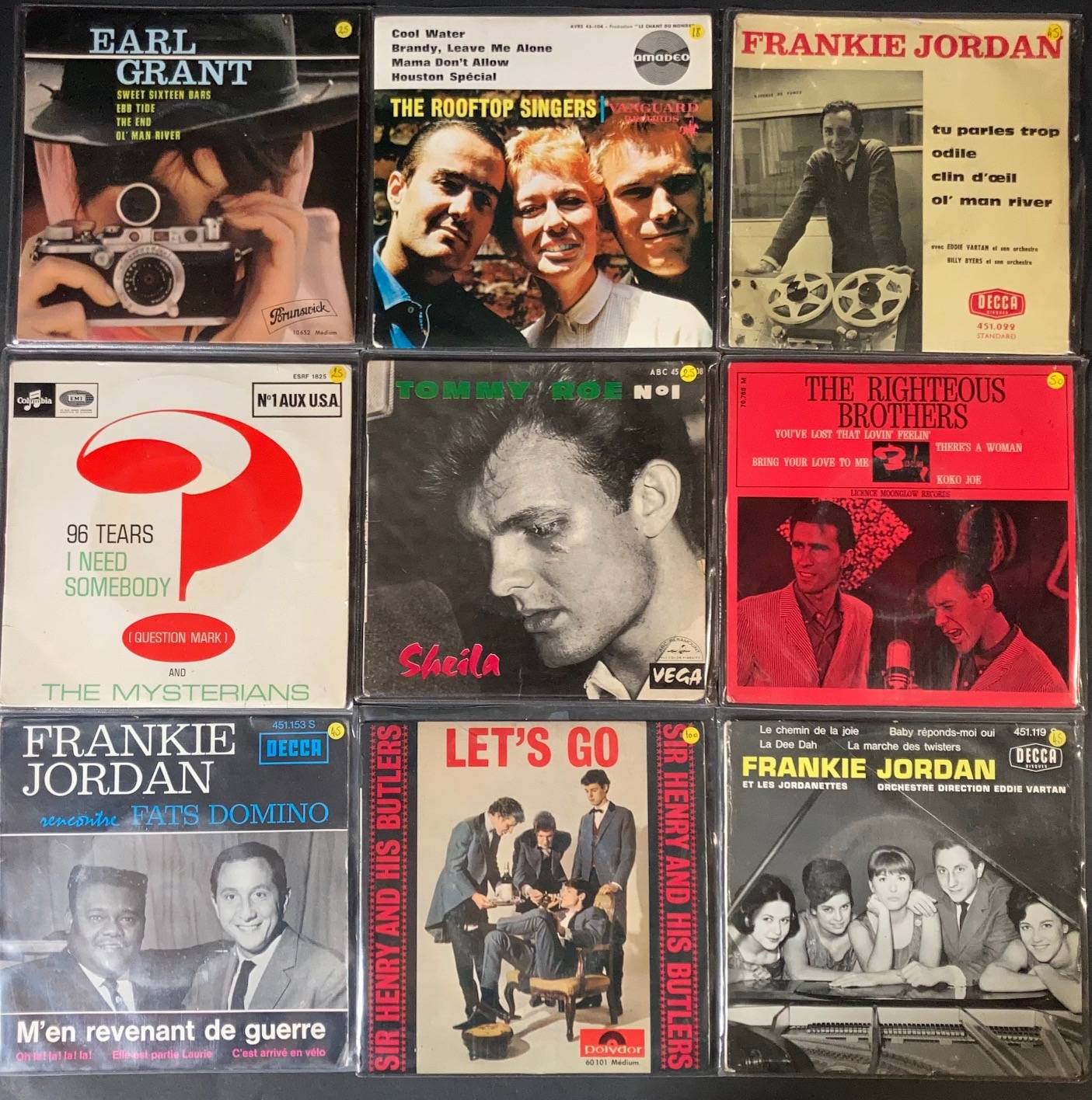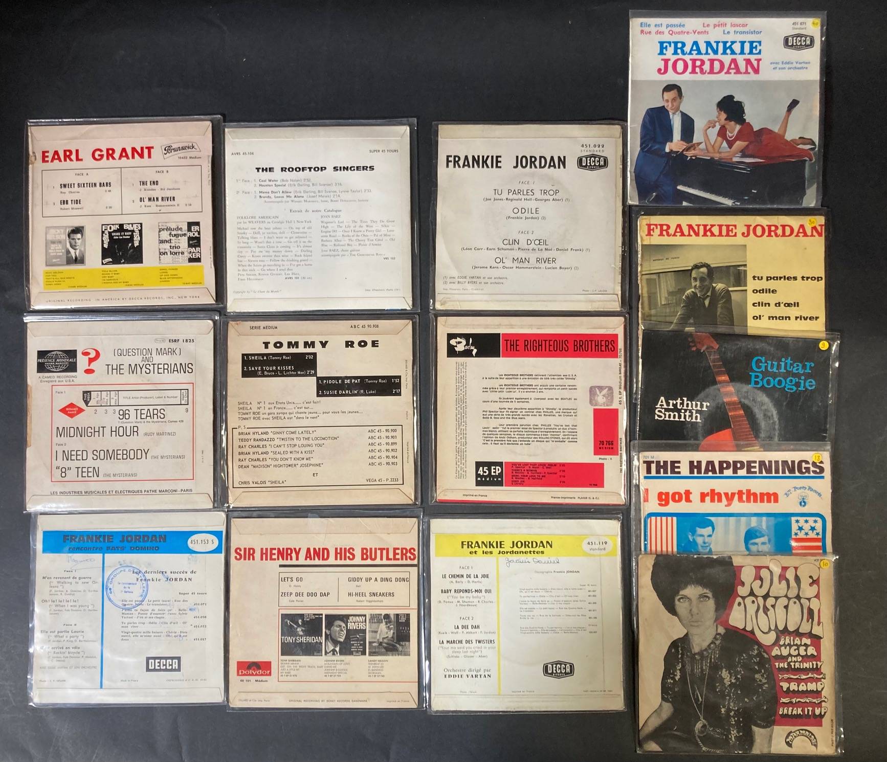 Lot de 14 x 45 tours de divers groupes : The ROOFTOP SINGERS, 96 TEARS, The HAPPENINGS, EARL GRANT, Julie DRICOLL, Arthur SMITH, Tommy ROE, The RIGHTEOUS BROTHERS,