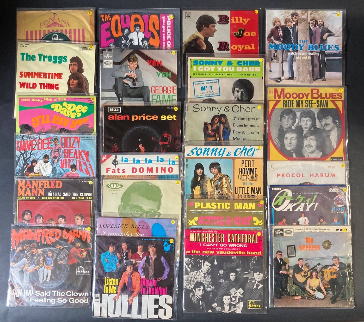 Lot de 34 x 45 tours de divers artistes ROCK : The NASHVILLE TEENS, The SEEKERS, PROCOL HARUM, The MOODY BLUES, WINCHESTER CATHEDRAL, The NEWBEATS, SONNY & CHER, Billy Joe ROYAL, The HONEYCOMBS, The HOLLIES, HERMAN'S HERMITS, MANFRED MAN...