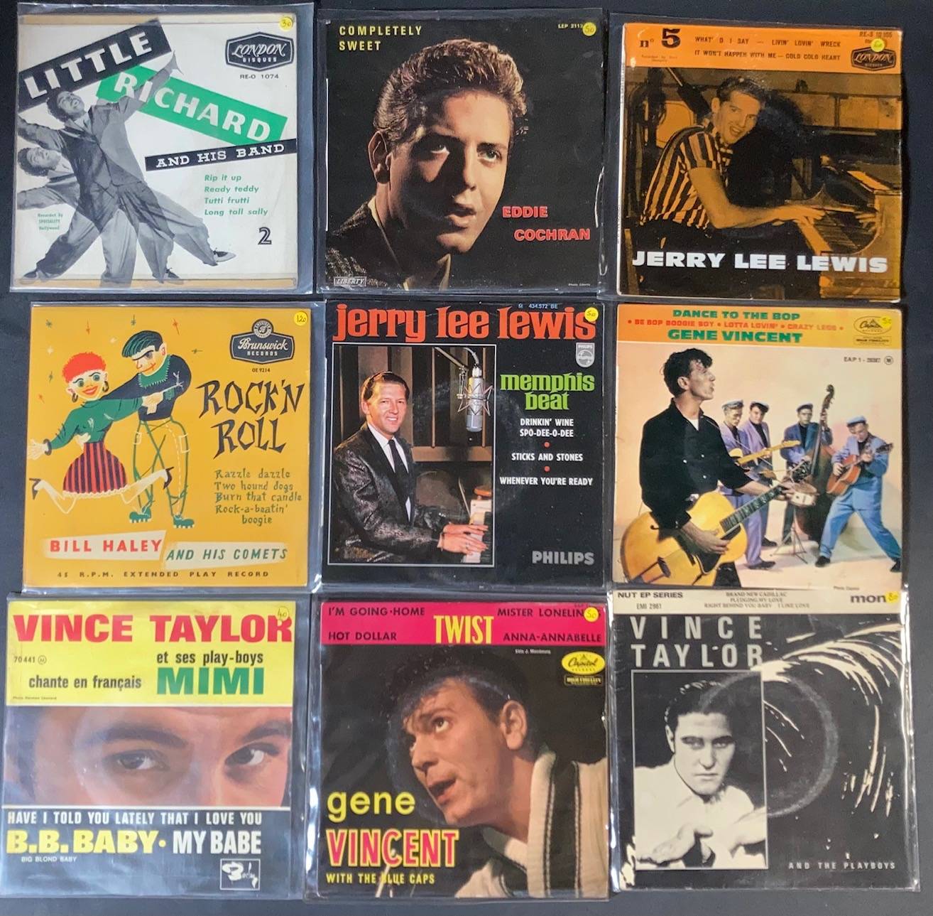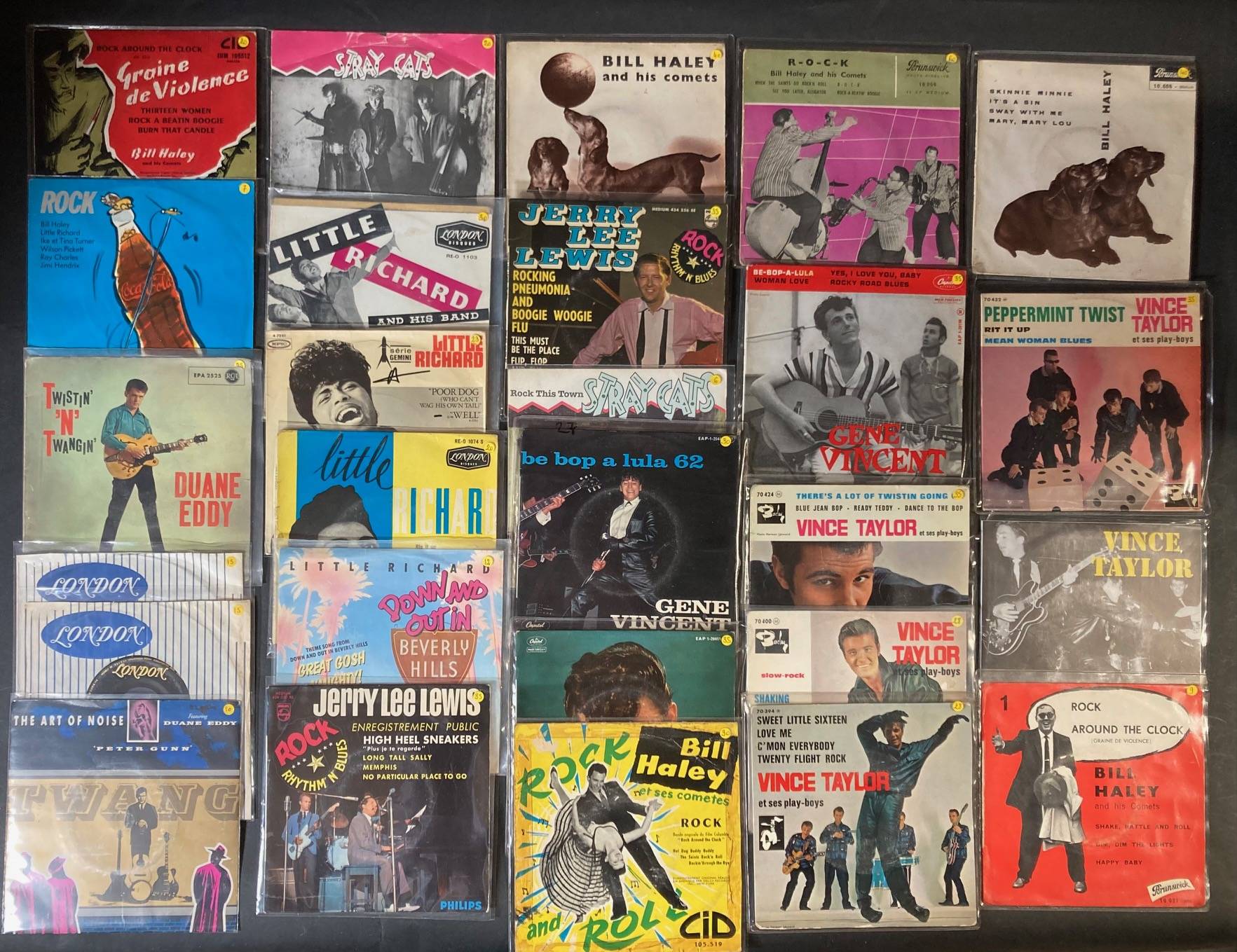 Lot de 36 x 45 tours de divers artistes : Bill HALEY, Vince TAYLOR, Gene VINCENT, STRAY CATS, Jerry LEE LEWIS, LITTLE RICHARD, Eddie COCHRAN...