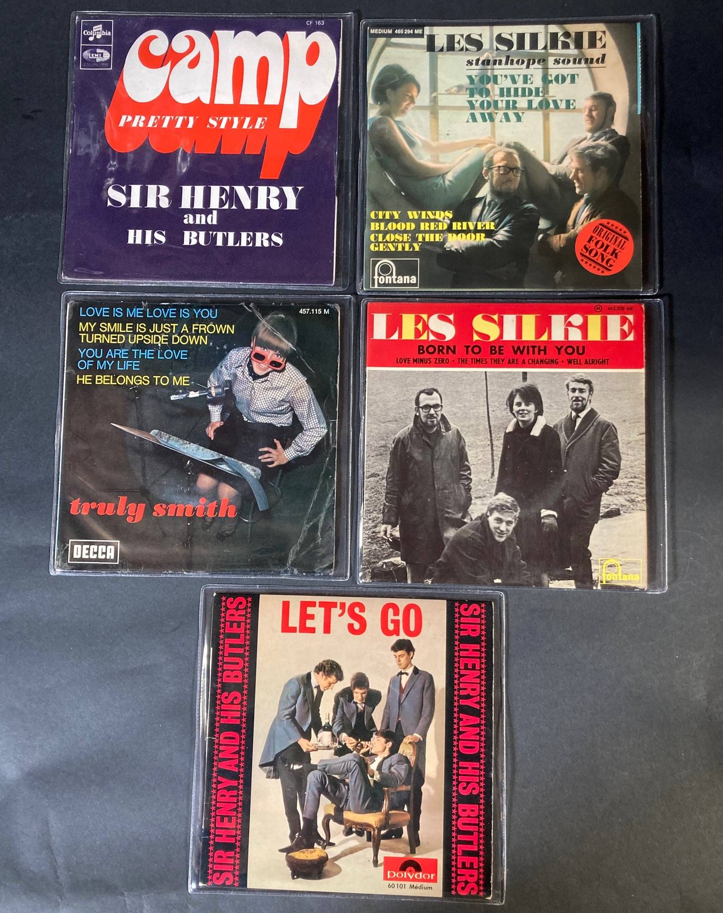 Lot de 5 X 45 tours de divers groupes : The SIKIE, TRULY SMITH, SIR HENRY AND HIS BUTLERS.