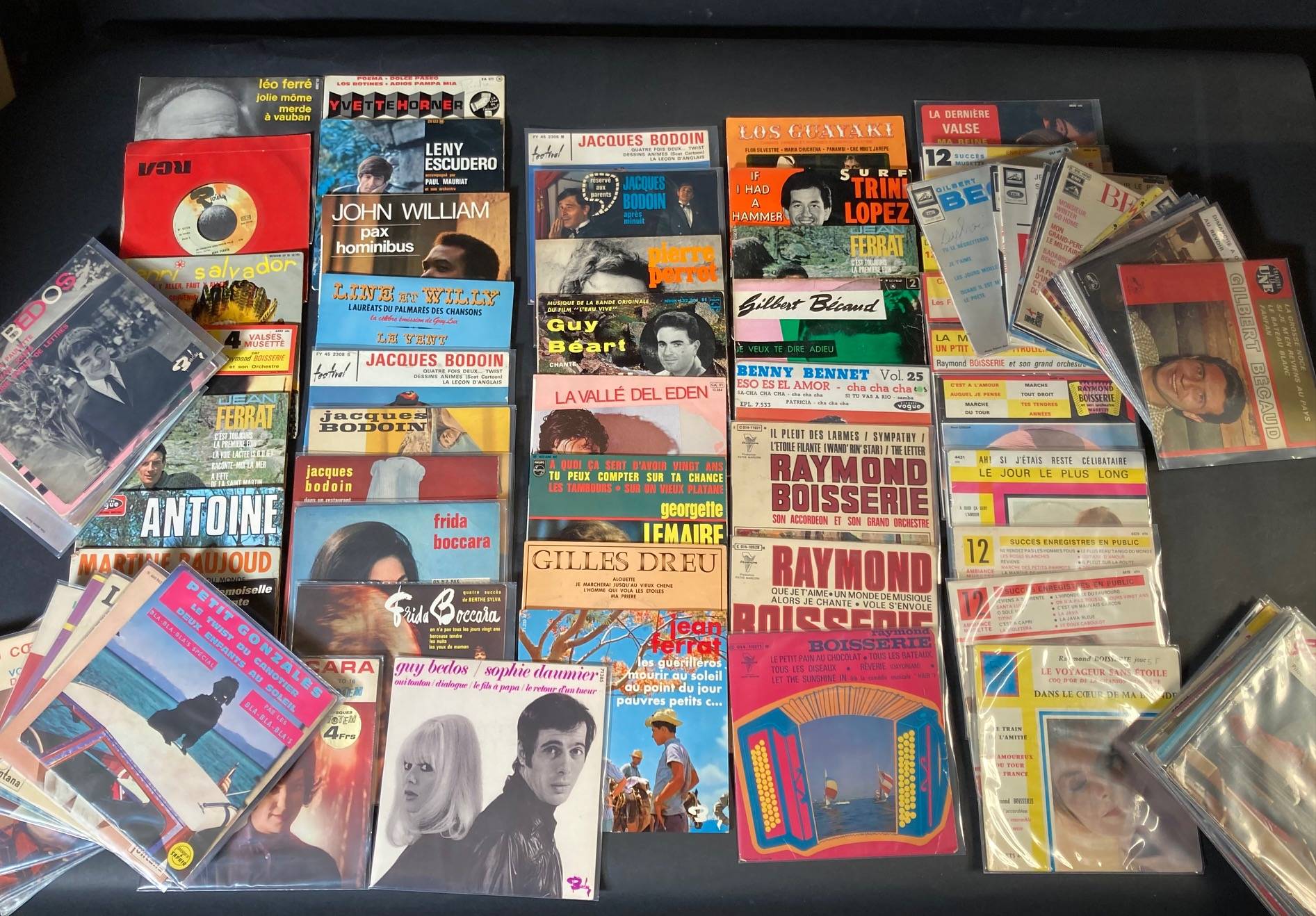 Un ensemble de 100, 45 tours de Gilbert BECAUD, Benny BENNET, Raymond BOISSERIE, Jacques BODOIN, Frida BOCCARA...