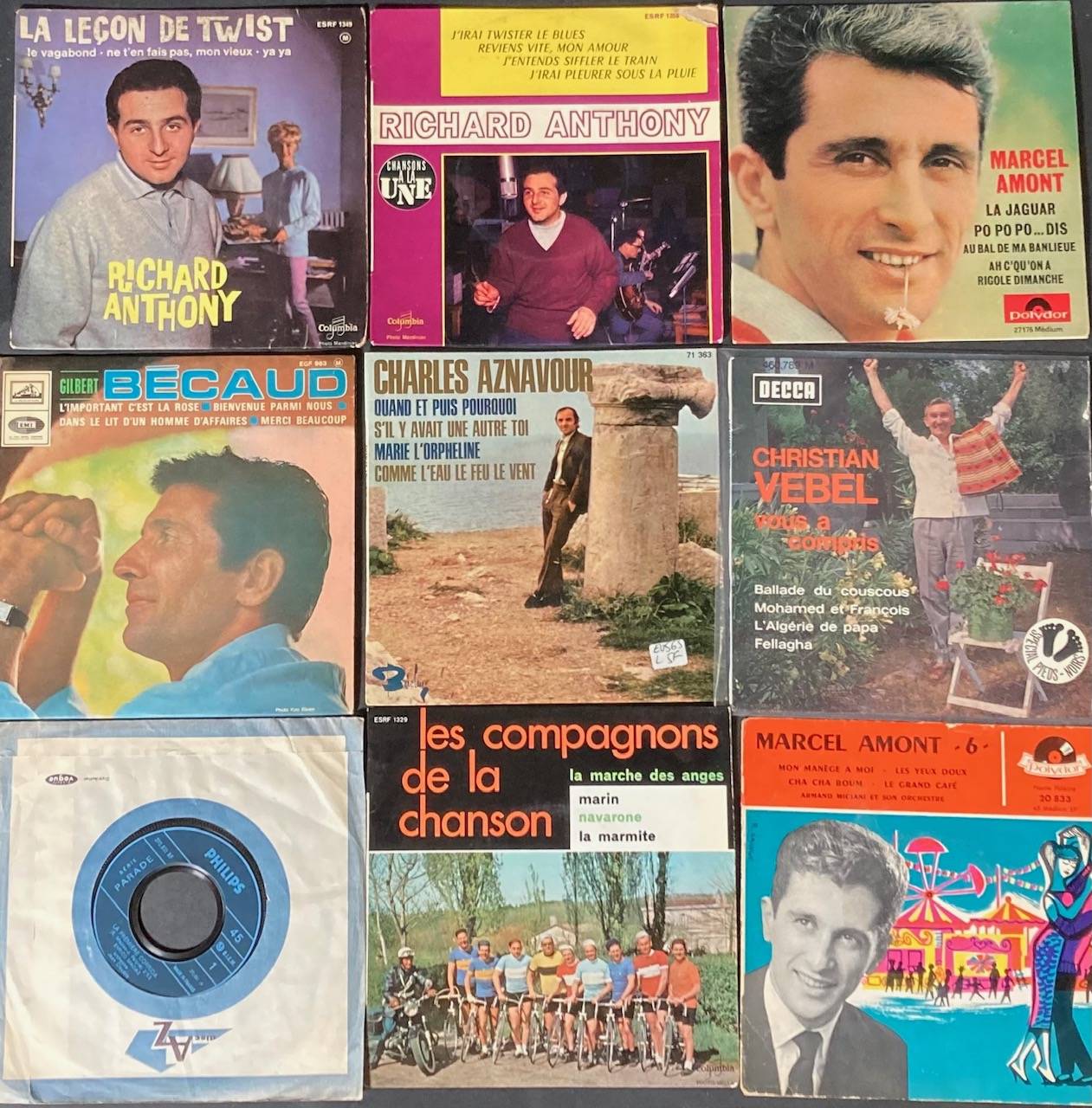 Lot de 100, 45 tours de divers artistes de variété Française : Christian VEBEL, Fernand RAYNAUD, Lucien LUPI, Georges MILTON, Marc ARYAN, Dominique DUSSAULT, René Louis LAFFORGUE, Juliette GRECO, Simone ALMA, Berthe SYLVA, Luis MARIANO, Pierre DIEUZEY...