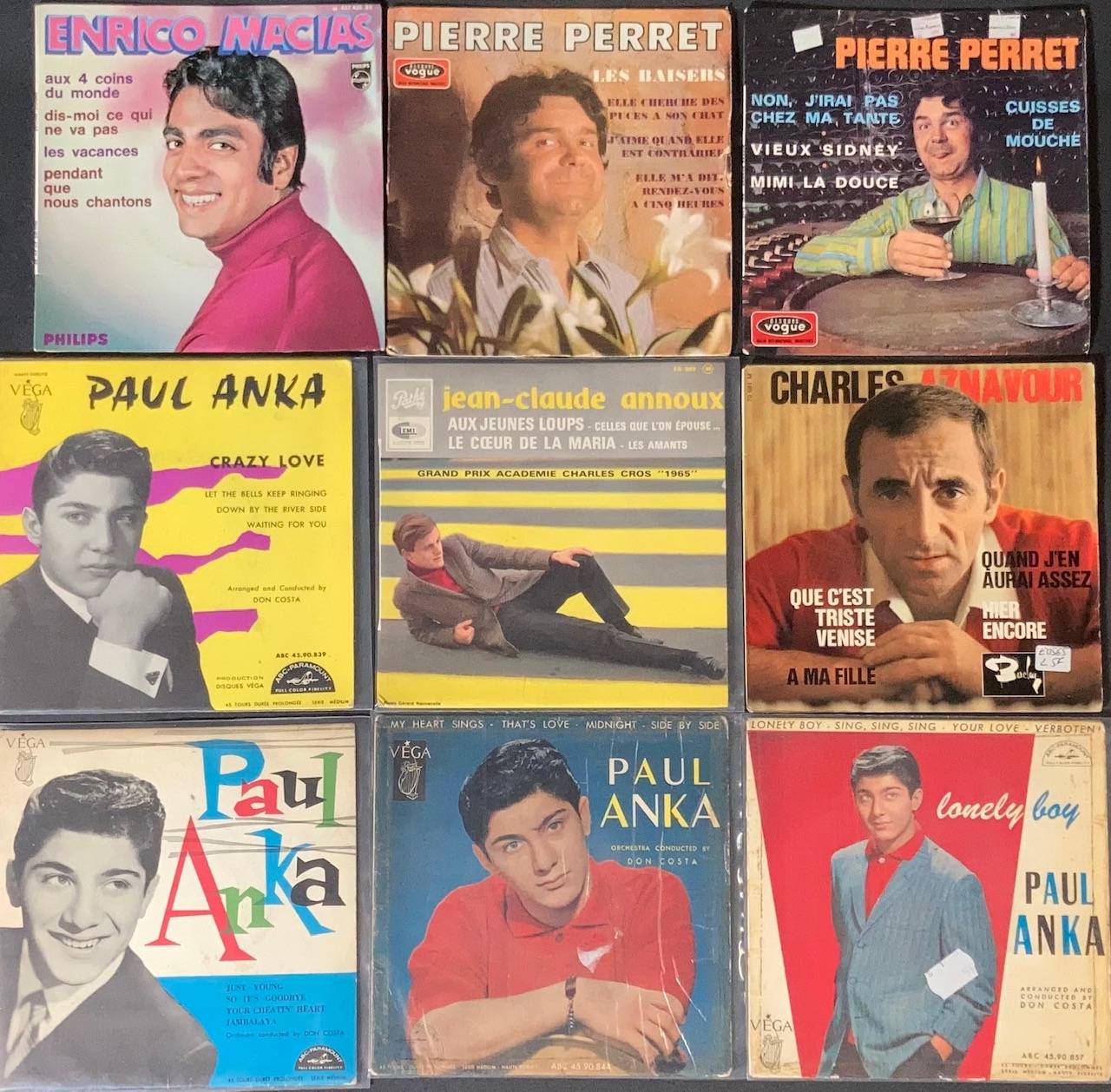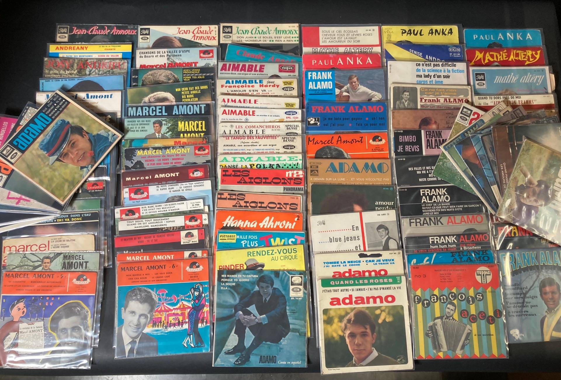 Ensemble de 100, 45 tours de divers artistes de Variété Française : Jean-claude ANNOUX, Paul ANKA, ANDREANY, Marcel AMONT, Frank ALAMO, ADAMO...