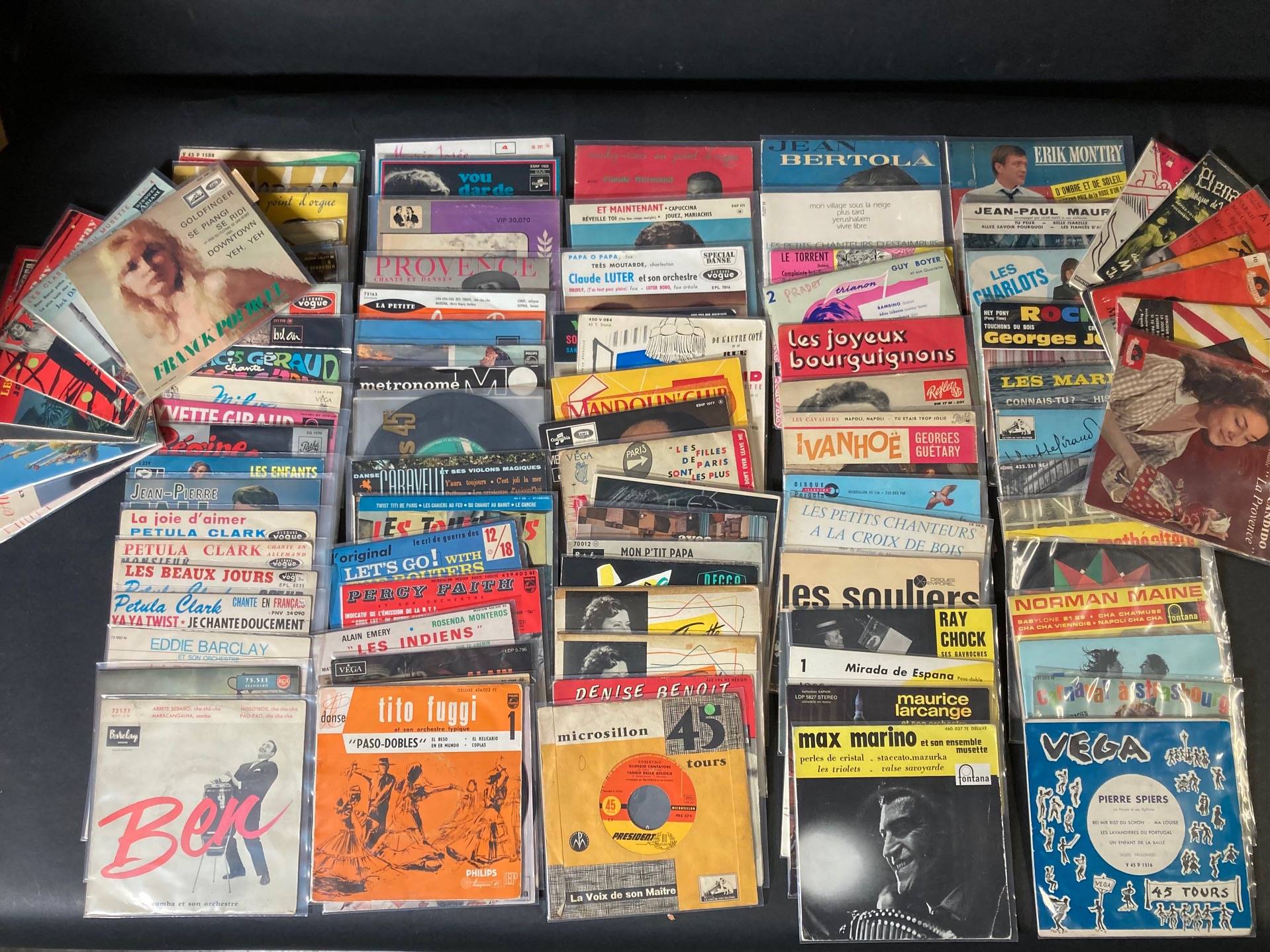 Lot de 108, 45 tours d'artistes de variété Française et divers : François DEGUELT, Alain BARRIERE, Line RENAUD, Pierre VASILIU, Eddie BARCLAY, James OLLIVIER, André DASSARY, Guy BOYER, Aimé BARELLI...