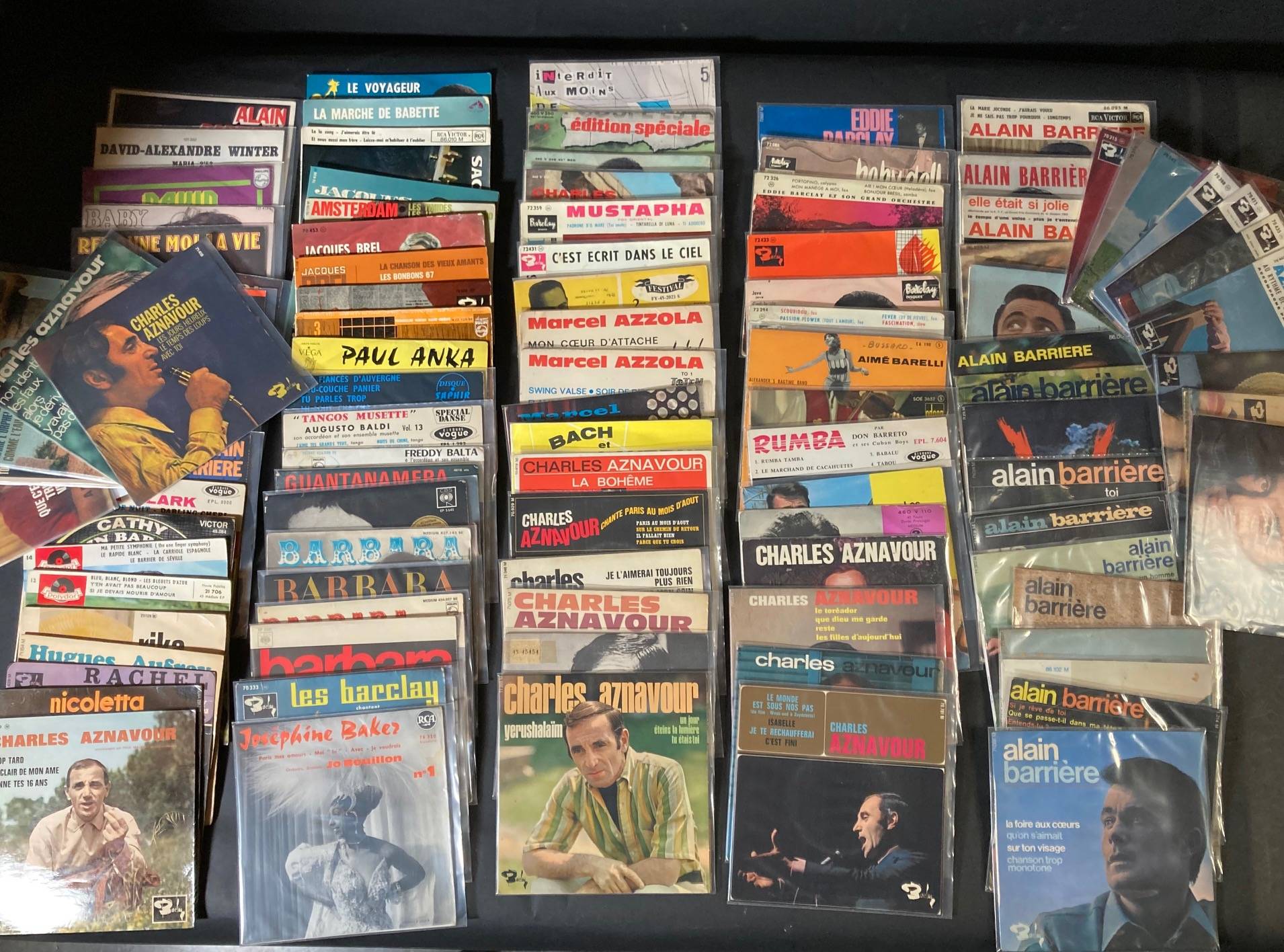 Ensemble de 104, 45 tours d'artistes de Variété Française et divers... Sacha DISTEL, Gilbert BECAUD, RACHEL, Alain BARRIERE, Julie PIETRI, BABY DOLL, Eddie BARCLAY, LES BACLAY, Freddy BALTA, Charles AZNAVOUR...