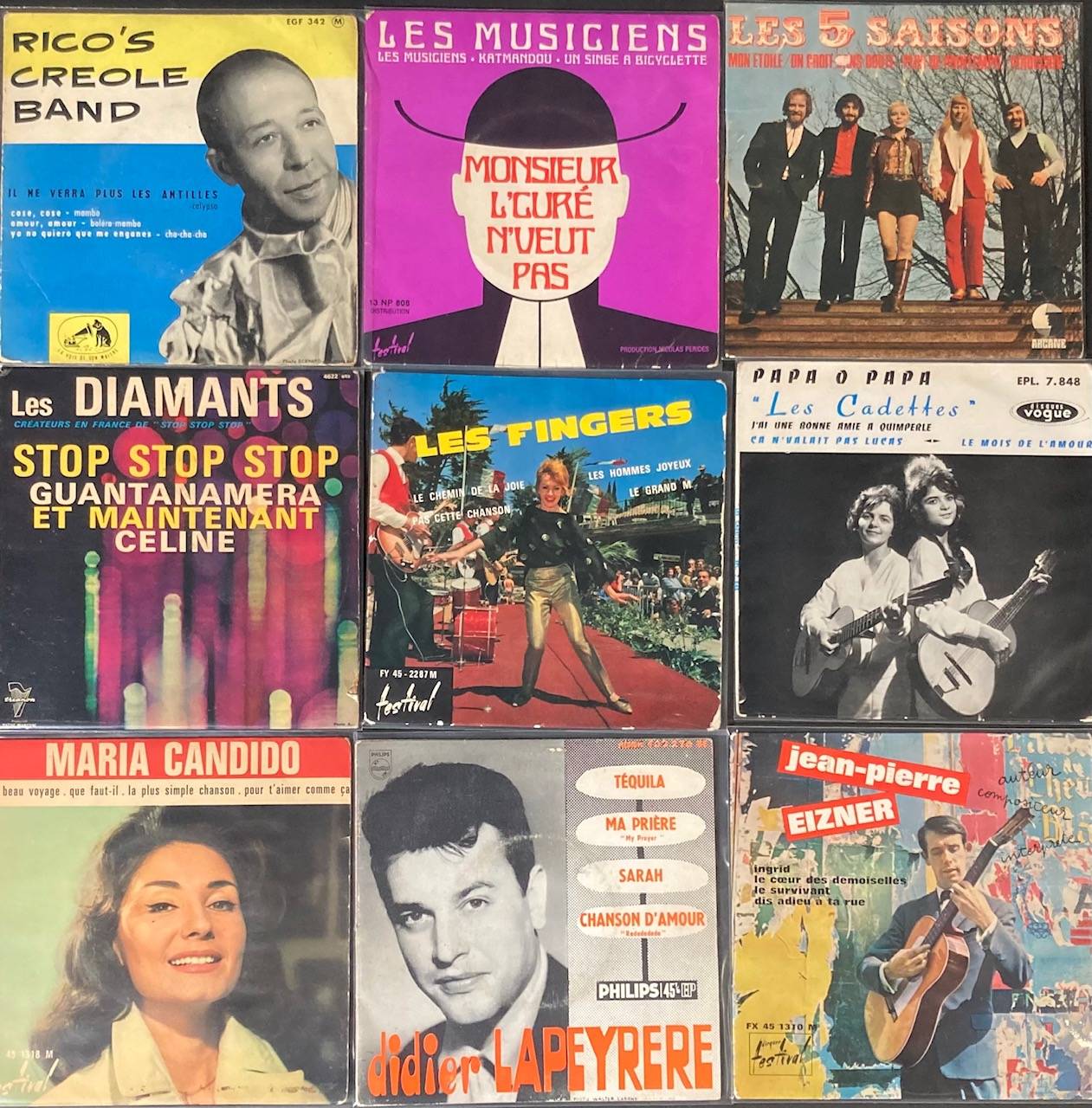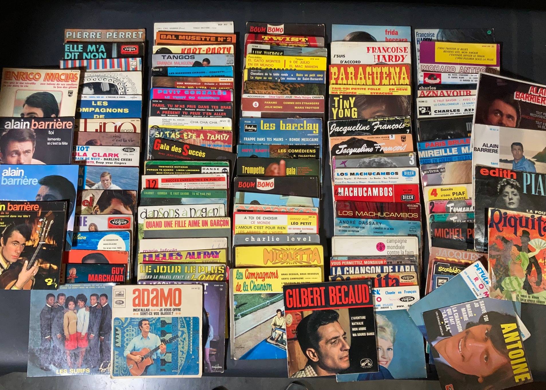 Lot de 110, 45 tours de Variété Française et divers: RICO'S CREOLE BAND, Les 5 SAISONS, Hugues AUFRAY, Edith PIAF, Michel PAJE, Sylvie VARTAN, Frida BOCCARA, BOUM BOMO...