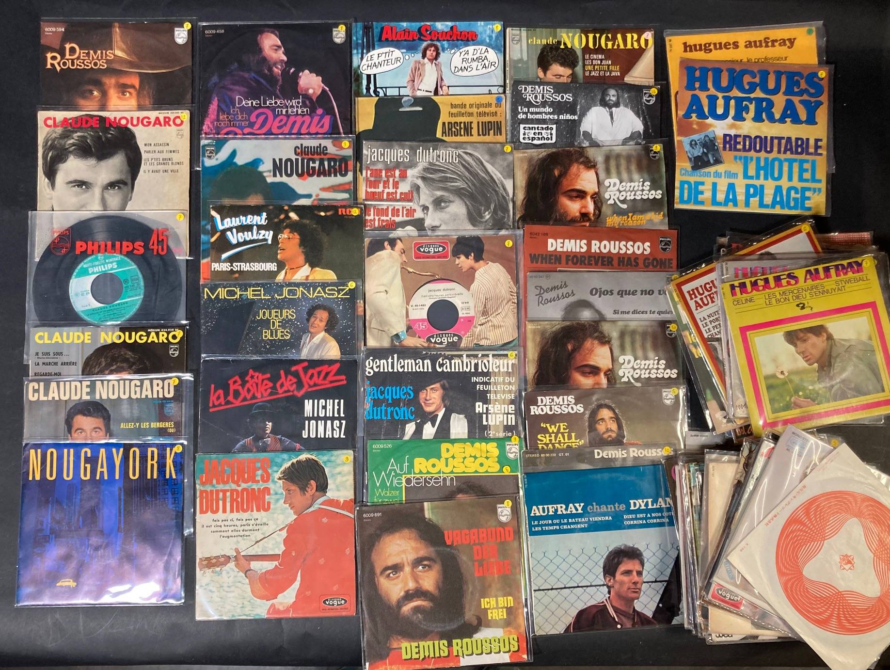 Ensemble de 75 x 45 tours de divers chanteurs de variété Française : Michel JONASZ, VOULZY, SOUCHON, NOUGARO, APRHODITE'S CHILD, Demis ROUSSOS, AUFRAY, Nico FERRER, Julien CLERC, CHRISTOPHE, Jacques DUTRONC, ANTOINE, Les charlots...