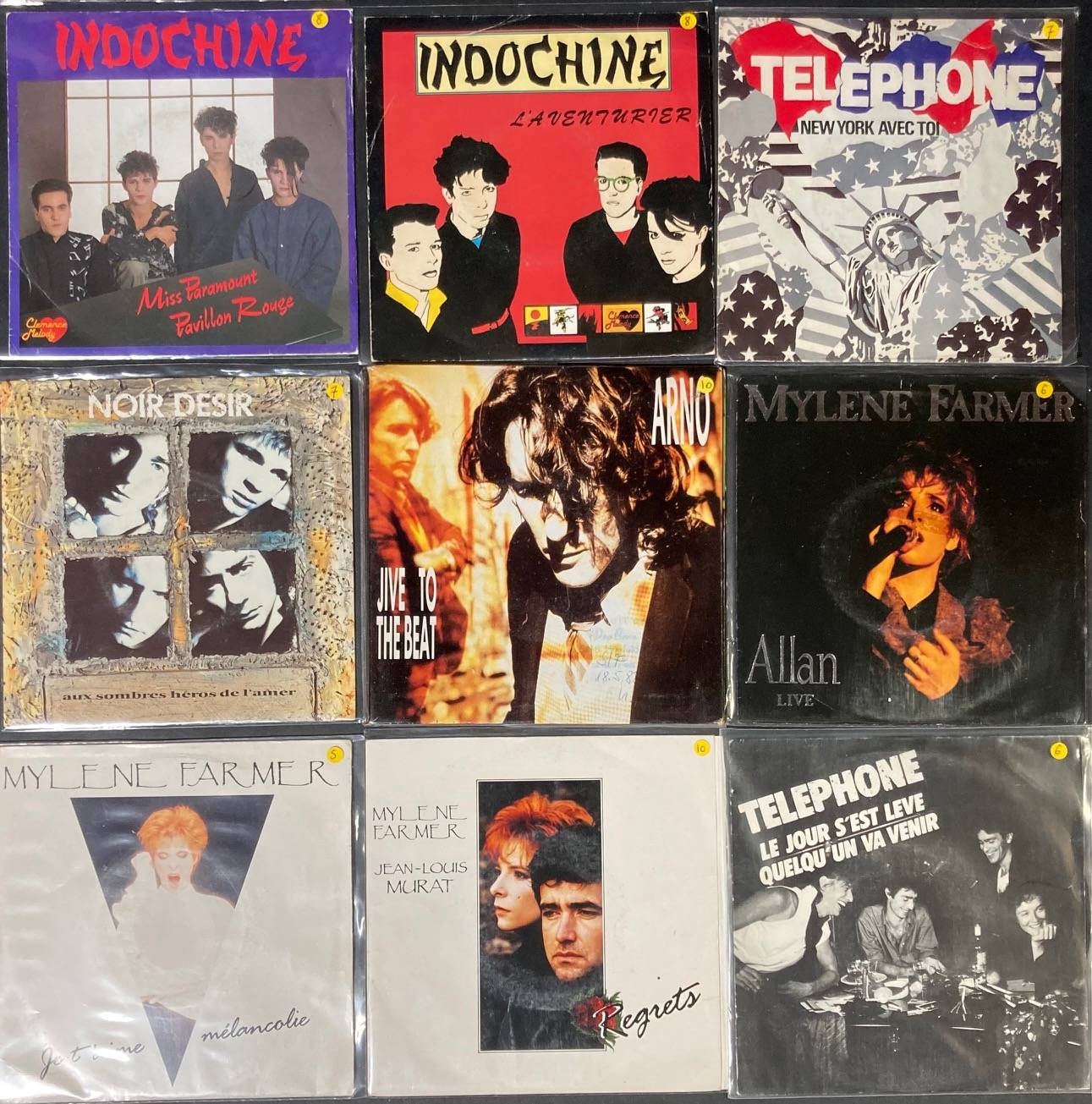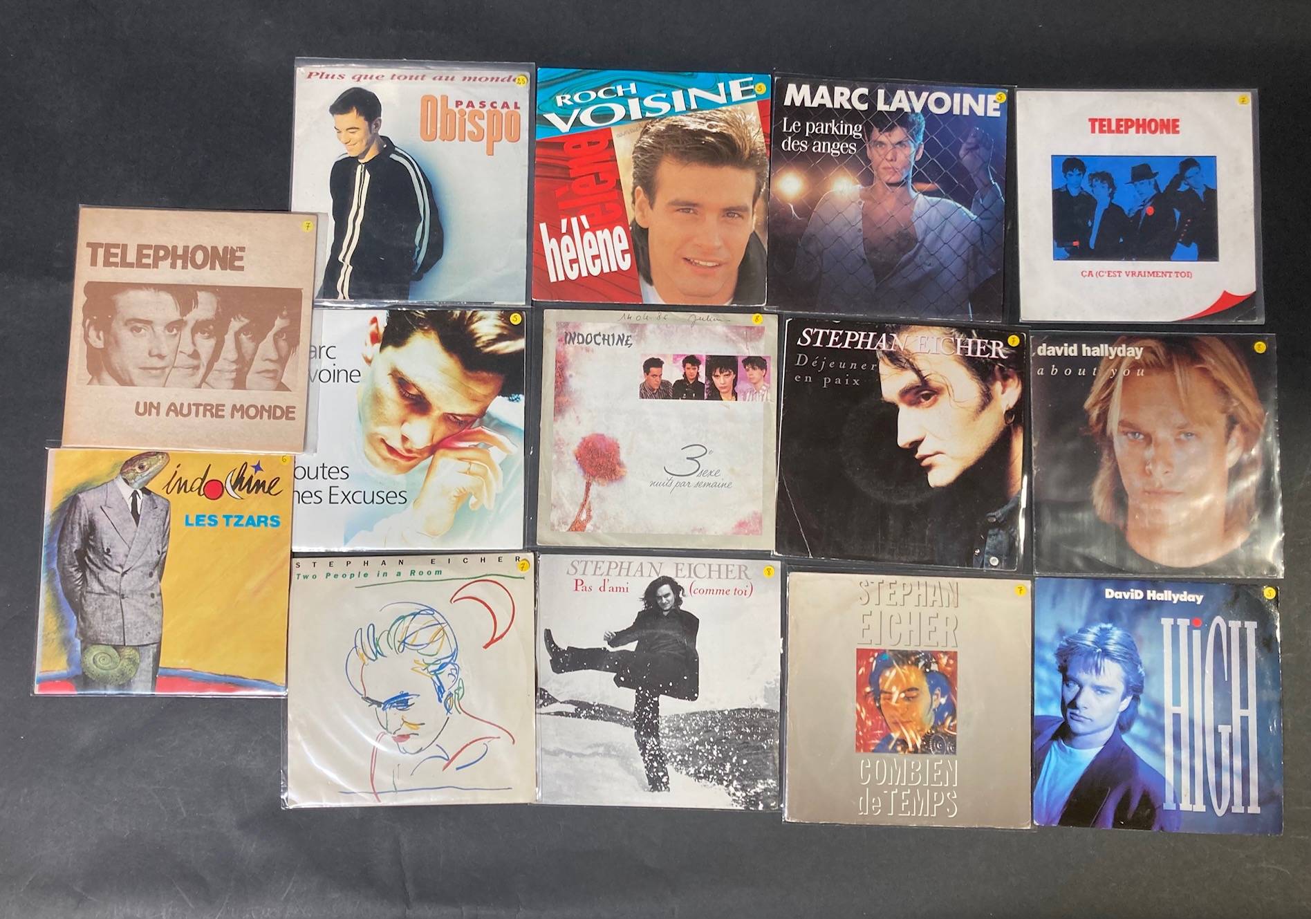 Lot de 22 x 45 tours de divers groupes Français : INDOCHINE, NOIR DESIR, TELEPHONE, ARNO, Mylène FARMER, David HALLYDAY, Stephan EICHER, Marc LAVOINE, OBISPO, Roch VOISINE...
