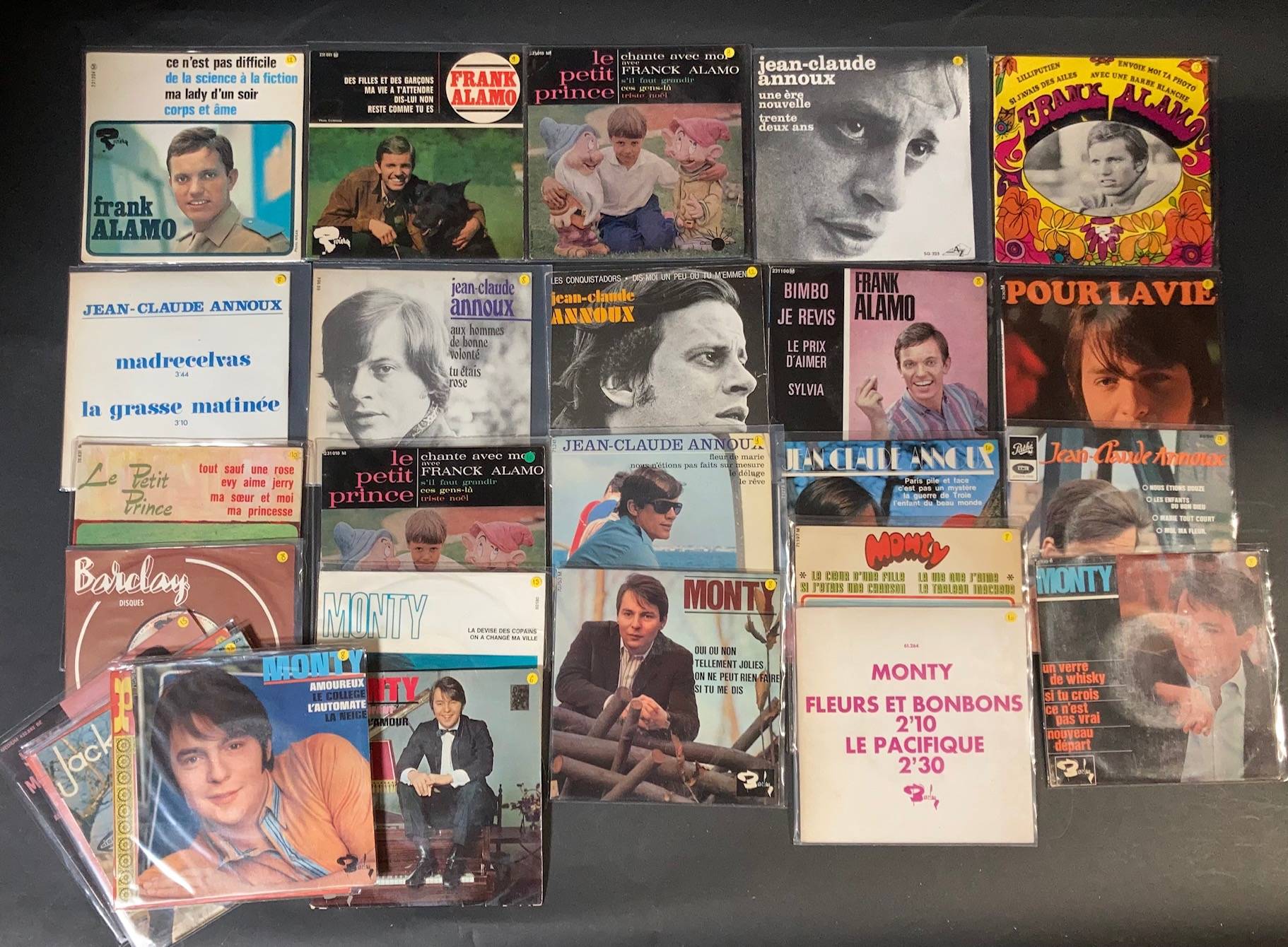 Lot de 37 x 45 tours de divers chanteurs Yeyes / Années 60 : Jean-Claude ARNOUX, Frank ALAMO, Jacky MOULIERE, PARAGUENA, MONTY, Le petit prince...
