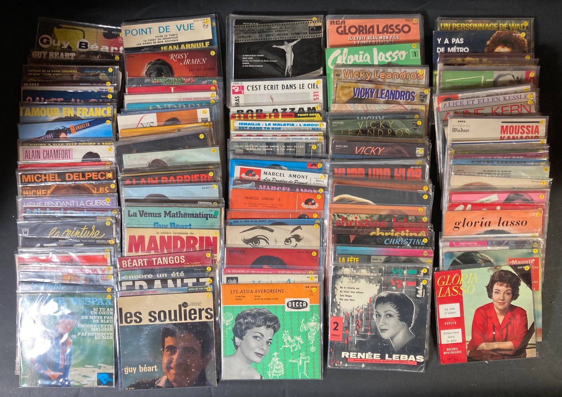 lot de 168 x 45 tours de divers artistes : MASSOULIER, Bob ASKLOF, ARIELLE, Les FRERES JACQUES, Olivier DESPAX, MANSET, DELPECH, JACNO, CHAMFORT...